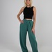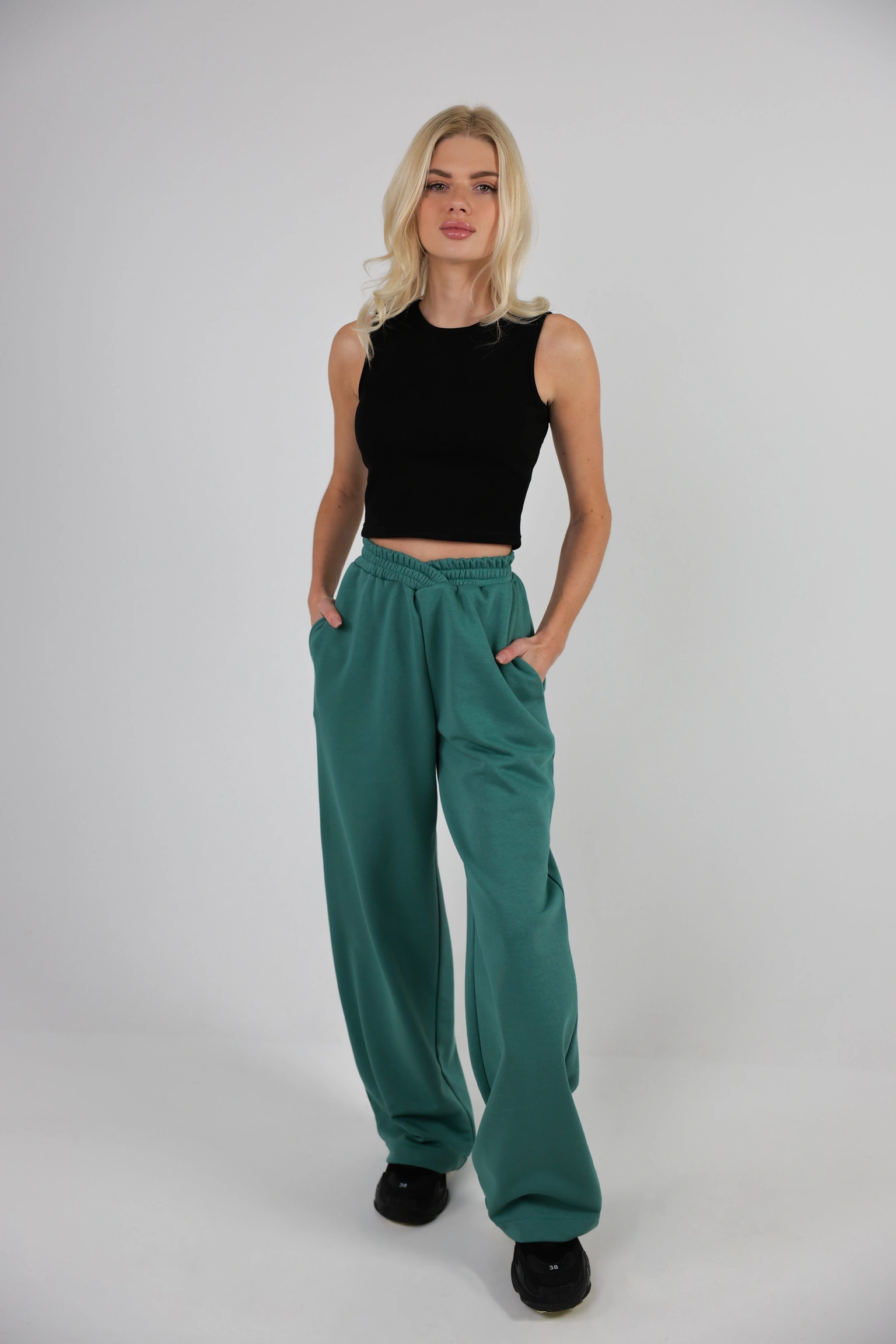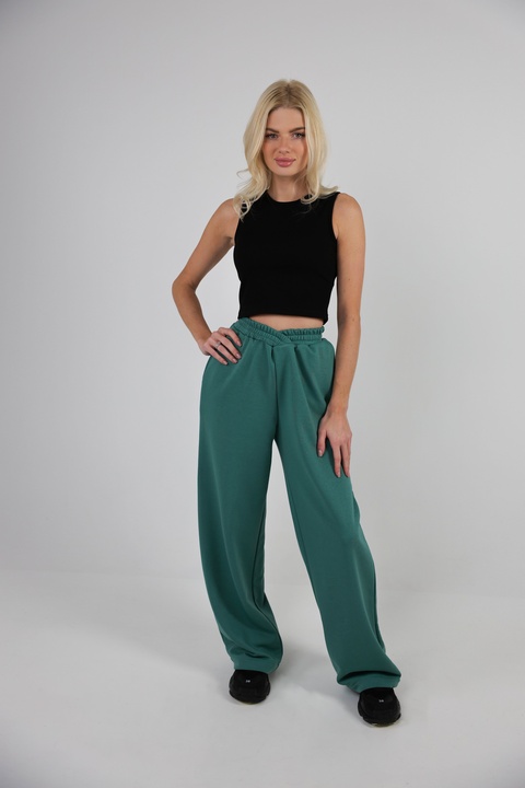 Крій — вільний прямий, із широкою штанкою: нічого не облягає, не «чіпляється» за стегна, не сковує крок. Є глибокі кишені (нормальні, не декоративні), а пояс на резинці адаптується під фігуру.