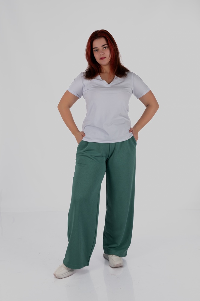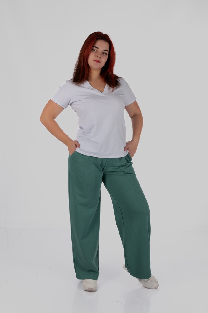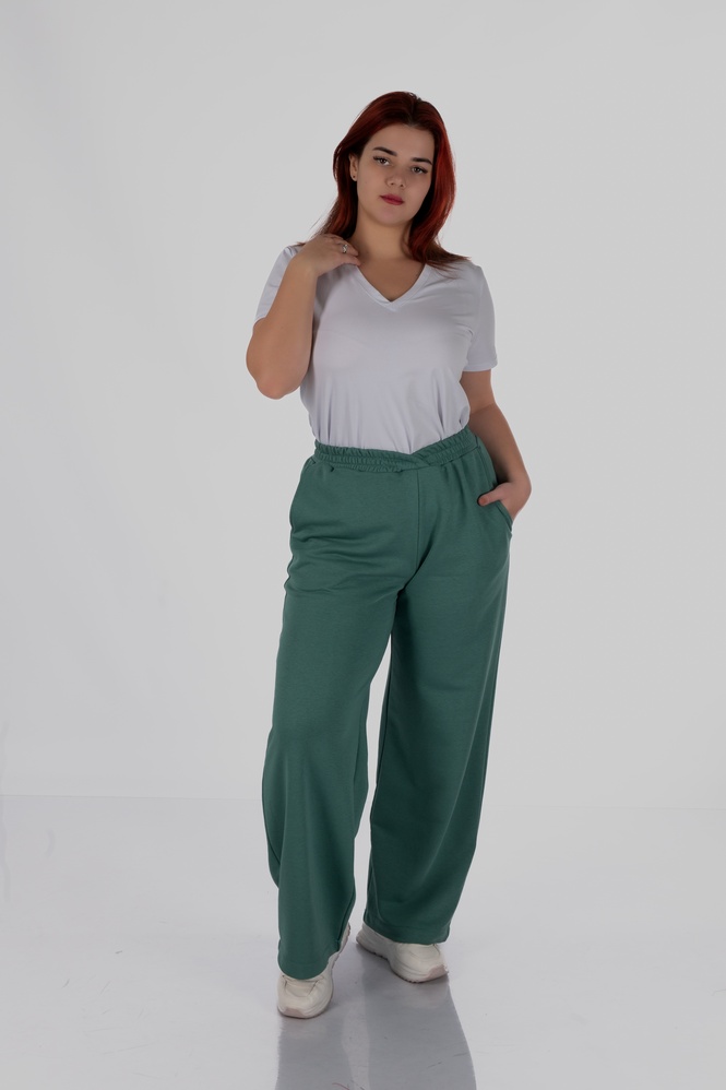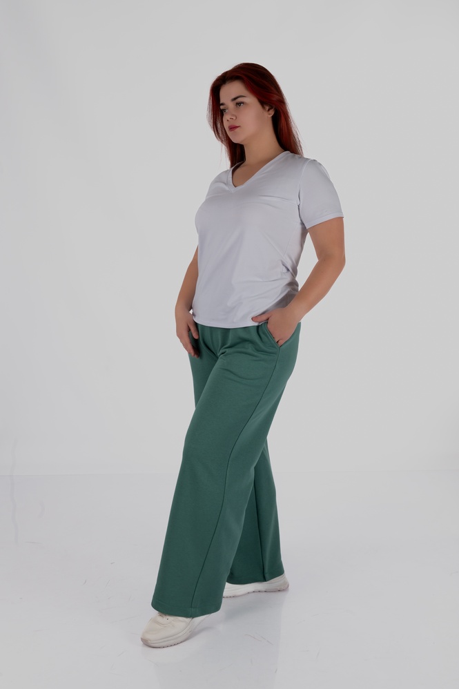 Посадка у моделі комфортно висока. Пояс еластичний і добре адаптується до фігури, не створює жорсткого тиску в зоні живота та не сповзає під час руху. Це особливо важливо для plus size фігури, де правильна посадка визначає, наскільки річ буде зручною протягом дня.