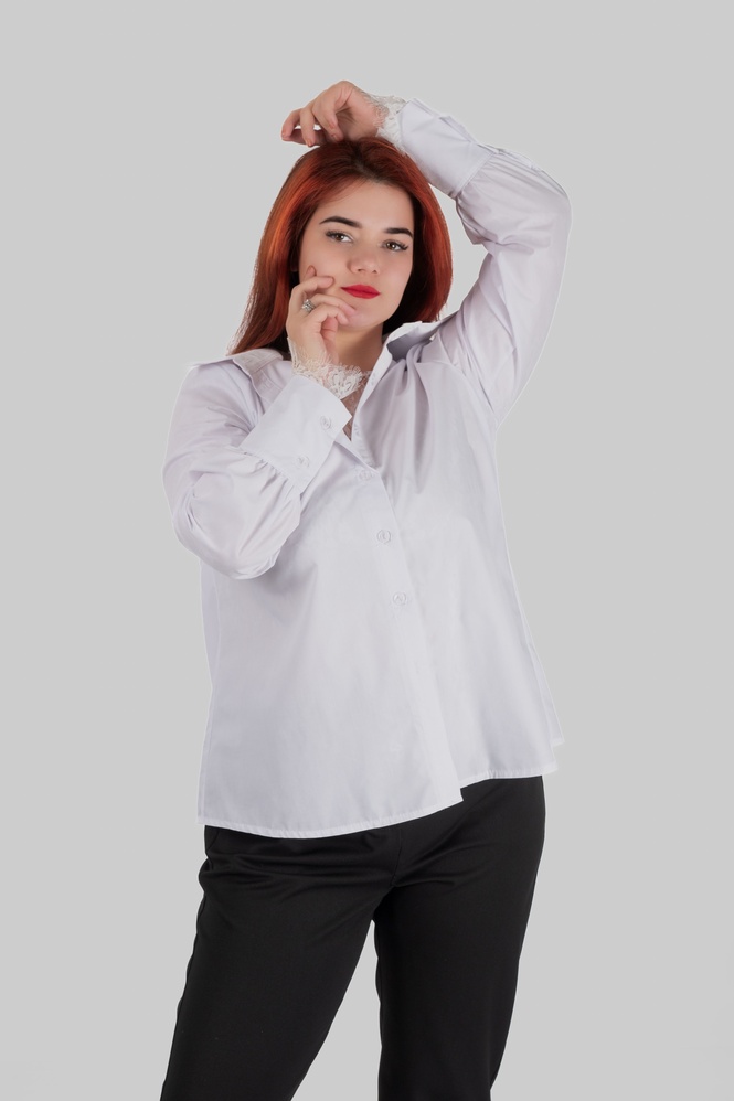 Тканина — бавовняний поплін (100% бавовна, Туреччина). Поплін має приємну гладку поверхню, добре пропускає повітря та тримає форму — сорочка виглядає зібрано навіть у простих комплектах. Еластичності немає, тому посадка має бути комфортною по грудях і плечах.