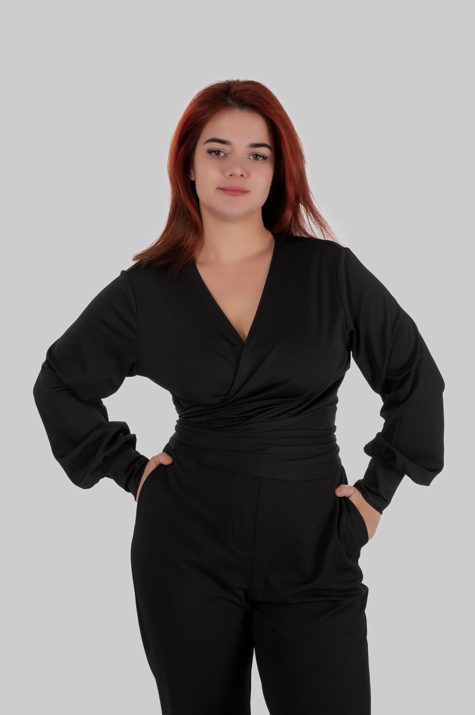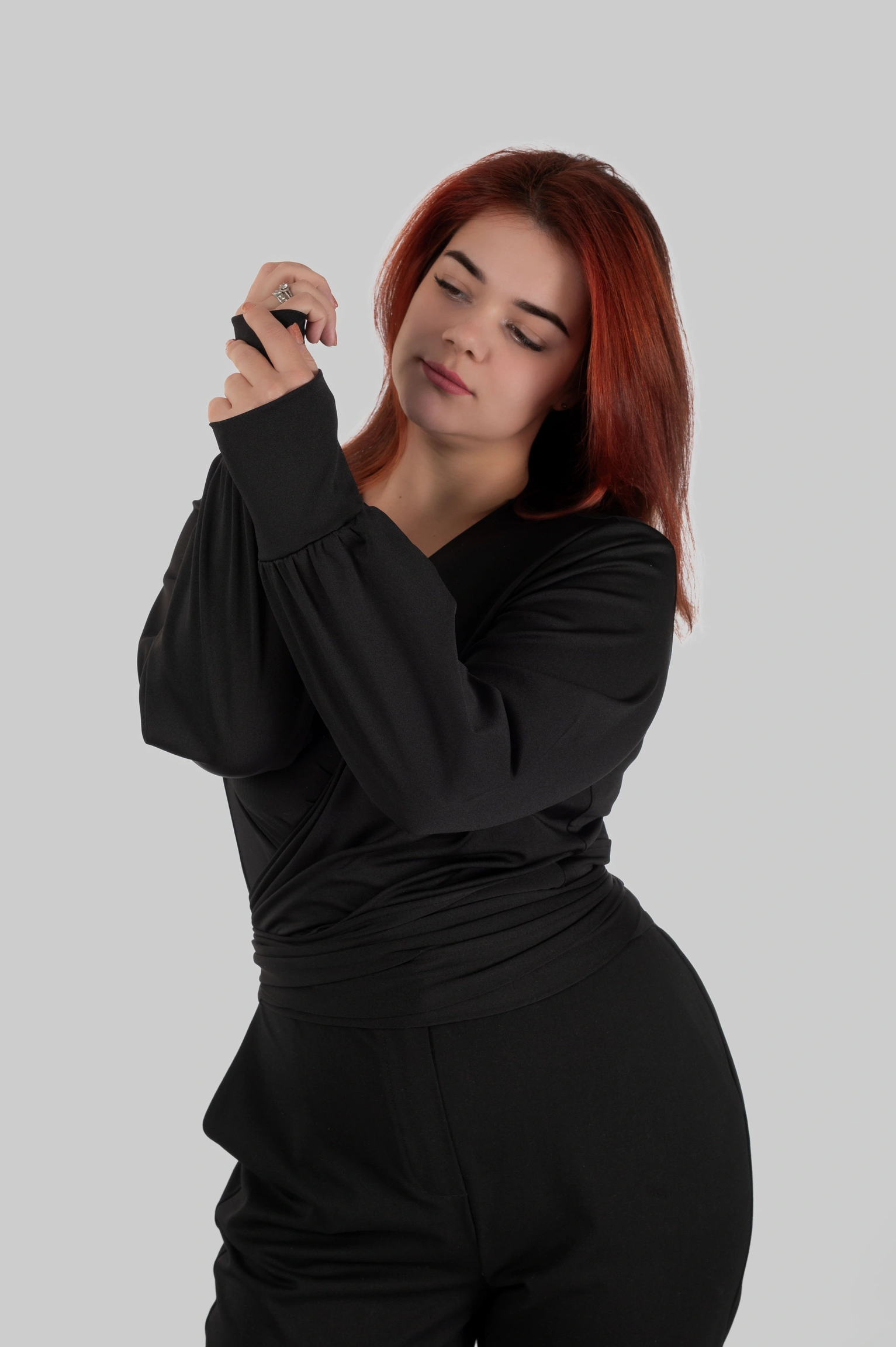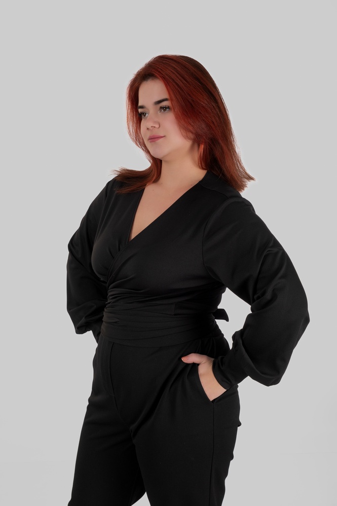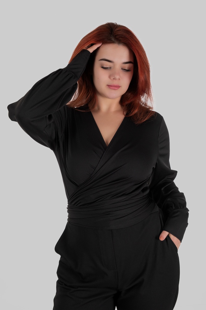 Конструкція запаху дозволяє легко регулювати посадку і адаптувати блузу під різні пропорції фігури.