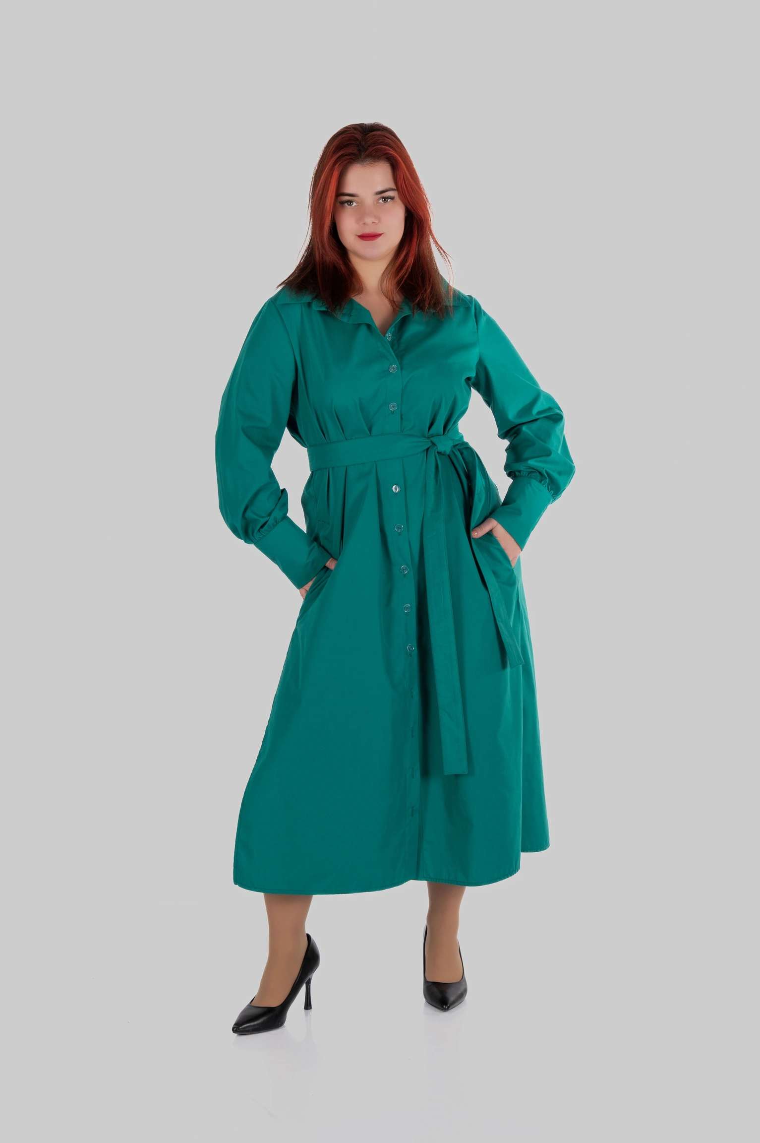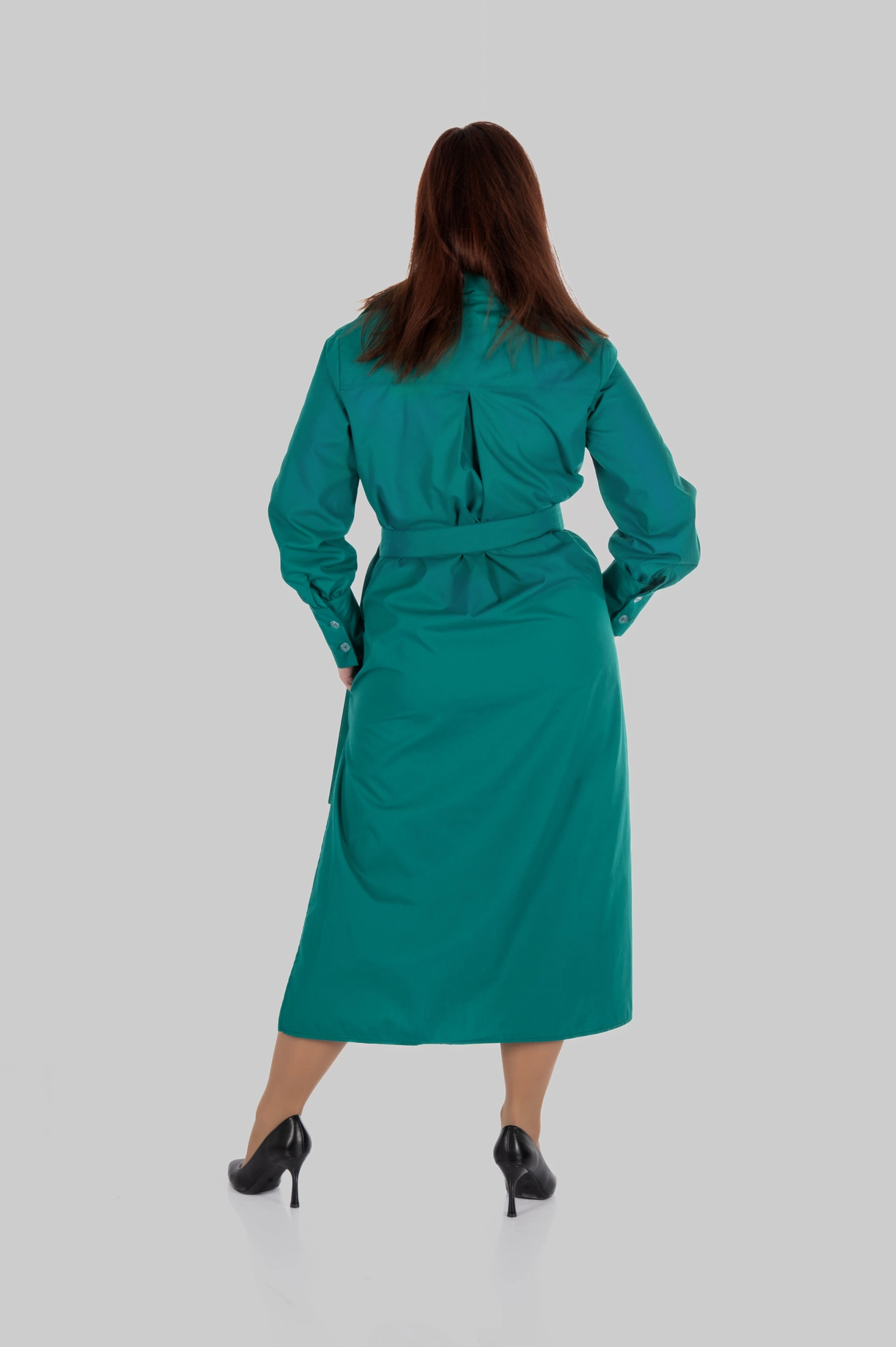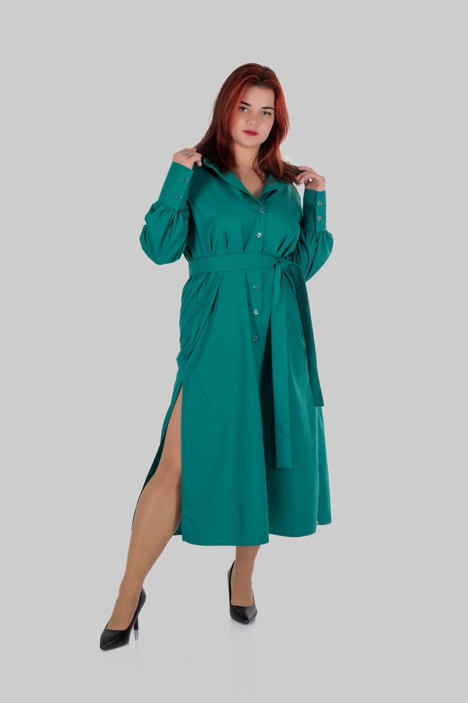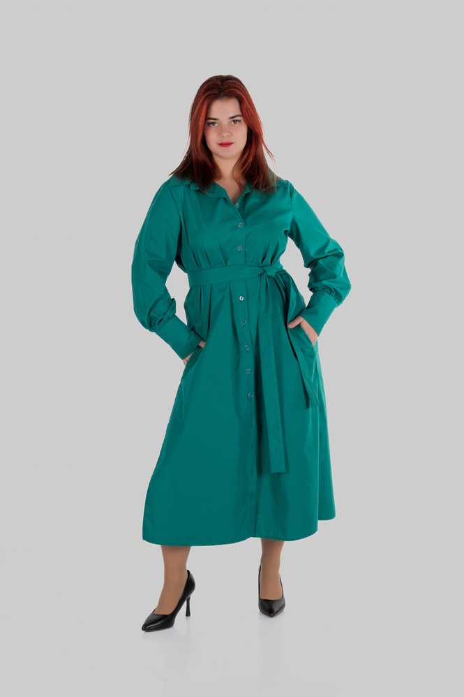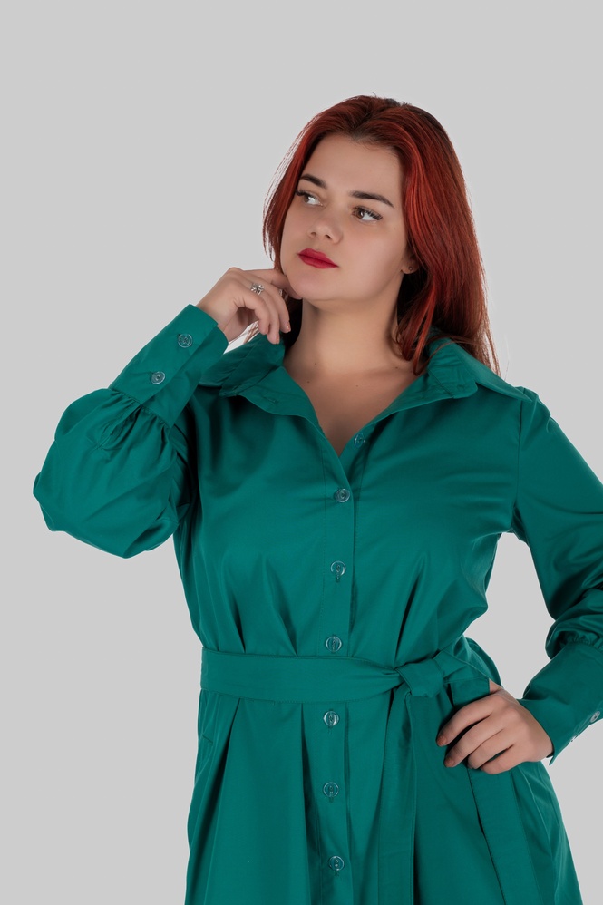 Сукня-сорочка має подовжений силует та комфортну посадку. Завдяки поясу модель можна носити як з акцентом на талії, так і у більш вільному силуеті.