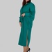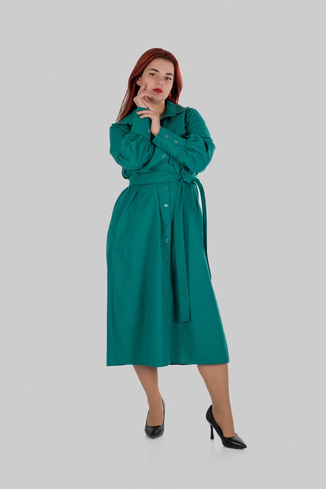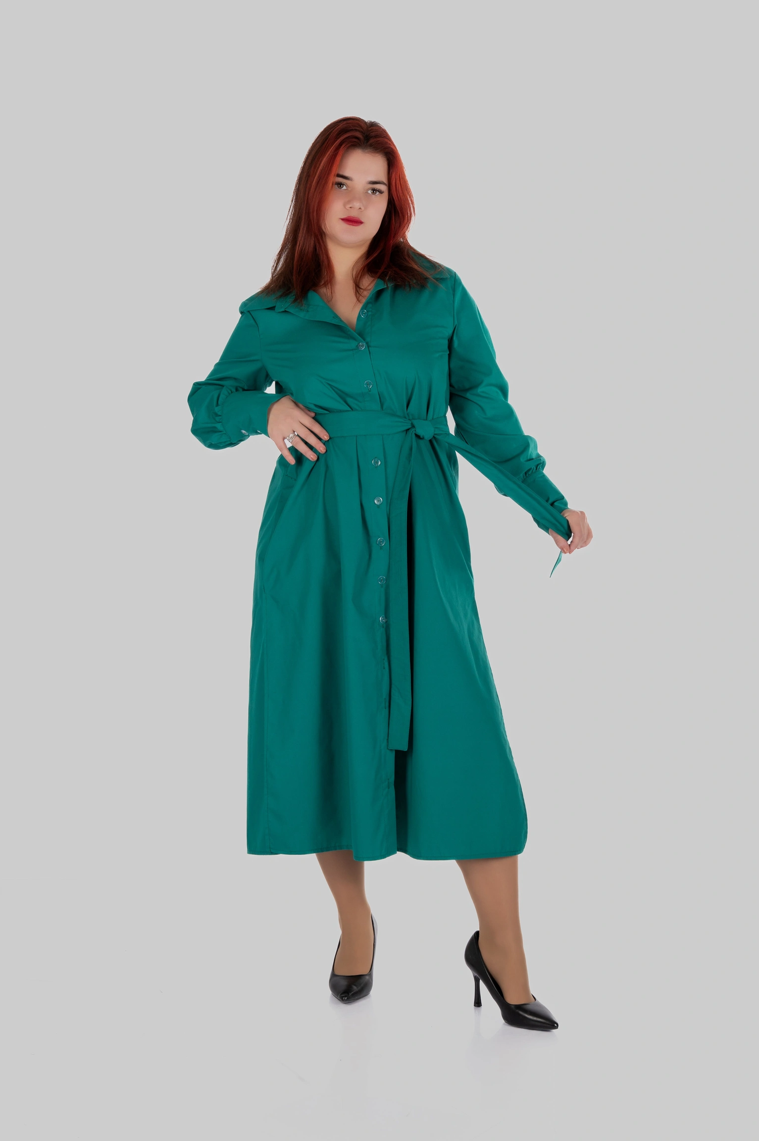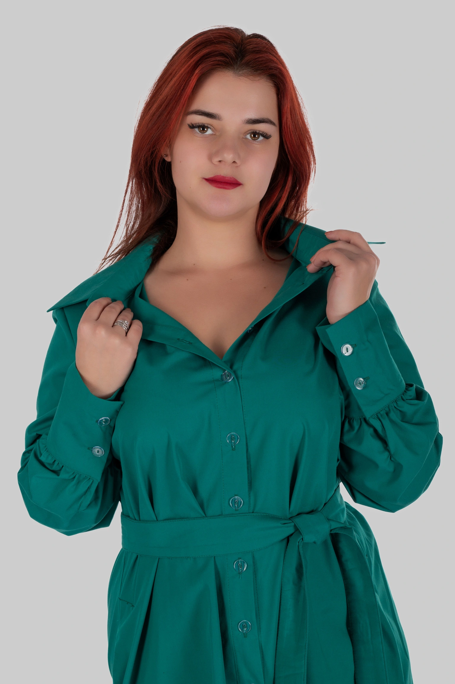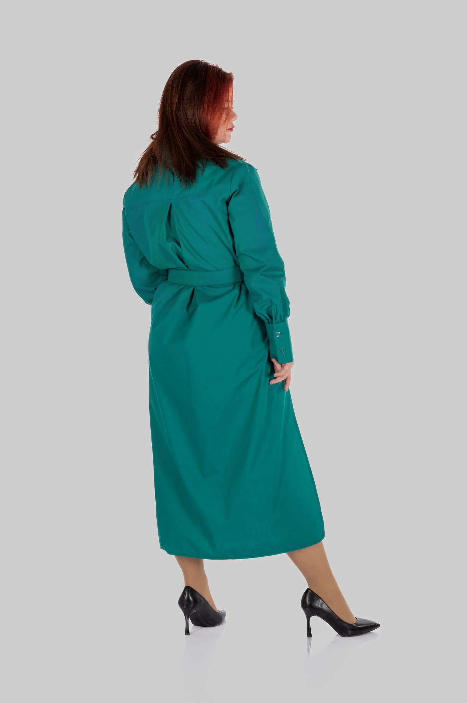 Сукня-сорочка має подовжений силует та комфортну посадку. Завдяки поясу модель можна носити як з акцентом на талії, так і у більш вільному силуеті.