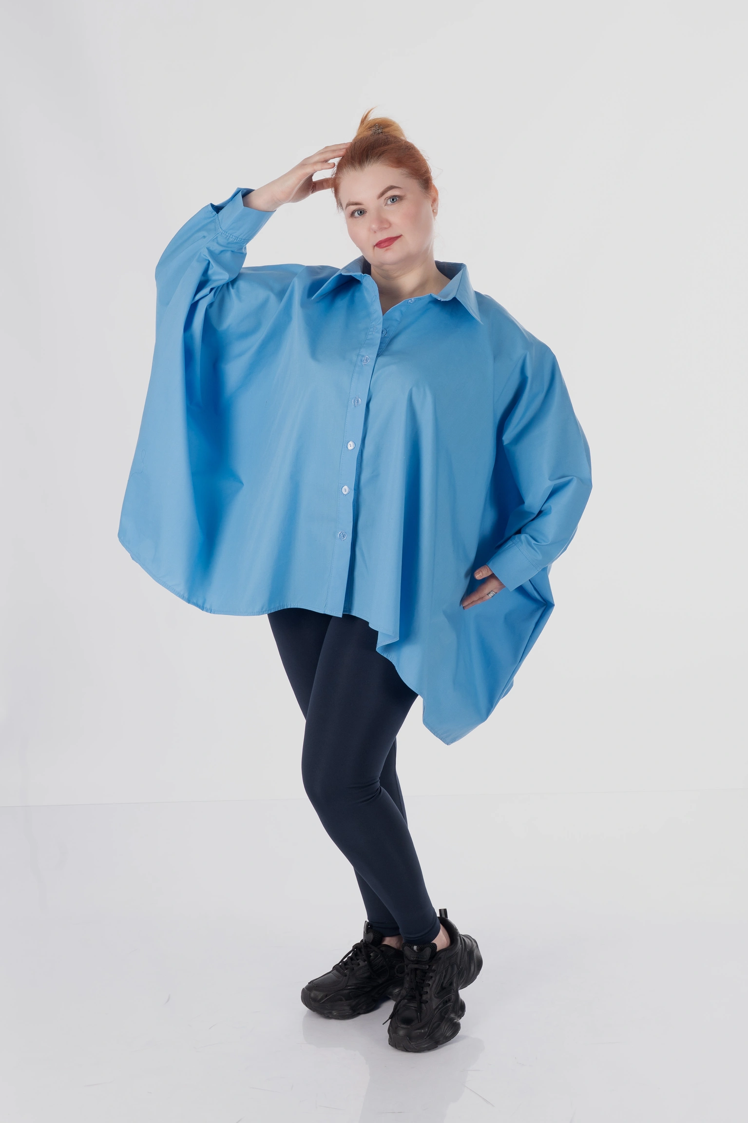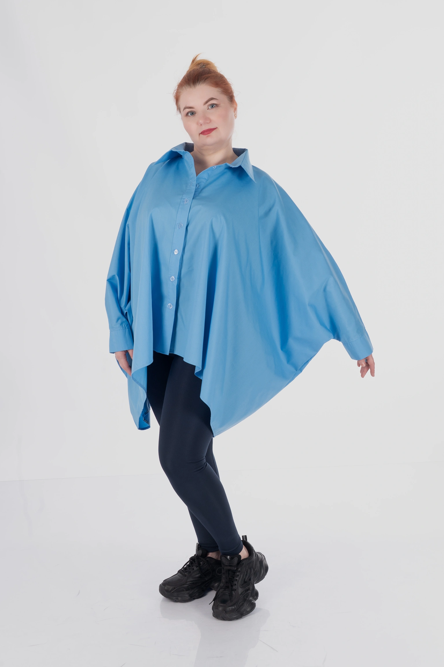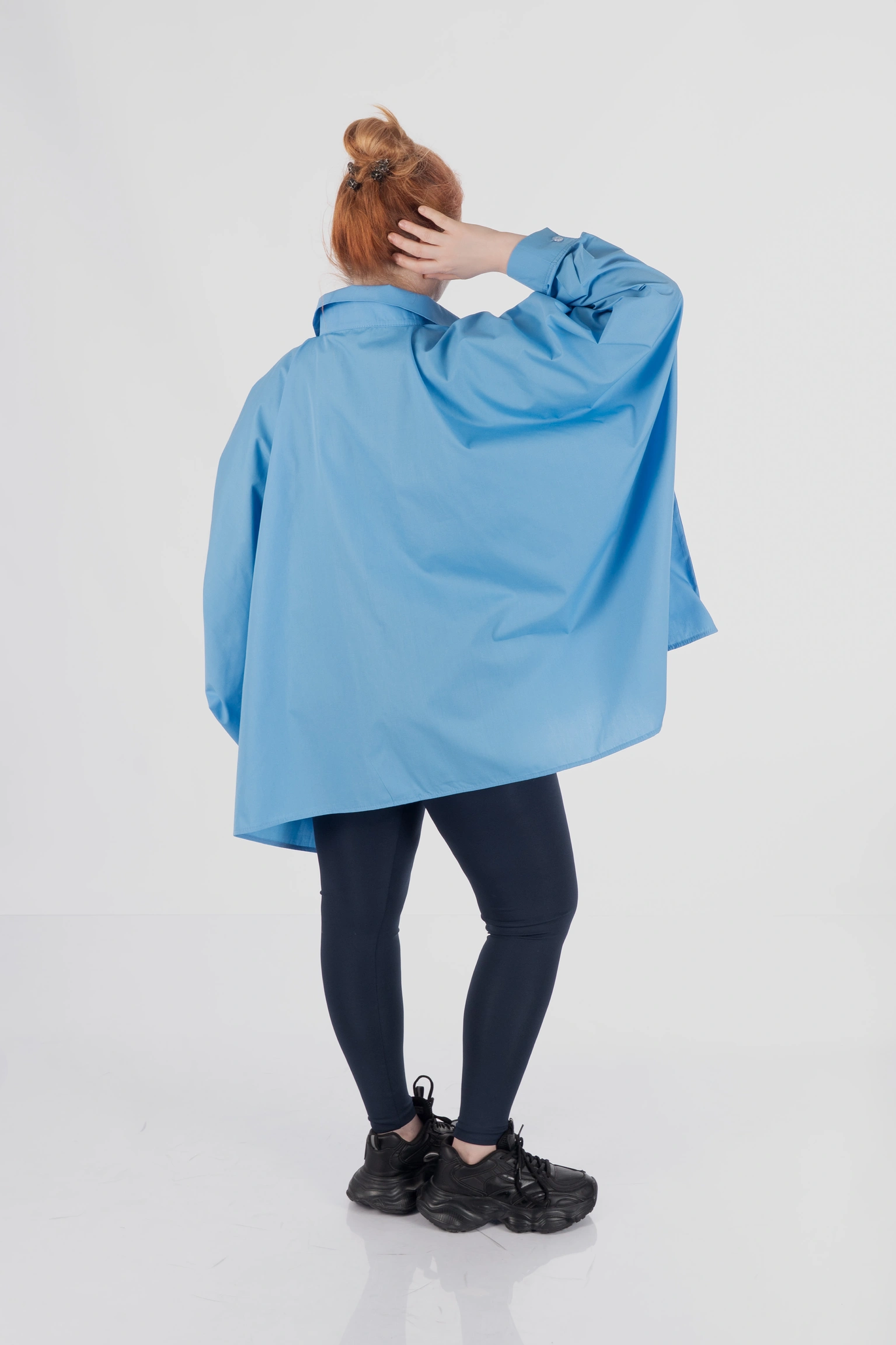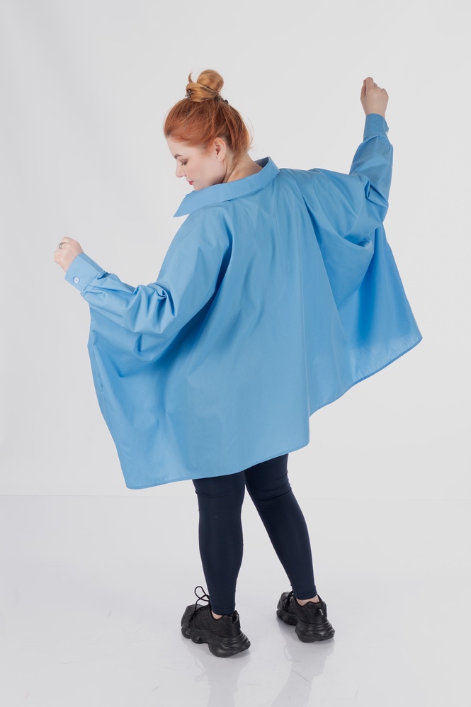 Обʼємний крій не прилягає до тіла, мʼяко окреслює фігуру й дозволяє зберігати впевненість у будь-якій ситуації. Завдяки формі пончо сорочка не акцентує увагу на окремих зонах, а працює з образом цілісно — створює баланс, легкість і візуальний простір.