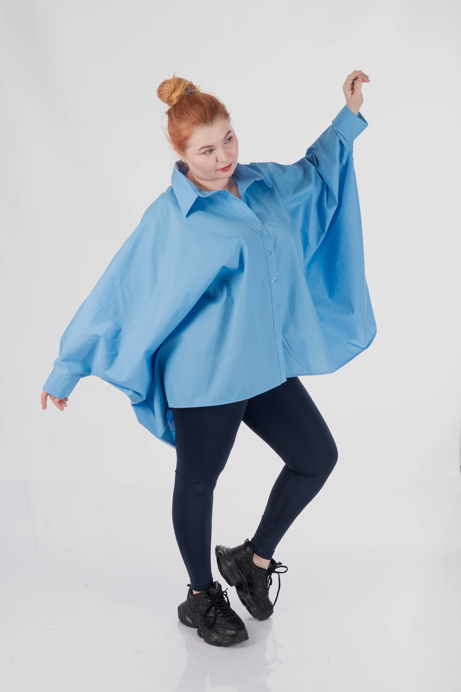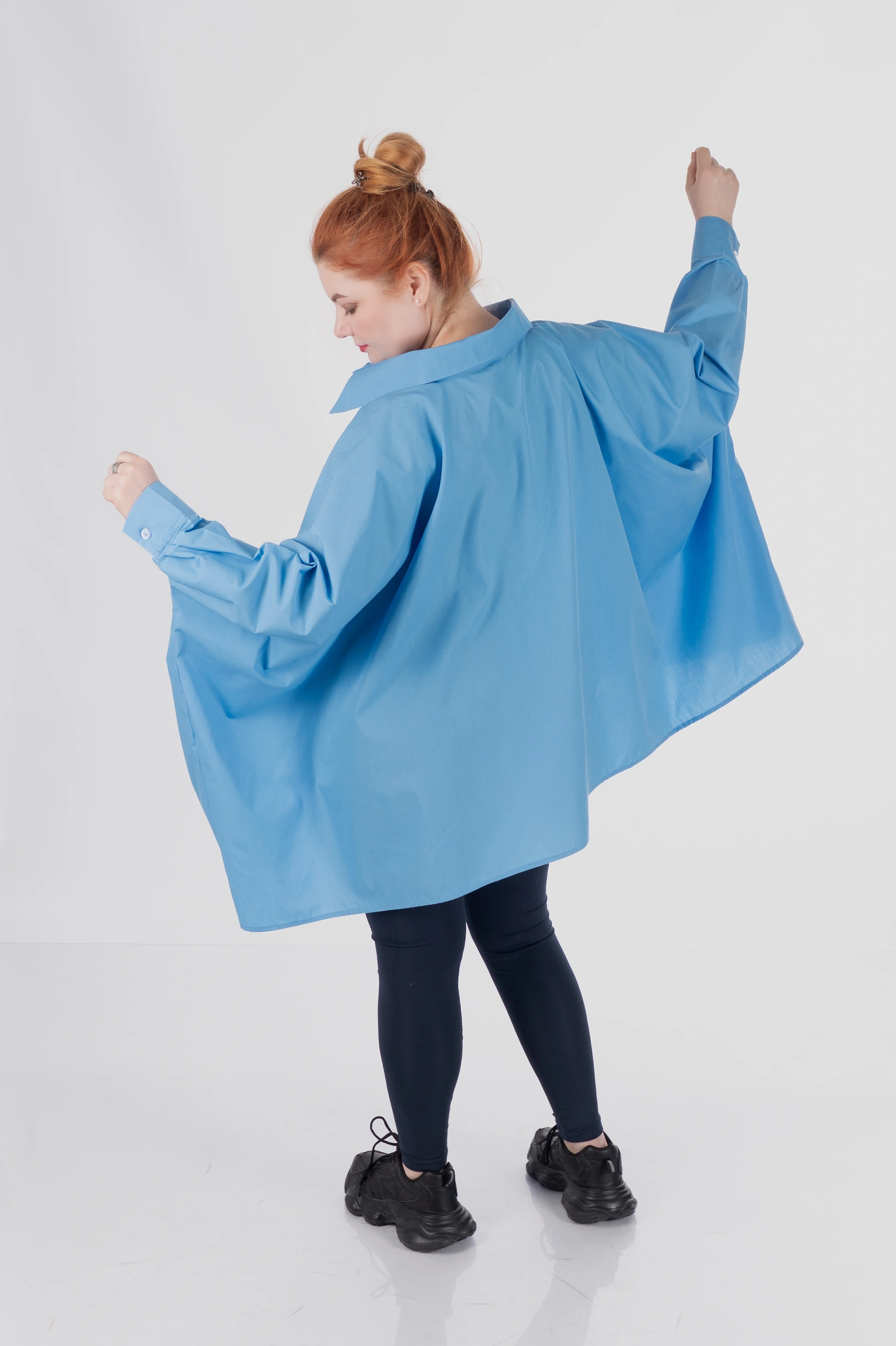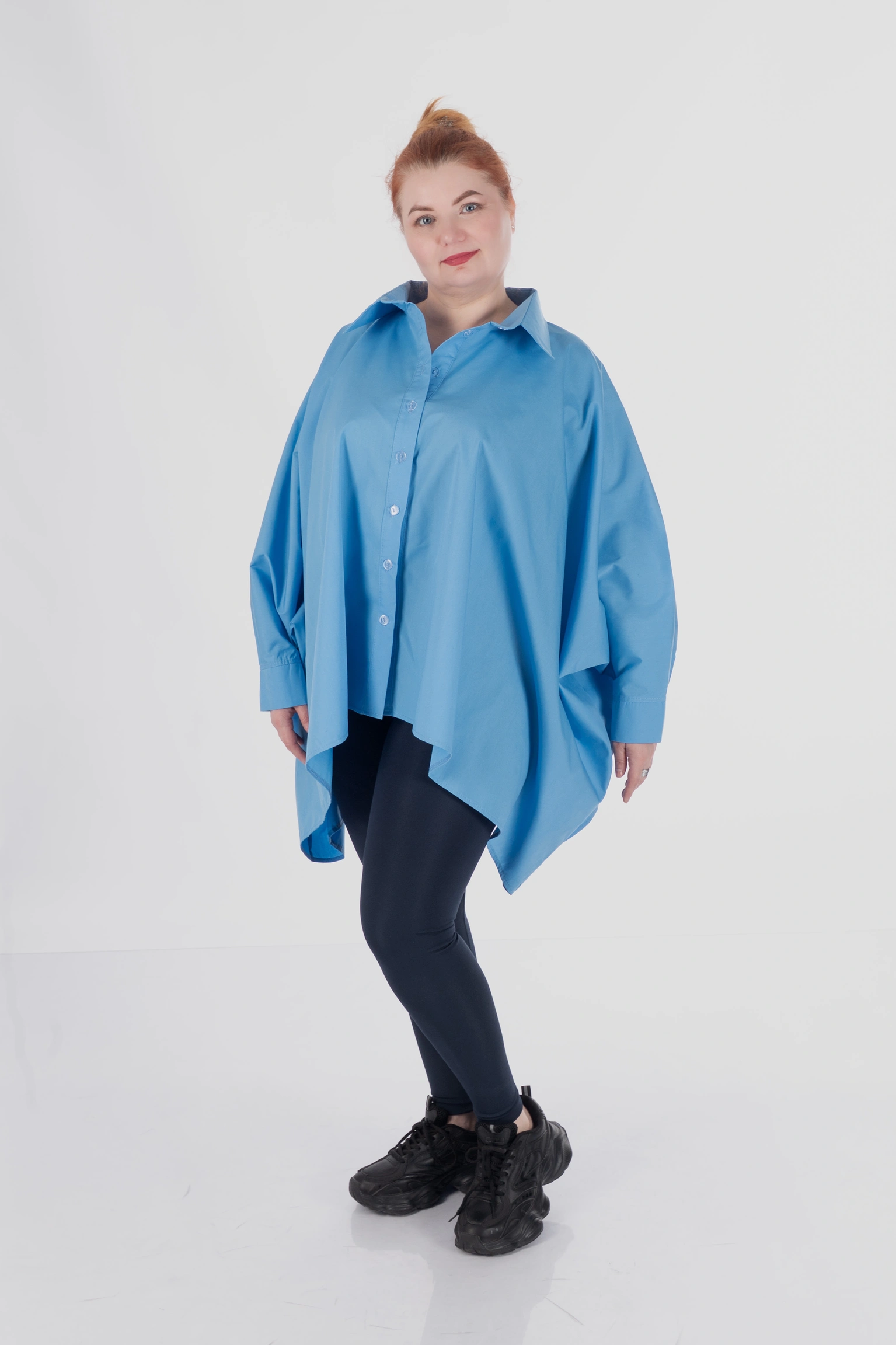 Обʼємний крій не прилягає до тіла, мʼяко окреслює фігуру й дозволяє зберігати впевненість у будь-якій ситуації. Завдяки формі пончо сорочка не акцентує увагу на окремих зонах, а працює з образом цілісно — створює баланс, легкість і візуальний простір.