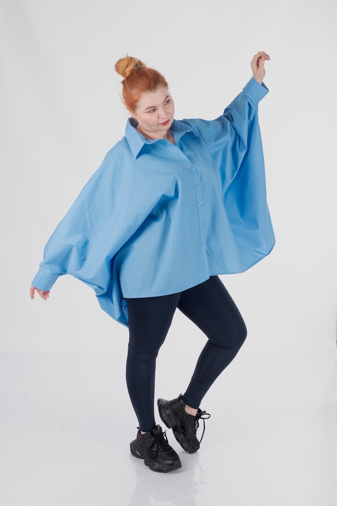 Модель NELLY виконана у форматі вільної сорочки-пончо, що забезпечує комфортну посадку без жорсткої привʼязки до параметрів тіла та дозволяє сорочці природно адаптуватися до різних типів фігури.