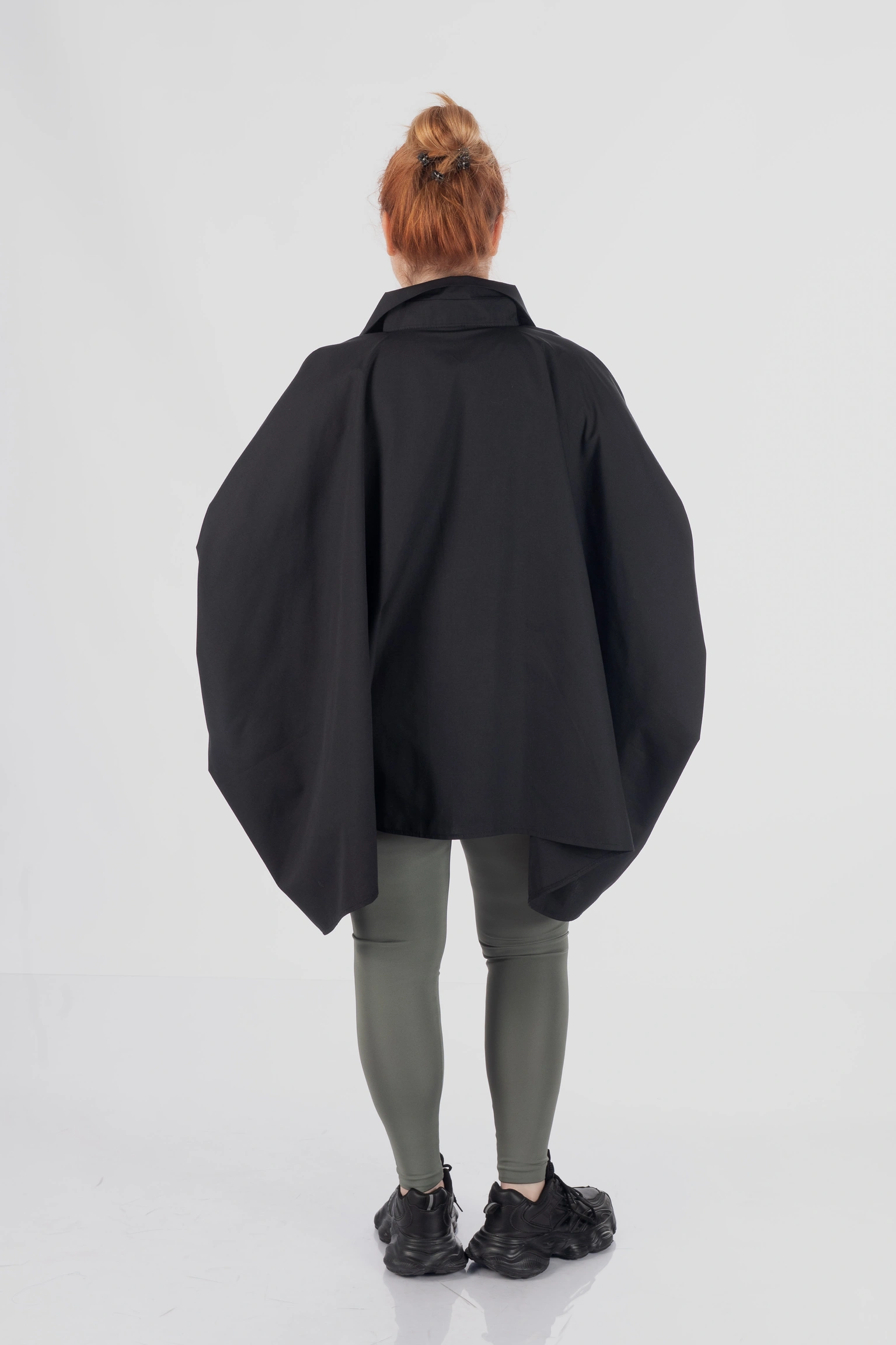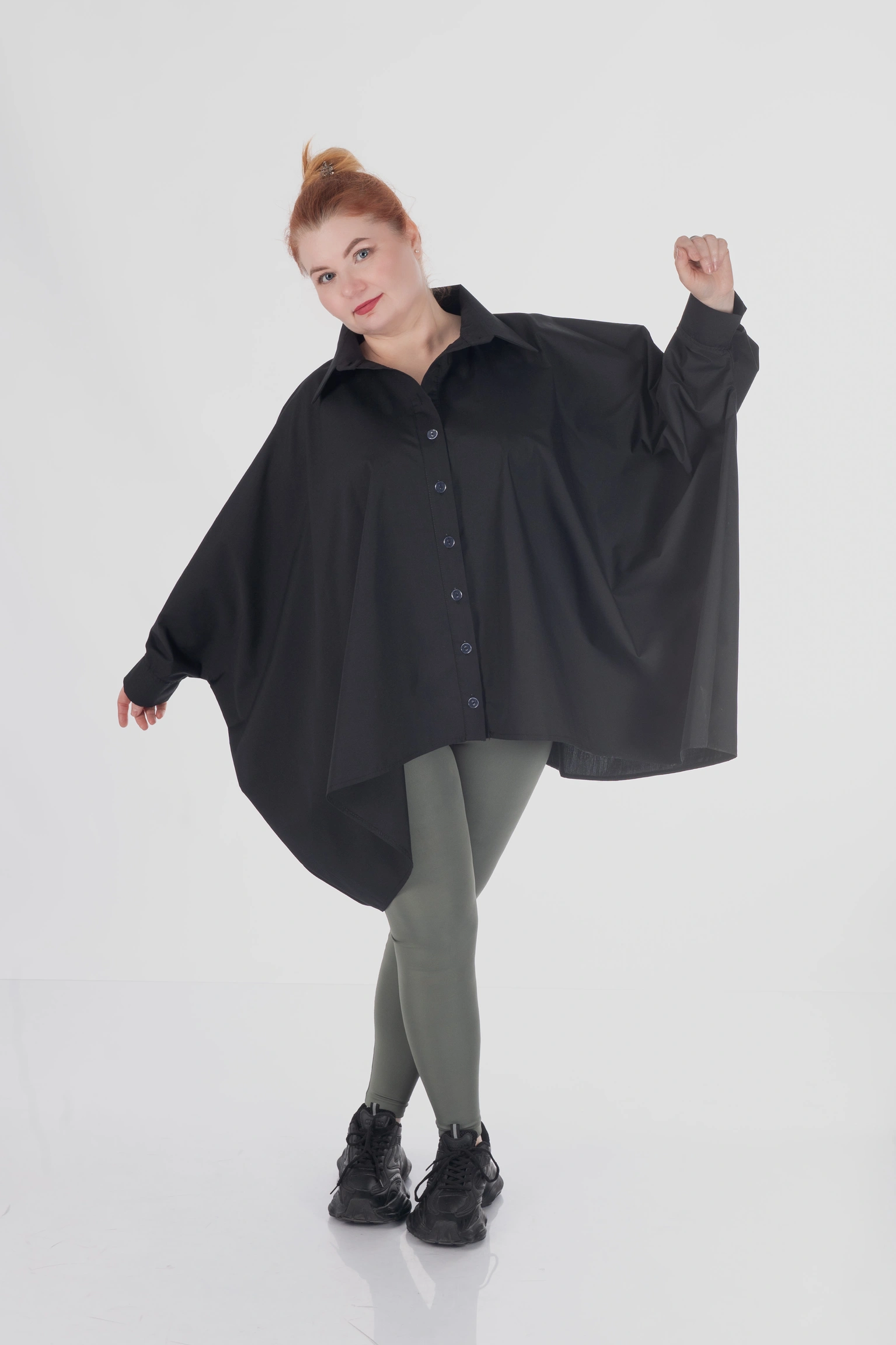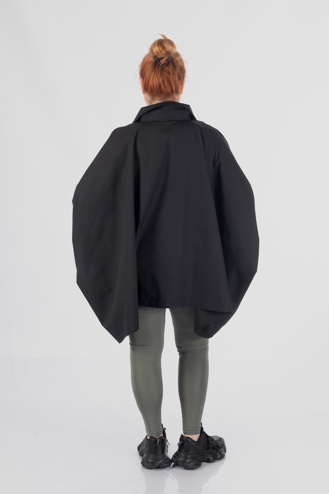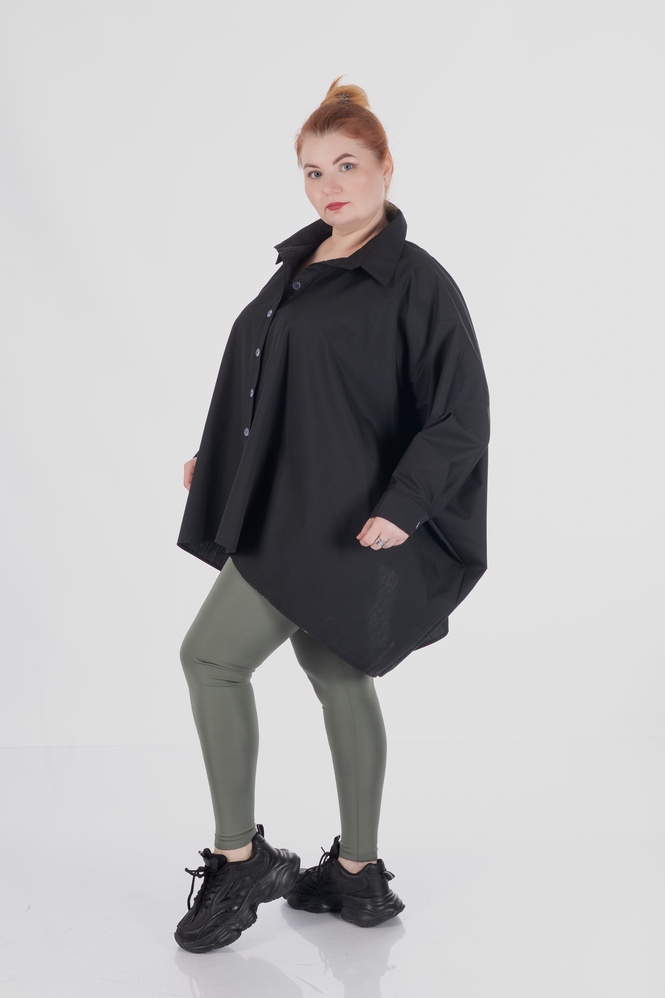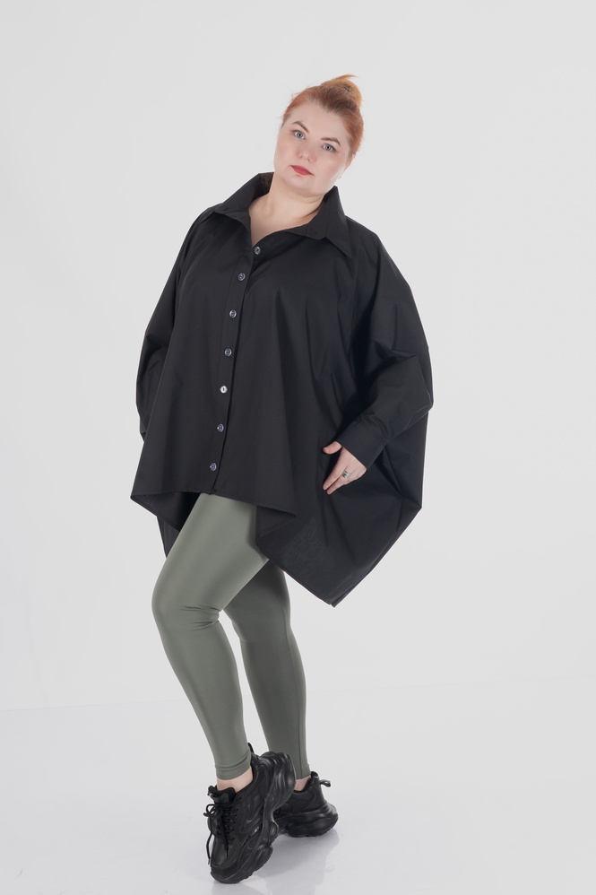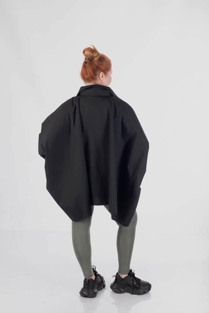 Обʼємний крій не прилягає до тіла, мʼяко окреслює фігуру й дозволяє зберігати впевненість у будь-якій ситуації. Завдяки формі пончо сорочка не акцентує увагу на окремих зонах, а працює з образом цілісно — створює баланс, легкість і візуальний простір.