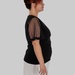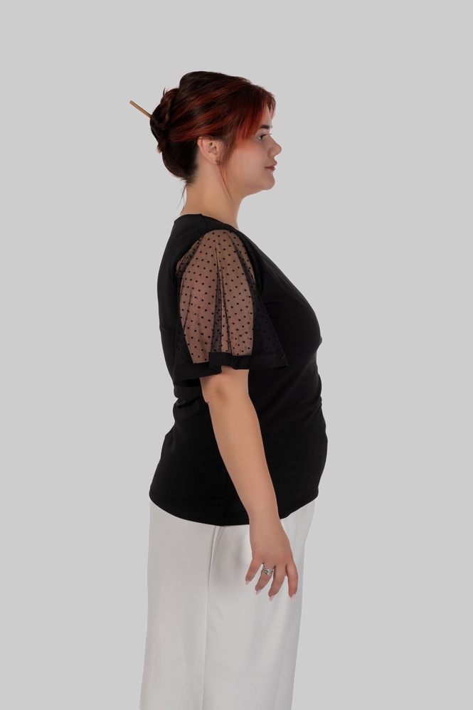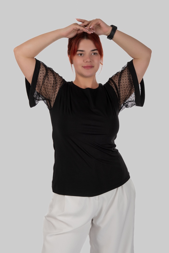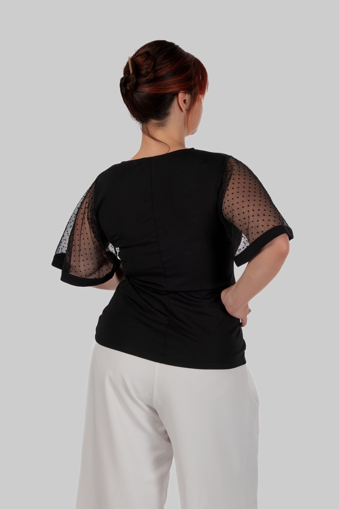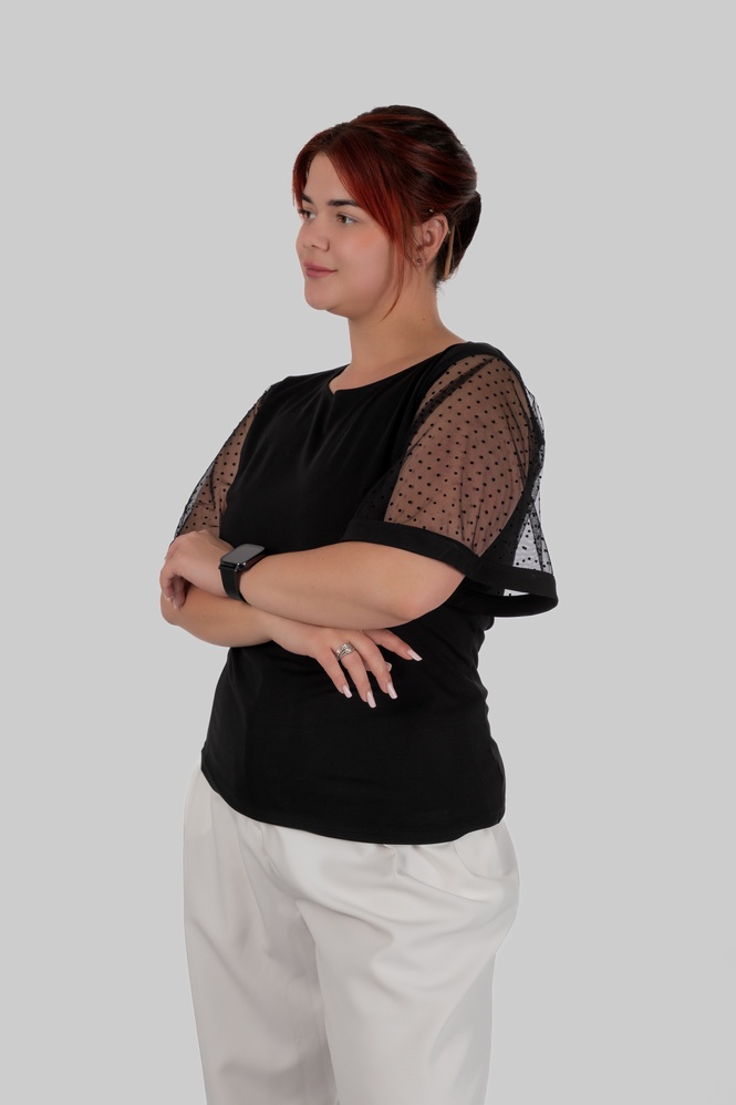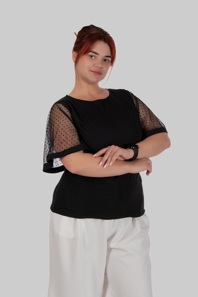 З першого погляду — це лаконічна чорна блуза. Але саме рукави повністю змінюють сприйняття: напівпрозорий гіпюр у дрібний горох додає легкості, жіночності та делікатної сексуальності без перебору.