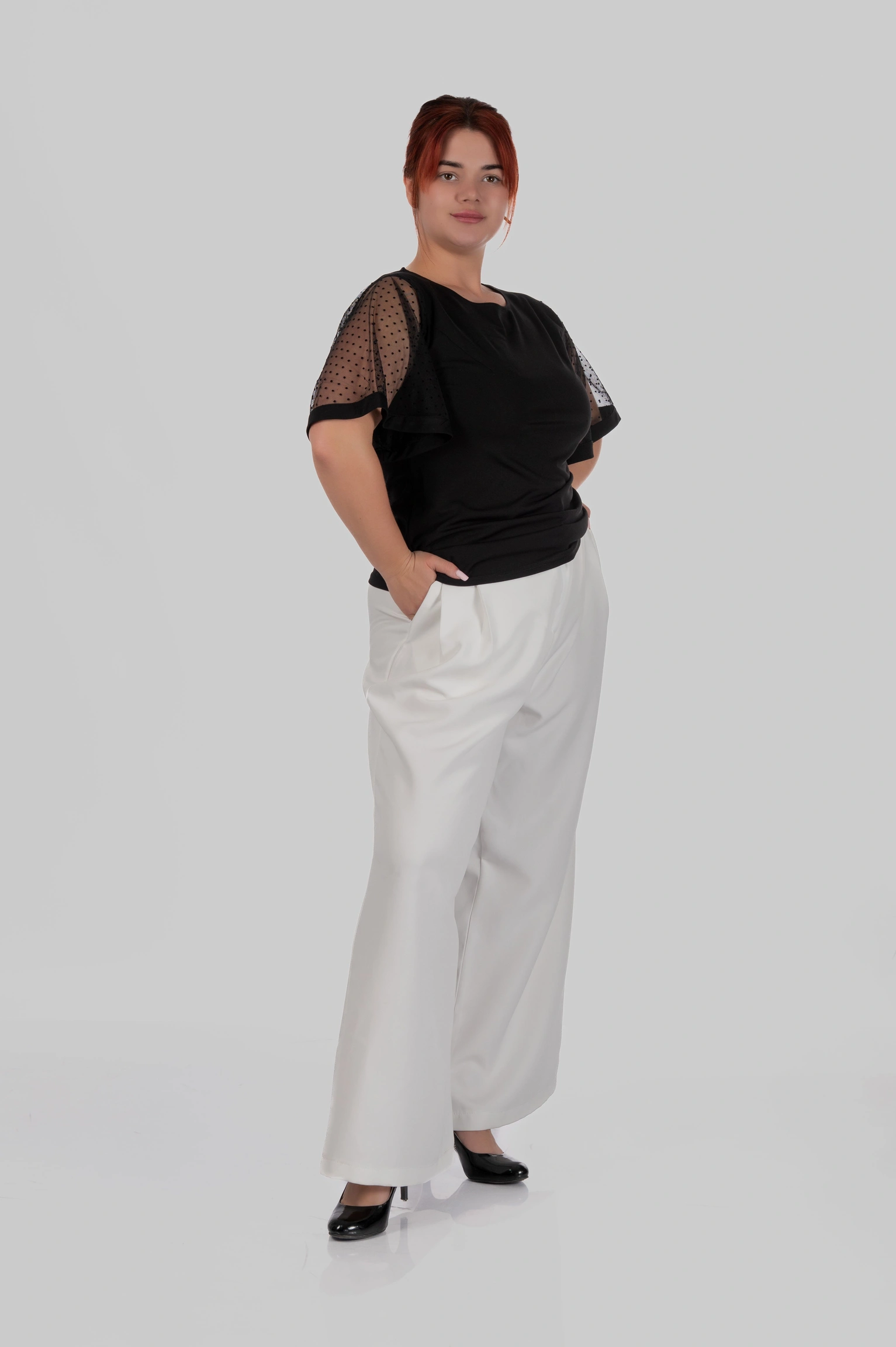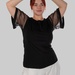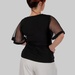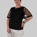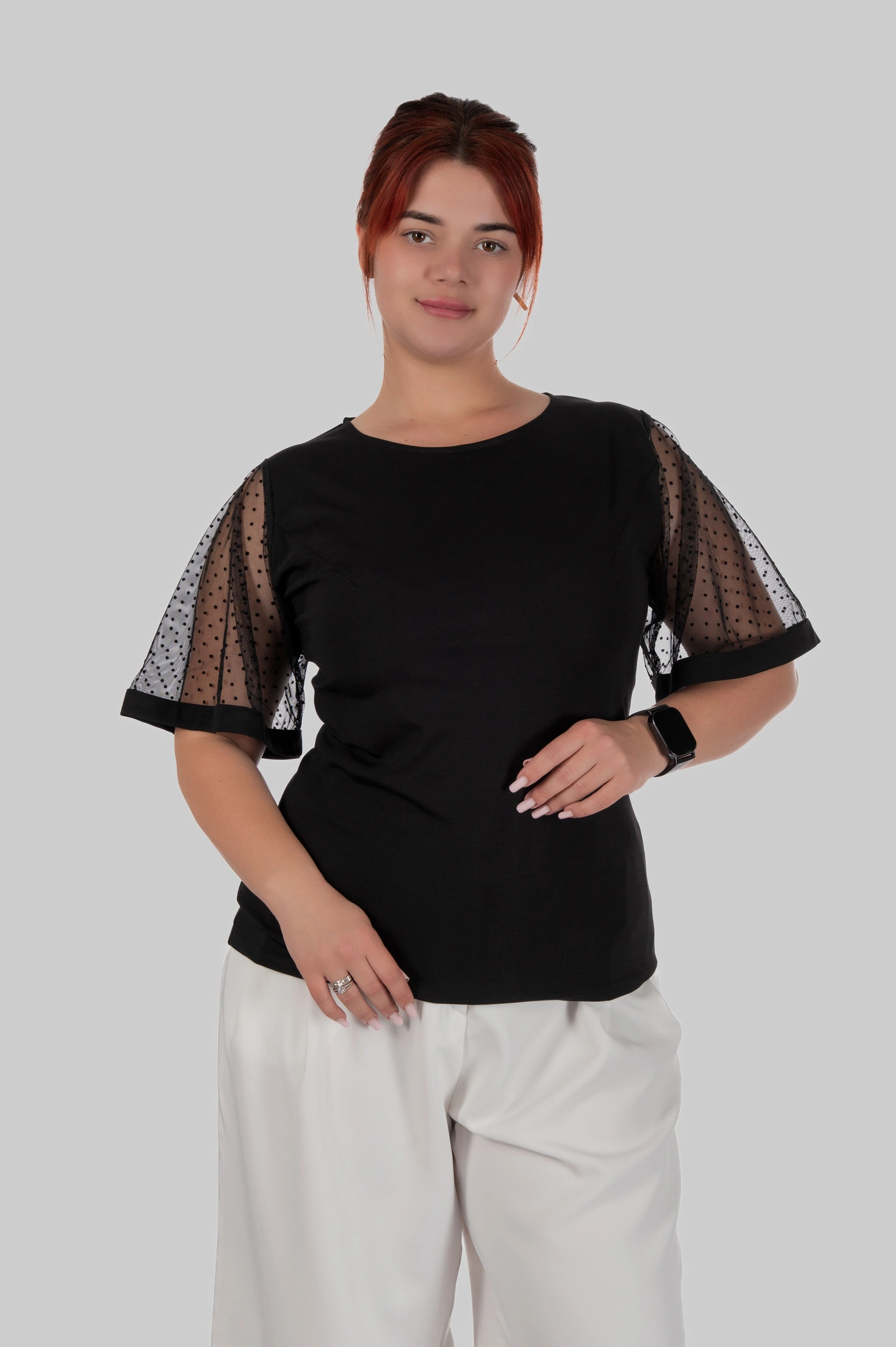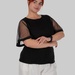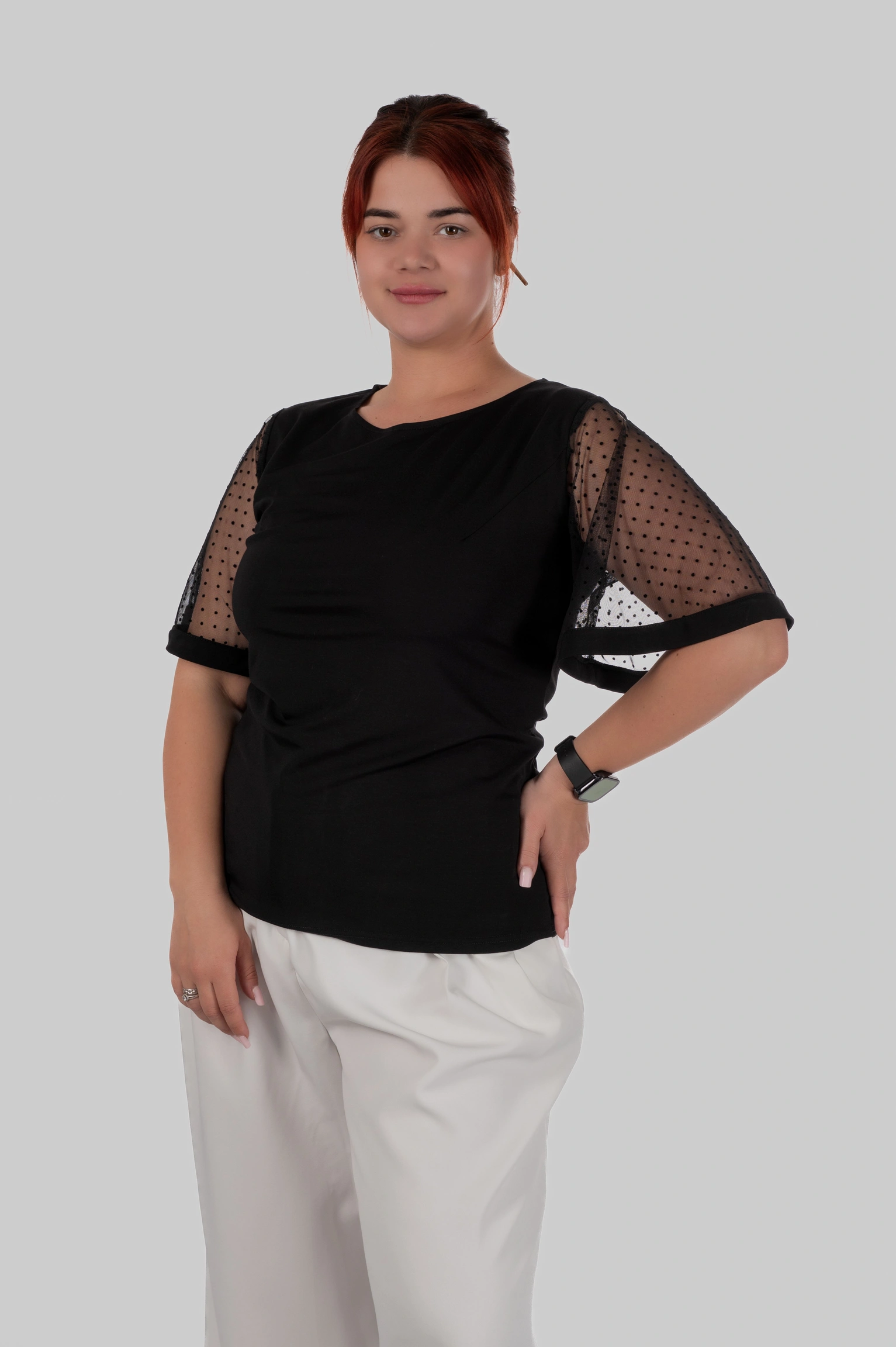 З першого погляду — це лаконічна чорна блуза. Але саме рукави повністю змінюють сприйняття: напівпрозорий гіпюр у дрібний горох додає легкості, жіночності та делікатної сексуальності без перебору.