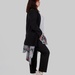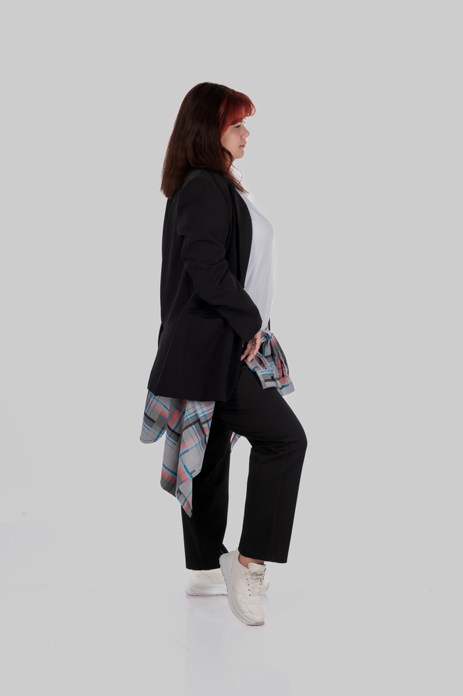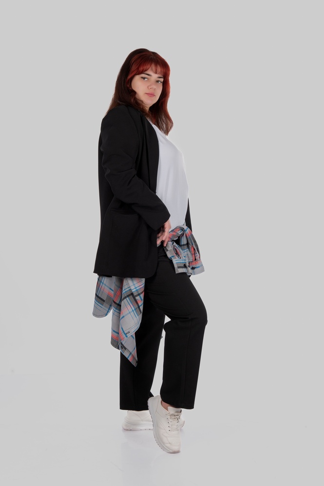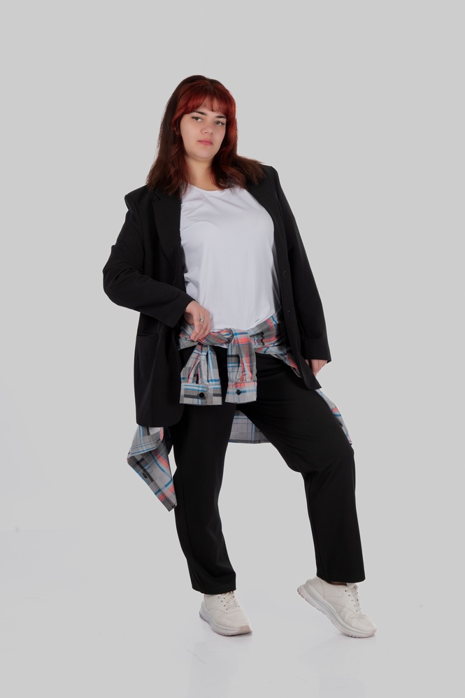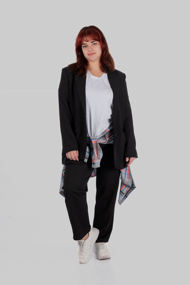Костюмна тканина з віскозою дає приємну пластику й комфорт у русі, поліестер додає зносостійкості, а спандекс — легку еластичність. Клітинка тут графічна та сучасна: на спокійній сірій базі — кольорові лінії, які освіжають образ і дають “родзинку”, але не роблять річ складною в поєднаннях.