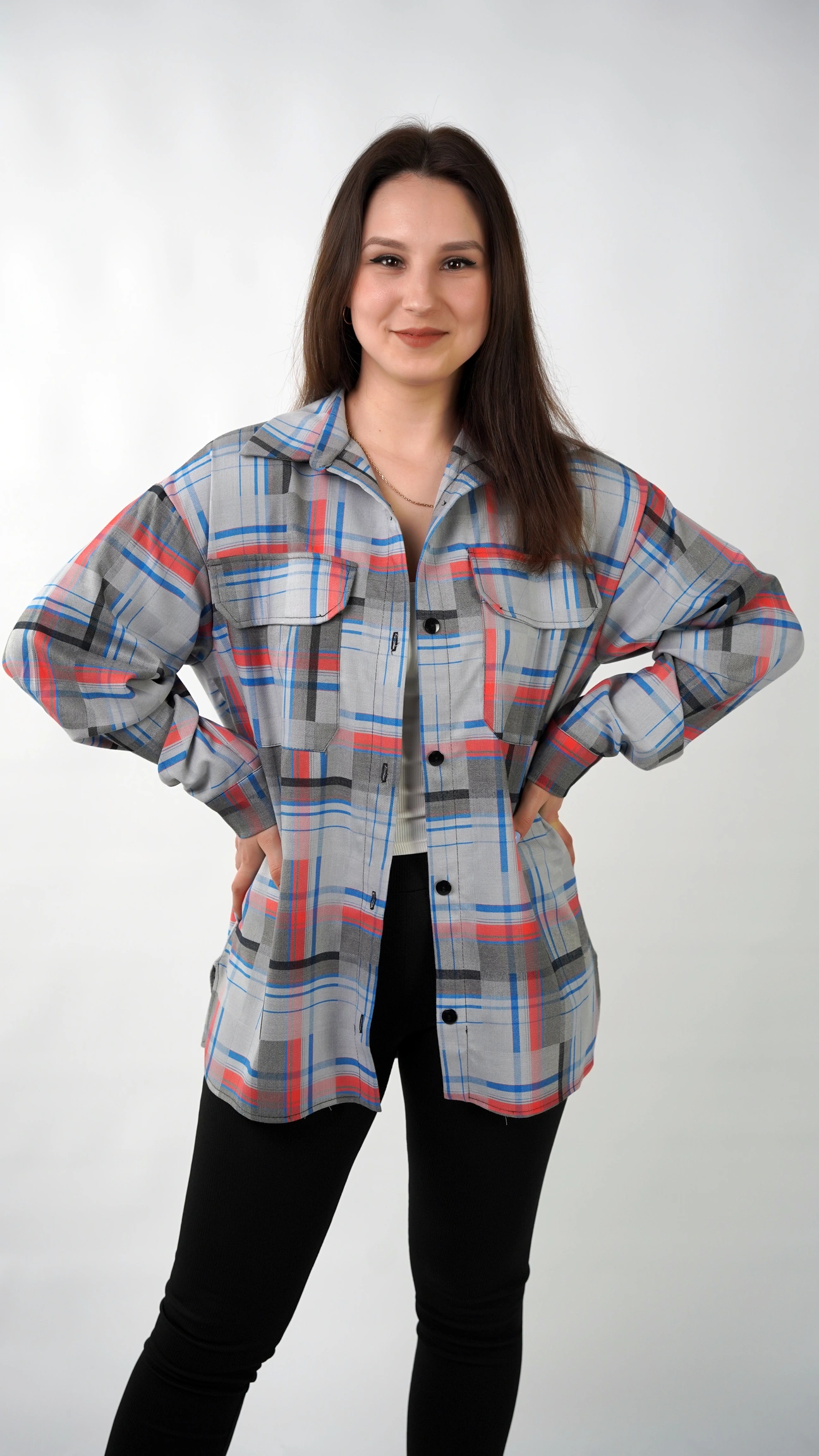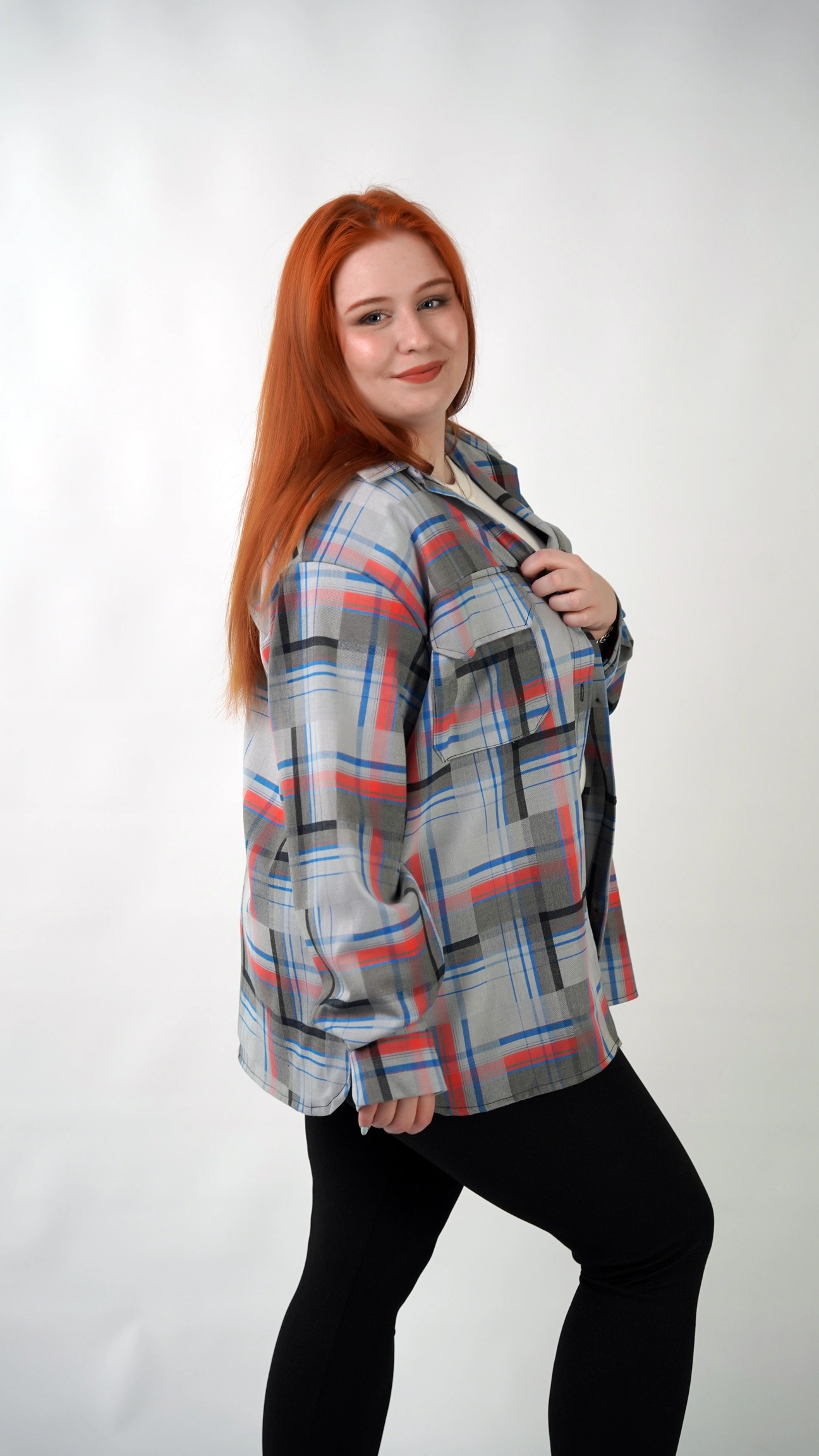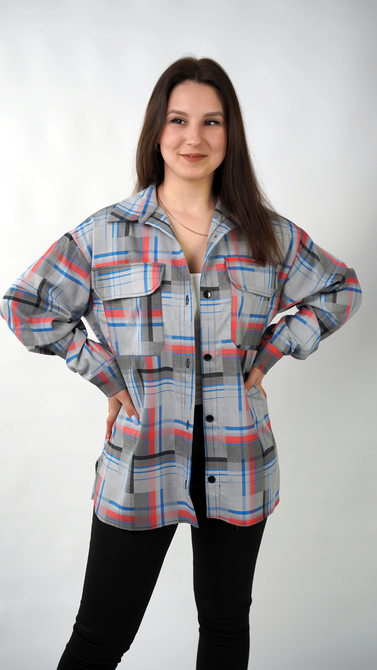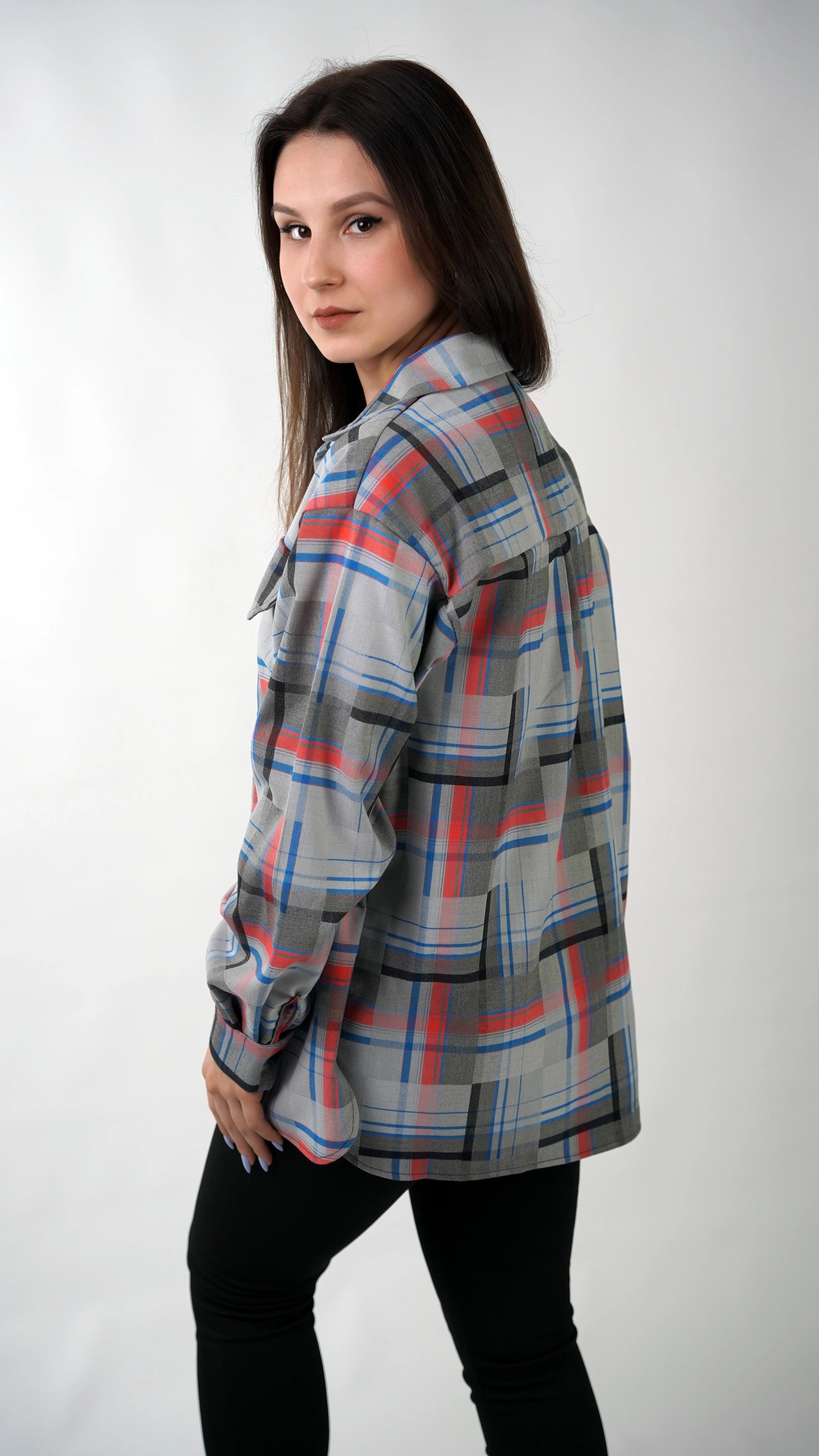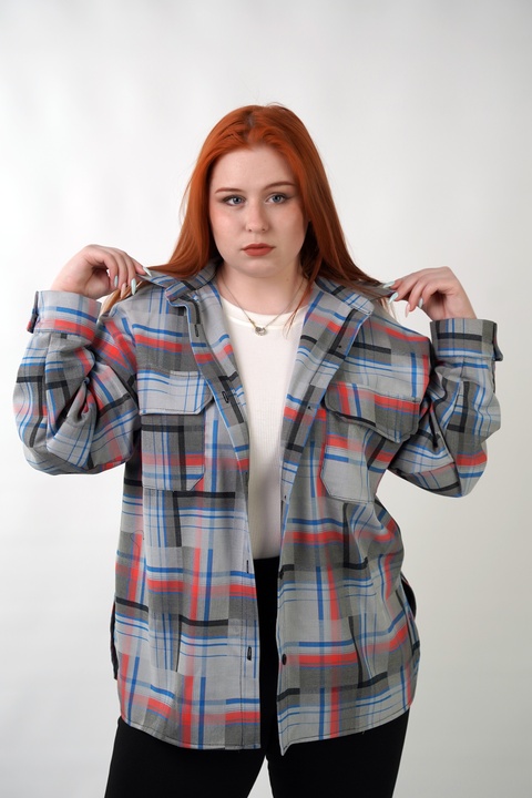CasualGrid — подовжена сорочка в клітинку, яка працює як готовий інструмент стилю.У неї прямий крій і вільна посадка: тканина лежить рівно, не “липне” до тіла й тримає форму, тому образ виглядає зібрано навіть тоді, коли ти в базі — топ/майка + легінси або джинси.
