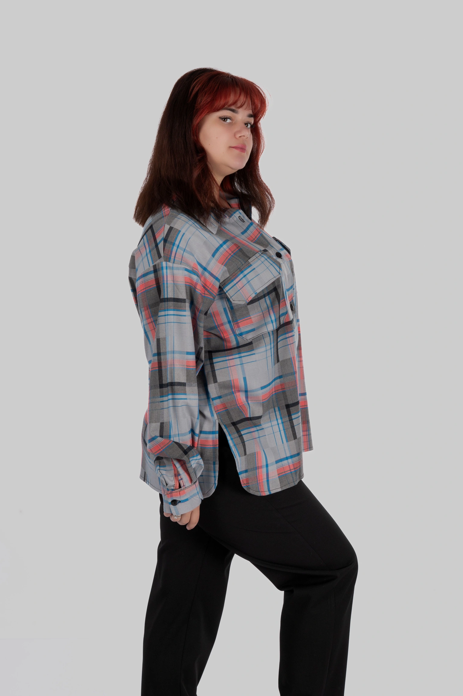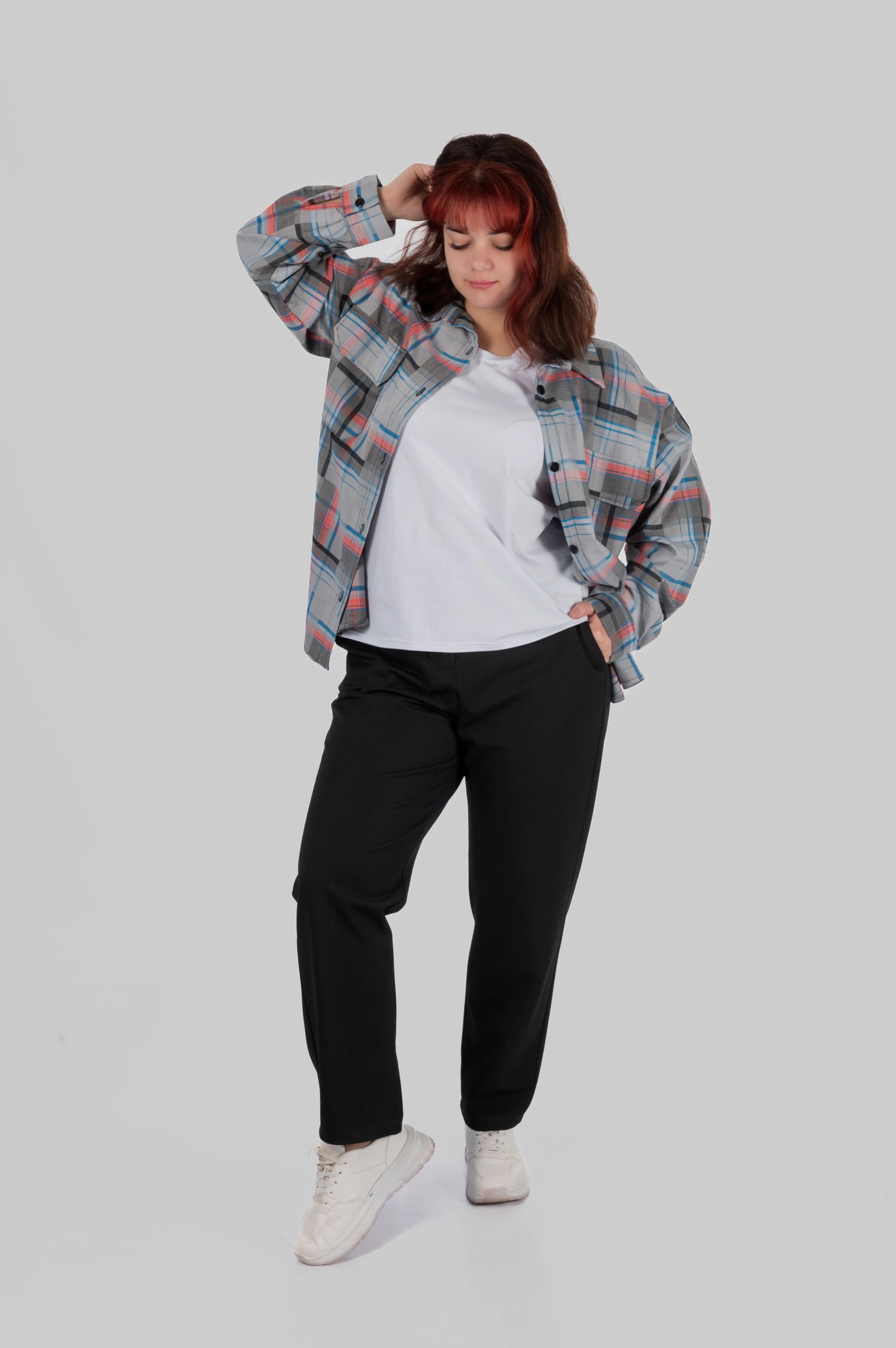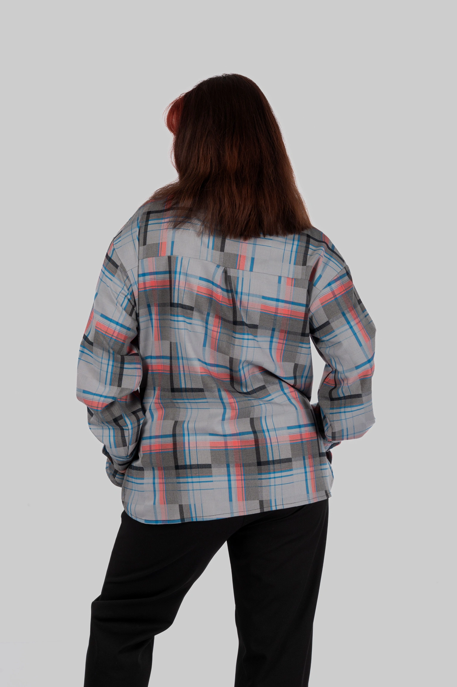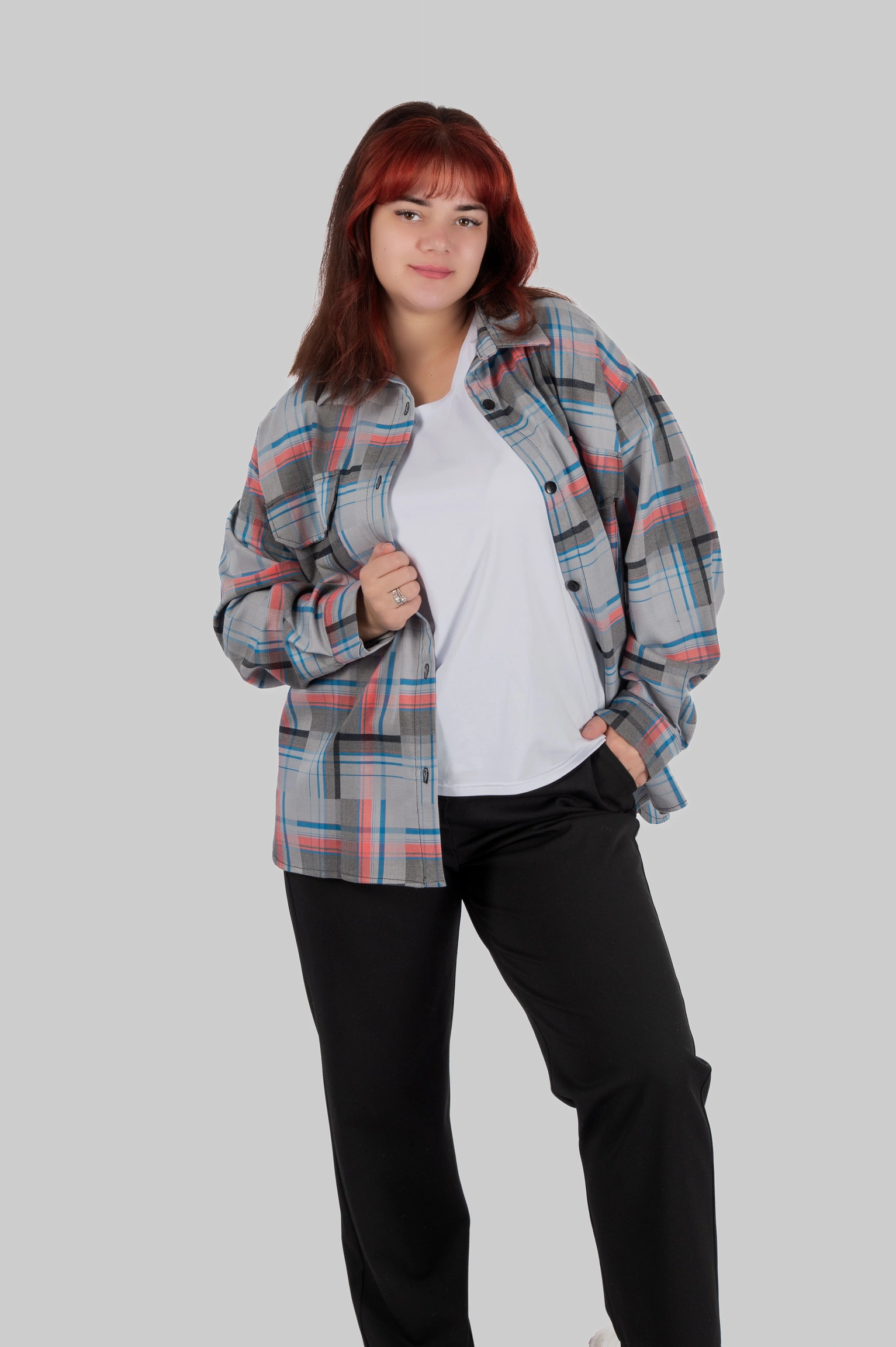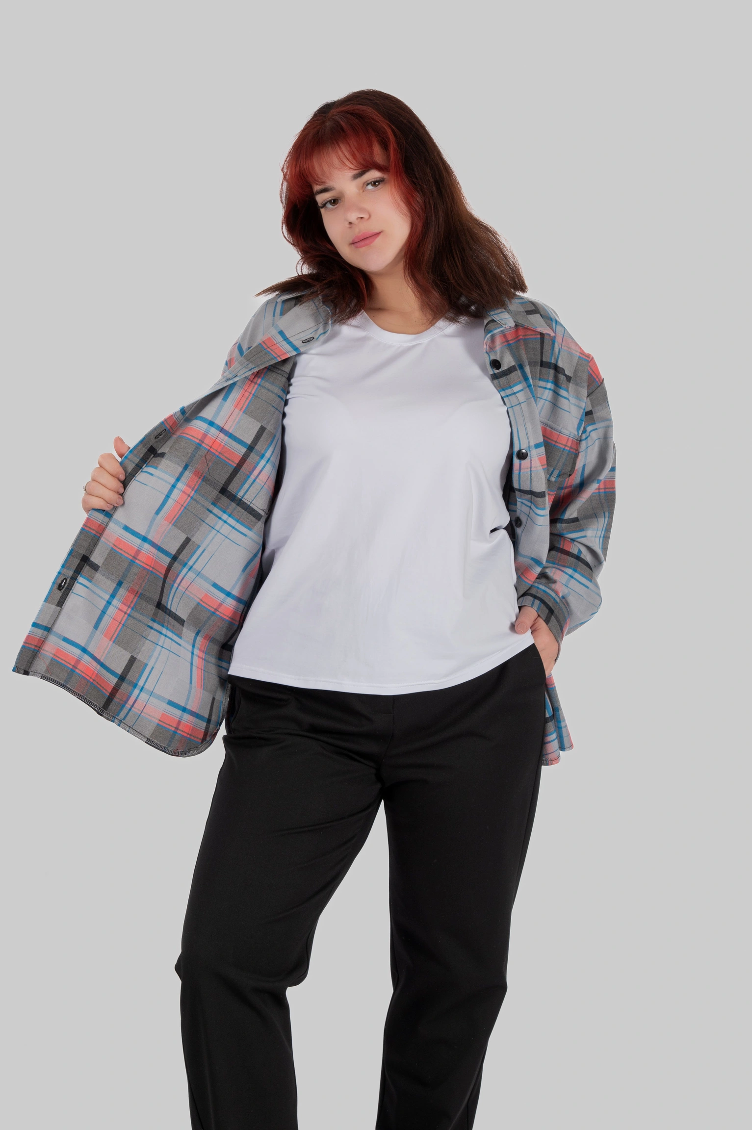 CasualGrid — подовжена сорочка в клітинку, яка працює як готовий інструмент стилю.У неї прямий крій і вільна посадка: тканина лежить рівно, не “липне” до тіла й тримає форму, тому образ виглядає зібрано навіть тоді, коли ти в базі — топ/майка + легінси або джинси.