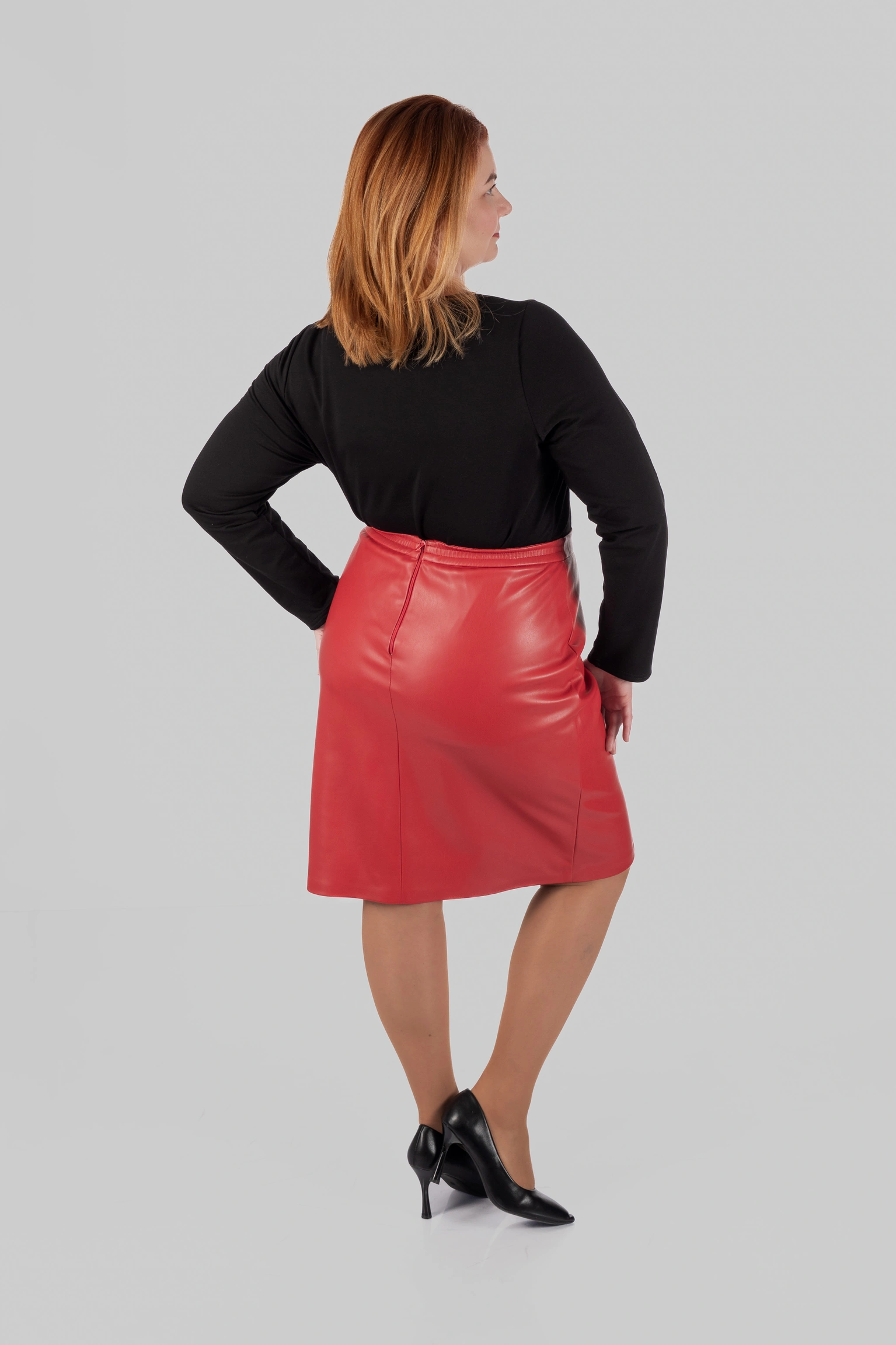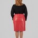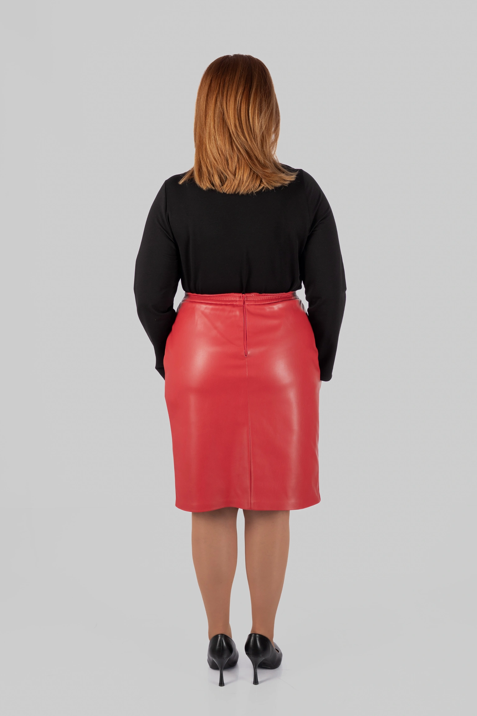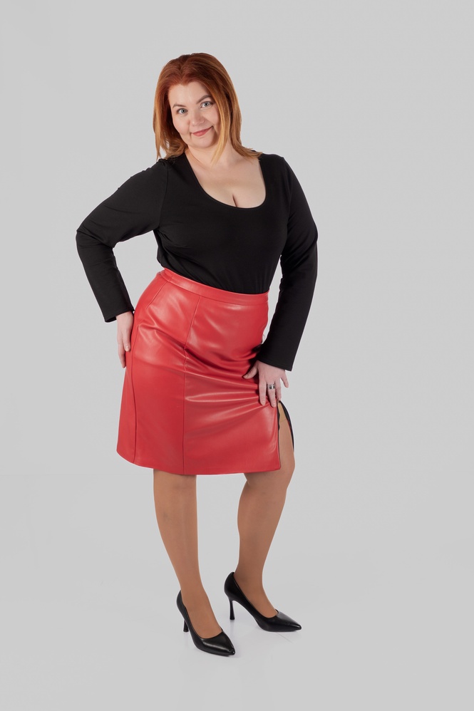 Модель виконана зі структурної еко-шкіри на замші. Зовні матеріал виглядає щільно, гладко та виразно, добре тримає форму і створює чіткий силует. З внутрішнього боку він має м’яку замшеву основу, приємну до тіла. Завдяки цьому спідниця з еко-шкіри великих розмірів виглядає ефектно, але залишається комфортною у щоденному носінні.
