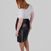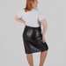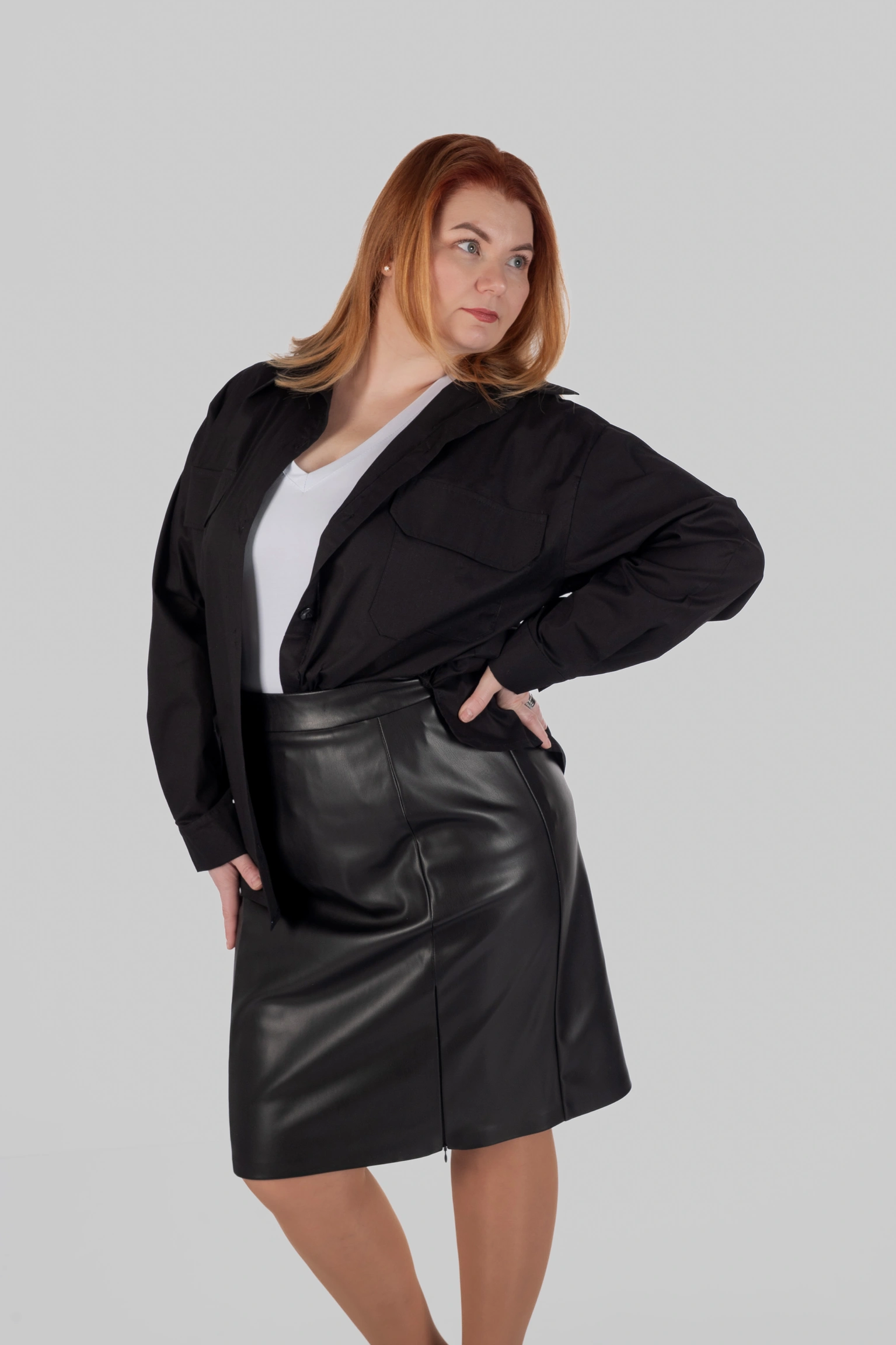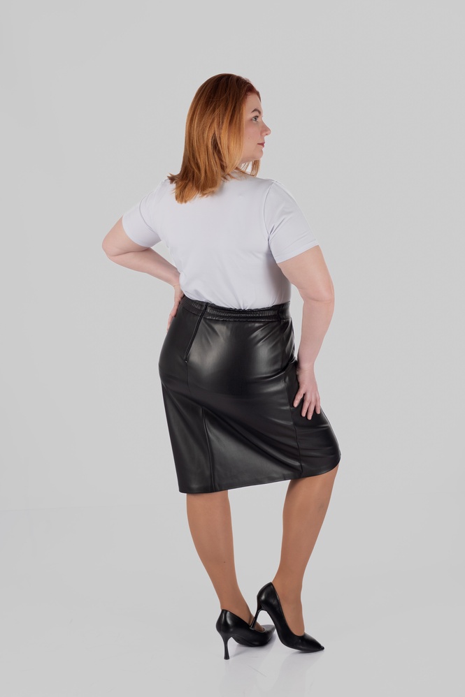 Модель виконана зі структурної еко-шкіри на замші. Зовні матеріал виглядає щільно, гладко та виразно, добре тримає форму і створює чіткий силует. З внутрішнього боку він має м’яку замшеву основу, приємну до тіла. Завдяки цьому спідниця з еко-шкіри великих розмірів виглядає ефектно, але залишається комфортною у щоденному носінні.