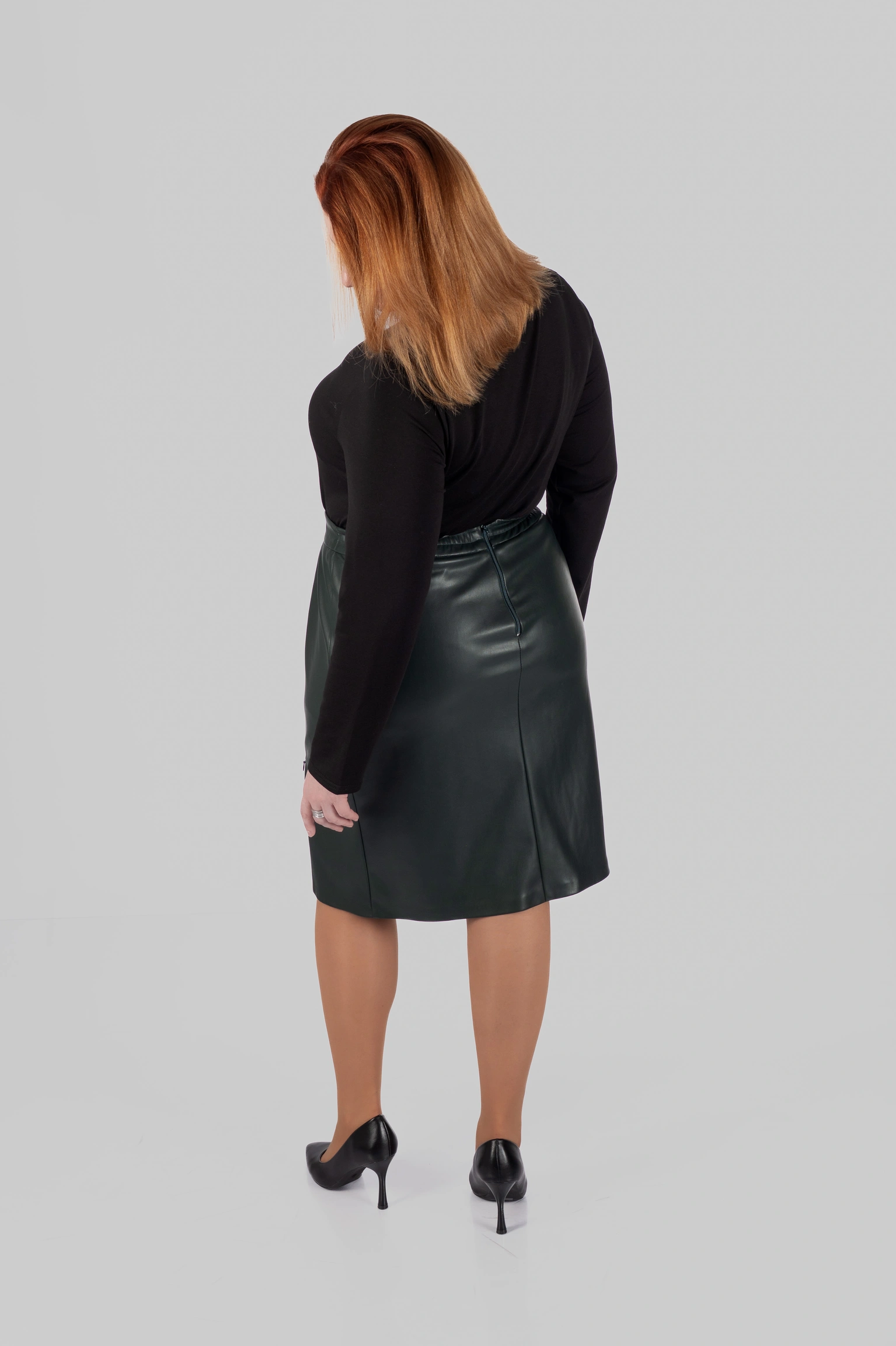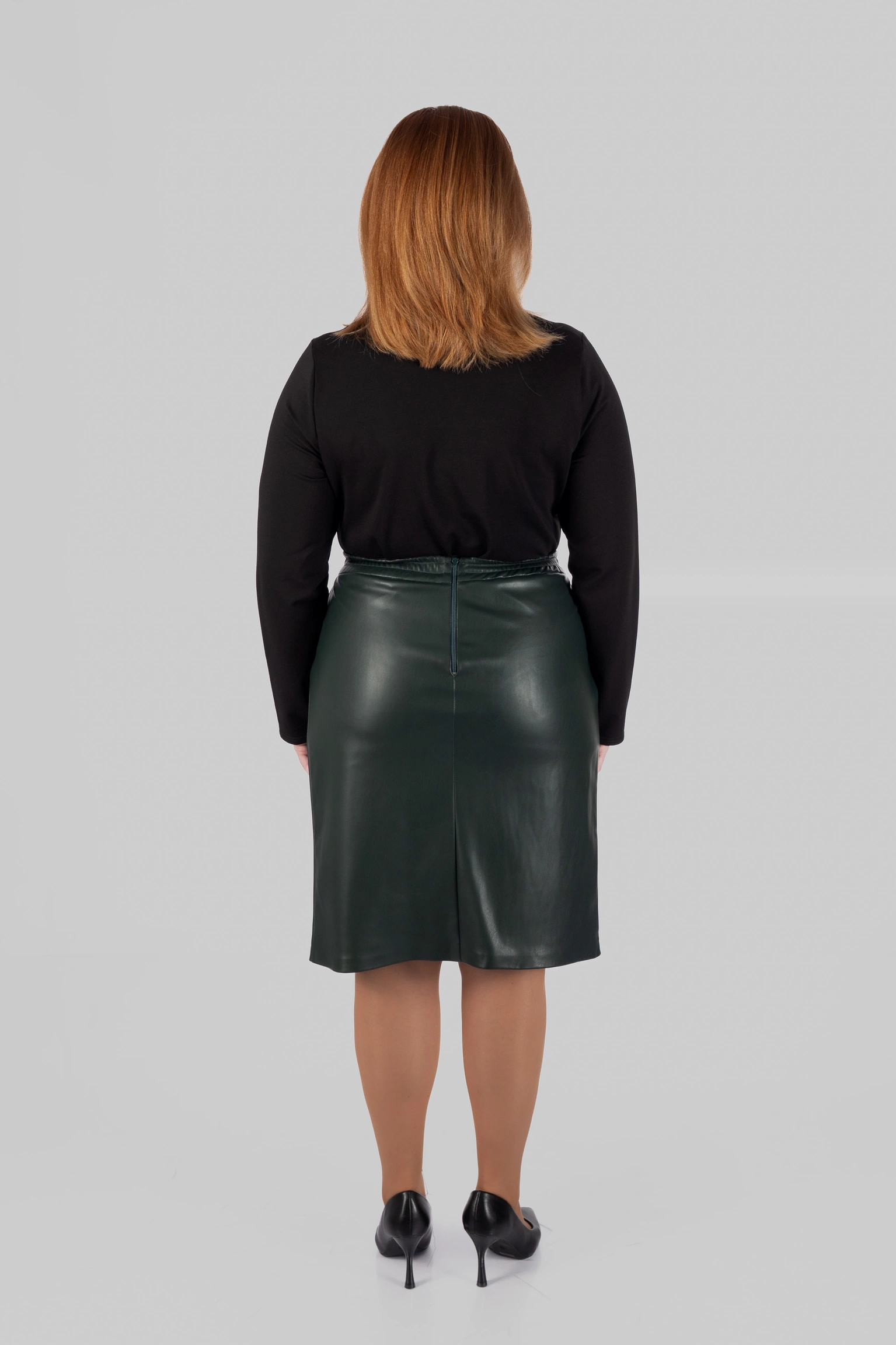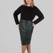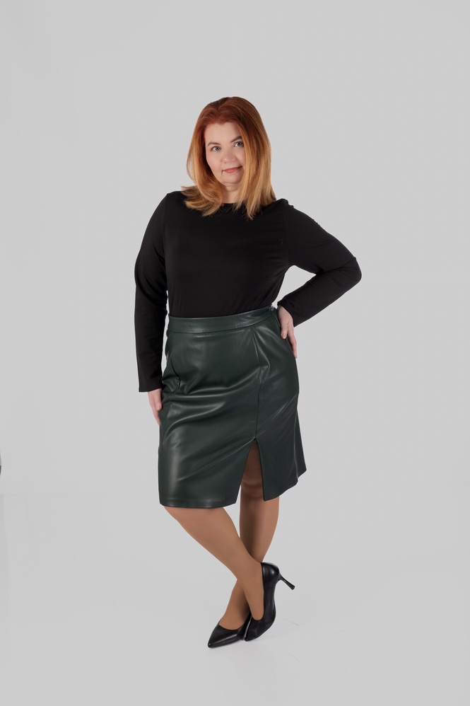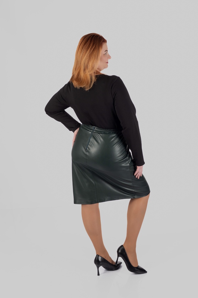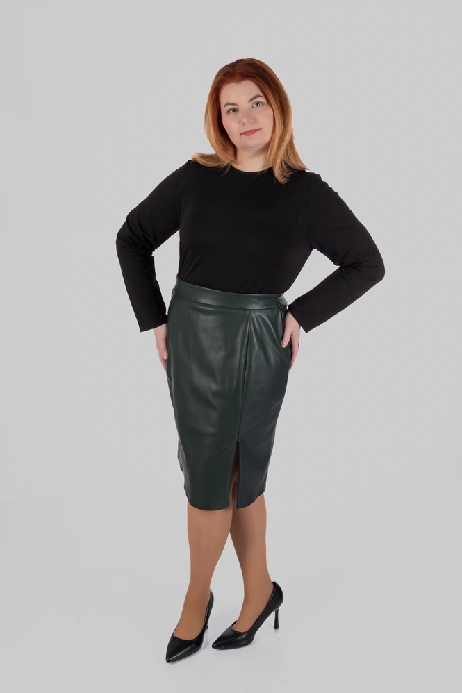 Модель виконана зі структурної еко-шкіри на замші. Зовні матеріал виглядає щільно, гладко та виразно, добре тримає форму і створює чіткий силует. З внутрішнього боку він має м’яку замшеву основу, приємну до тіла. Завдяки цьому спідниця з еко-шкіри великих розмірів виглядає ефектно, але залишається комфортною у щоденному носінні.
