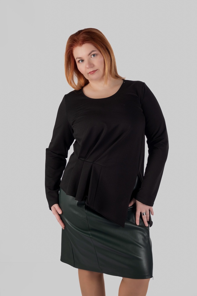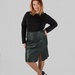 Силует — прямий, злегка завужений донизу. Міні довжина відкриває ноги та робить силует більш легким і пропорційним. У гардеробі plus size така довжина часто працює дуже вдало, тому що додає образу енергії та допомагає створити більш збалансовані пропорції.