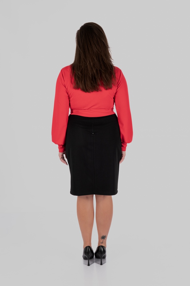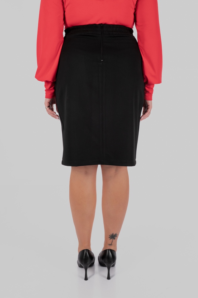 У дизайні цієї мініспідниці великих розмірів ключову роль відіграє баланс між структурою і комфортом. Чисті лінії крою формують акуратну геометрію виробу, а продумана посадка дозволяє моделі працювати на фігуру без надмірного облягання. Саме такий підхід дозволяє створити силует, який виглядає охайно і стабільно протягом усього дня.