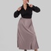 Силует — А-подібний. Тканина м’яко розширюється від лінії талії і формує витончений силует без надмірного облягання. Такий крій виглядає елегантно і водночас залишається комфортним для щоденного носіння.