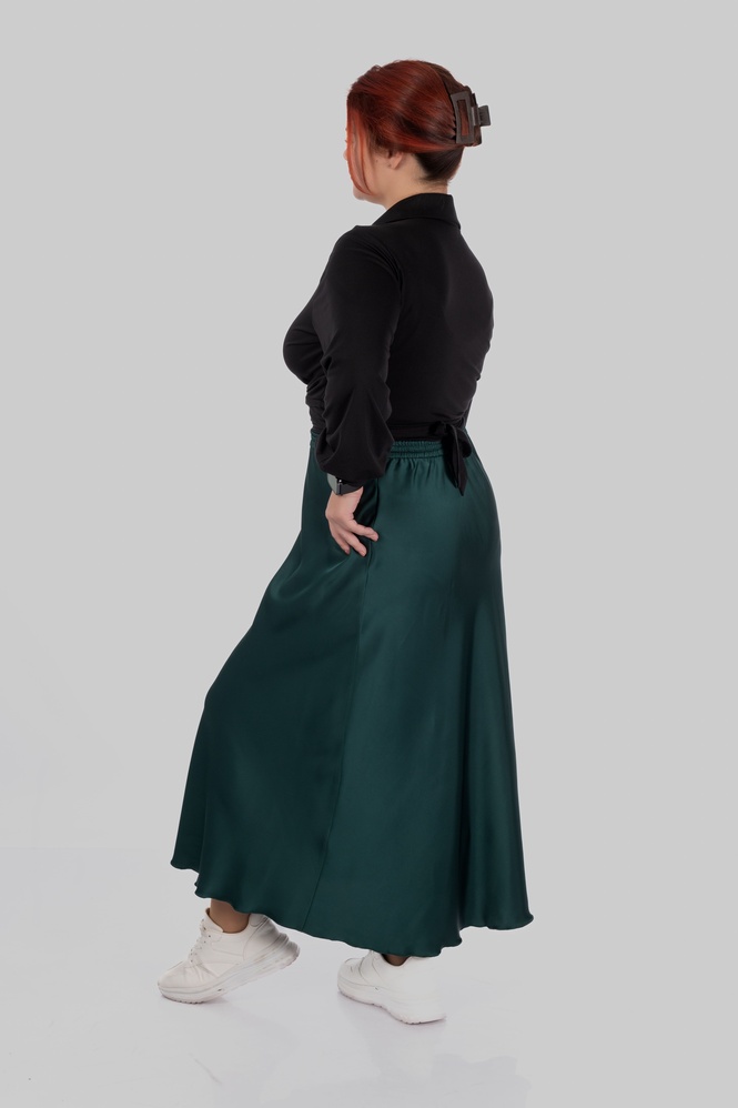Спідниця скроєна по косій. Саме завдяки такому крою тканина природно адаптується до фігури, м’яко обтікає силует і створює характерний струмливий рух під час ходи.