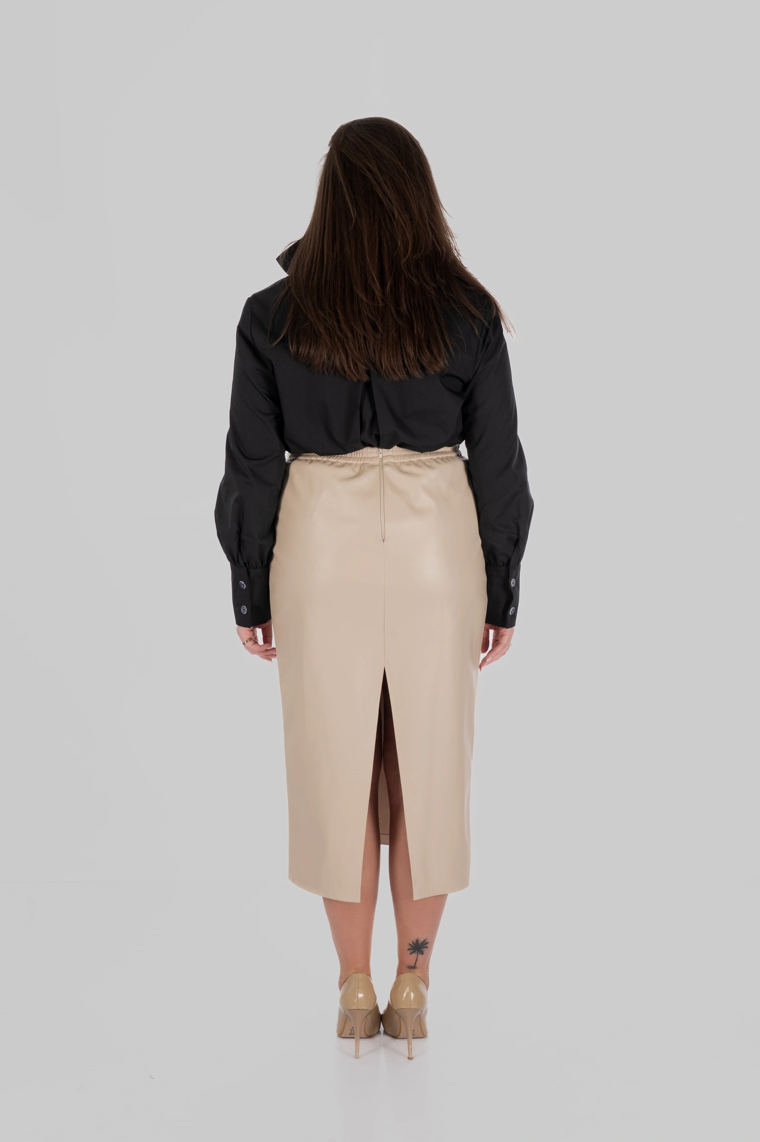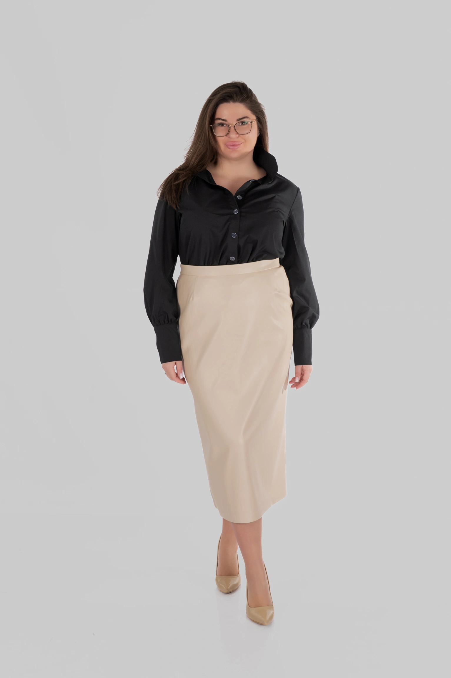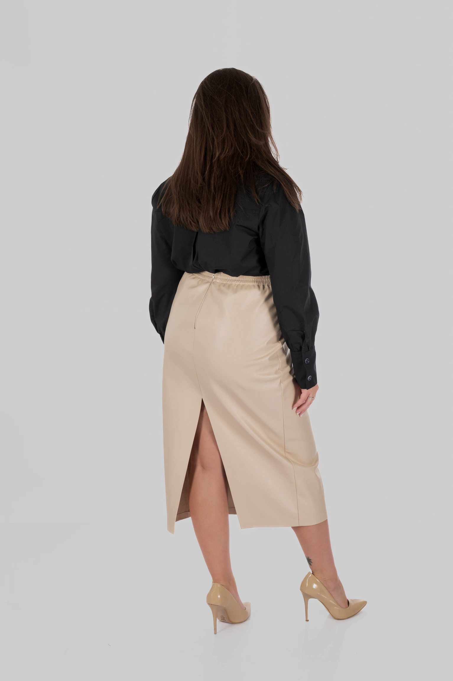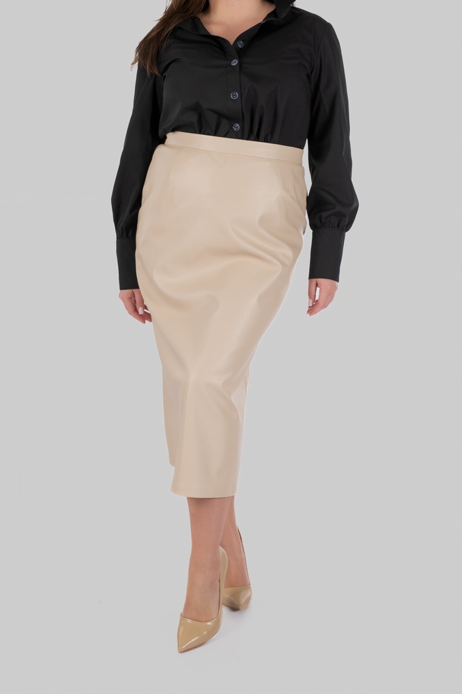 Ще одна сильна сторона цієї моделі — її стилістична гнучкість. Ця спідниця міді з еко-шкіри легко поєднується з сорочками, лонгслівами, базовими футболками, тонким трикотажем, джемперами та жакетами. У більш зібраних образах вона працює зі структурованим верхом і взуттям на підборах або лоферами. У повсякденних — з м’яким трикотажем, черевиками або мінімалістичними кросівками. У більш акцентних стилізаціях достатньо додати виразний верх, ремінь чи прикраси — і модель уже працює зовсім інакше.