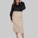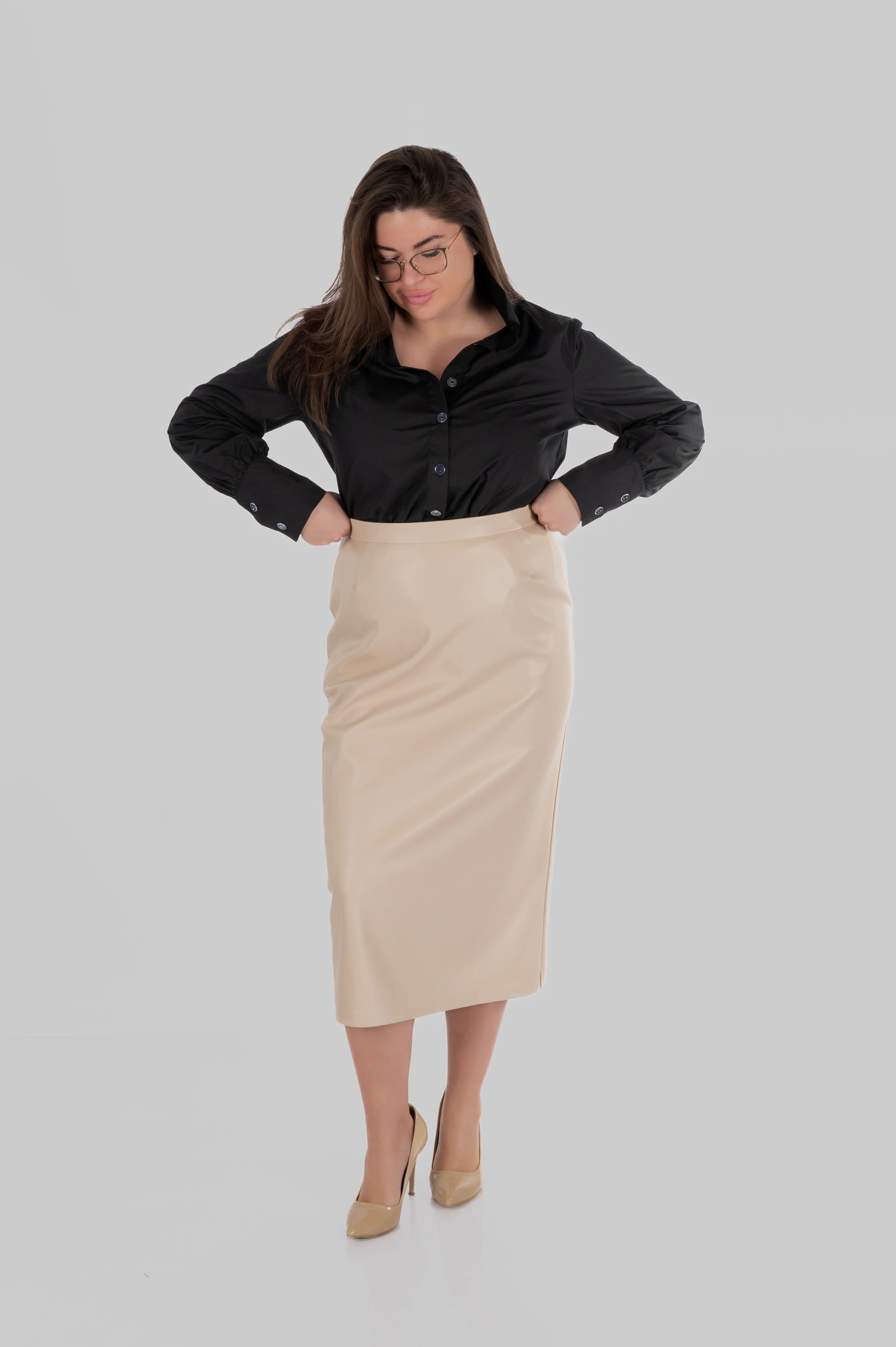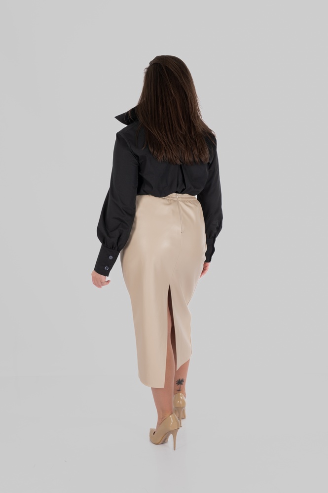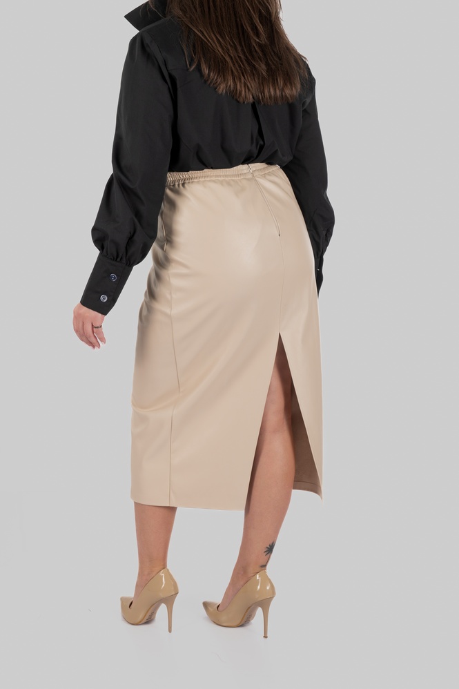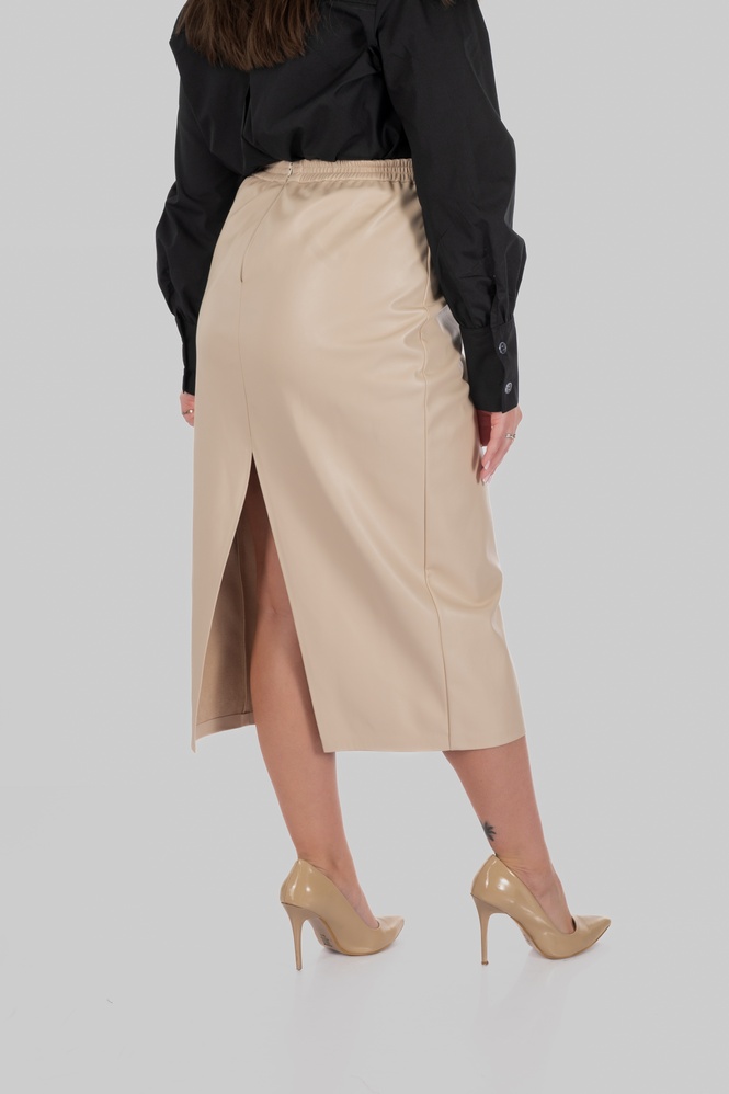 Ще одна сильна сторона цієї моделі — її стилістична гнучкість. Ця спідниця міді з еко-шкіри легко поєднується з сорочками, лонгслівами, базовими футболками, тонким трикотажем, джемперами та жакетами. У більш зібраних образах вона працює зі структурованим верхом і взуттям на підборах або лоферами. У повсякденних — з м’яким трикотажем, черевиками або мінімалістичними кросівками. У більш акцентних стилізаціях достатньо додати виразний верх, ремінь чи прикраси — і модель уже працює зовсім інакше.