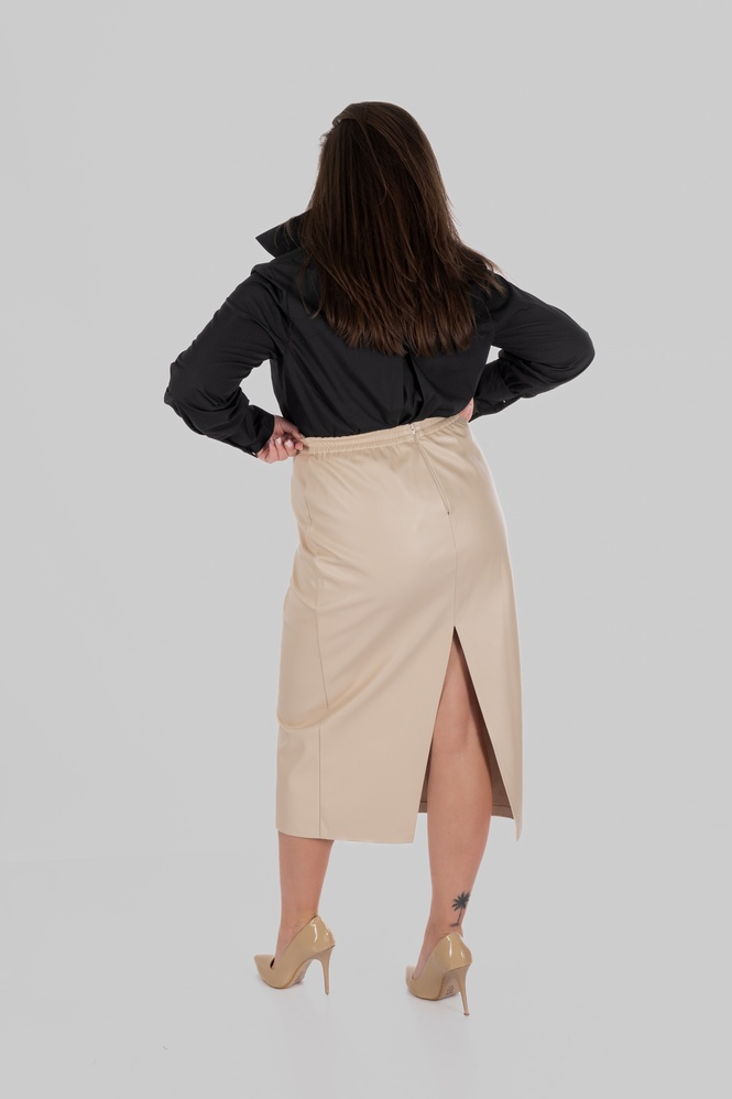 Окрема сила цієї моделі — матеріал. Еко-шкіра на замші дає саме той ефект, який складно отримати від звичайної еко-шкіри: зовні виріб виглядає структурно, гладко й виразно, а зсередини має м’яку замшеву основу, приємну до тіла. Завдяки цьому спідниця з еко-шкіри великих розмірів не сприймається жорсткою або «холодною». Вона комфортна в носінні, красиво тримає форму і водночас не виглядає грубо. Для plus-size сегмента це особливо важливо, тому що матеріал повинен не лише ефектно виглядати, а й правильно працювати на фігурі.