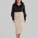 Силует моделі побудований так, щоб підкреслити фігуру без жорсткості й перевантаження. Висока посадка візуально структурує пропорції, допомагає зробити лінію талії більш виразною, а образ — більш зібраним. Прямий крій м’яко проходить по стегнах, не створюючи зайвого об’єму, і саме тому ця жіноча спідниця великих розмірів виглядає акуратно, впевнено й дуже сучасно.