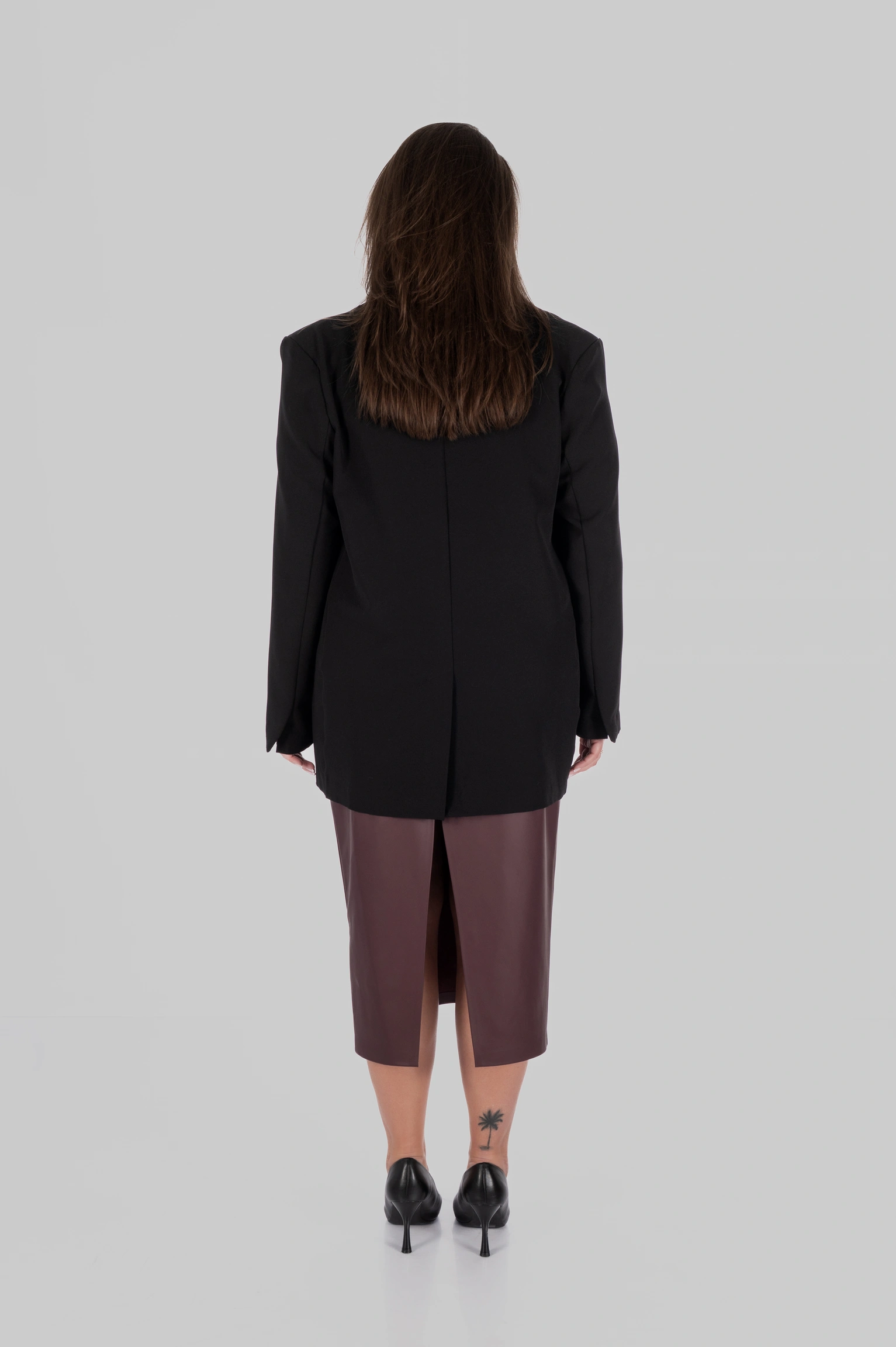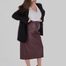 Ще одна сильна сторона цієї моделі — її стилістична гнучкість. Ця спідниця міді з еко-шкіри легко поєднується з сорочками, лонгслівами, базовими футболками, тонким трикотажем, джемперами та жакетами. У більш зібраних образах вона працює зі структурованим верхом і взуттям на підборах або лоферами. У повсякденних — з м’яким трикотажем, черевиками або мінімалістичними кросівками. У більш акцентних стилізаціях достатньо додати виразний верх, ремінь чи прикраси — і модель уже працює зовсім інакше.