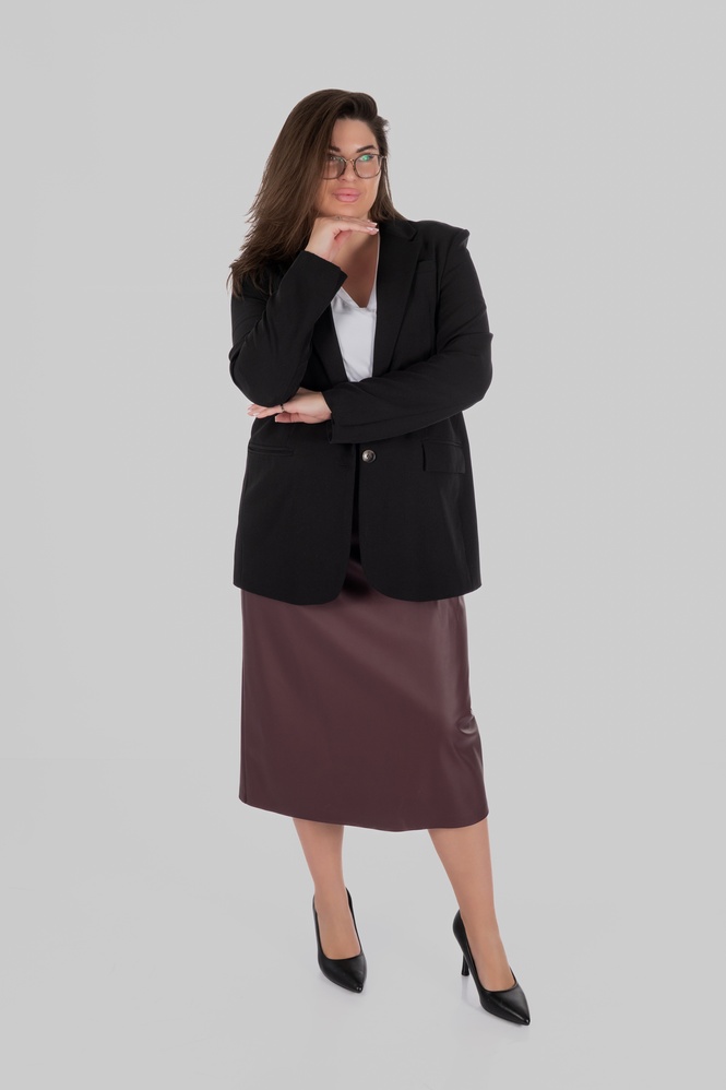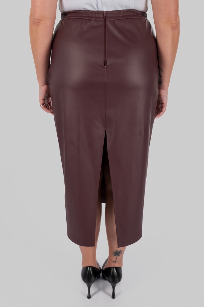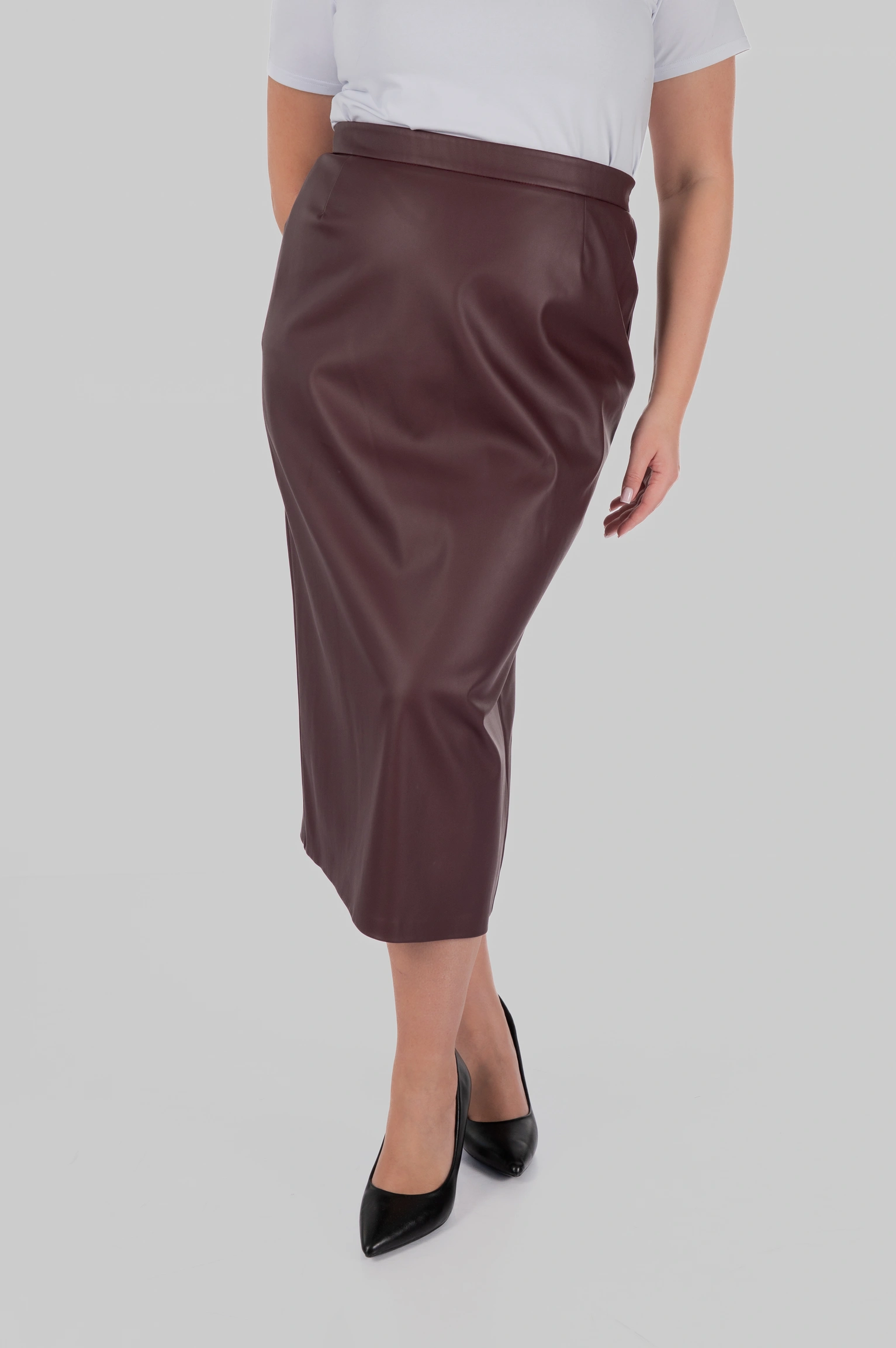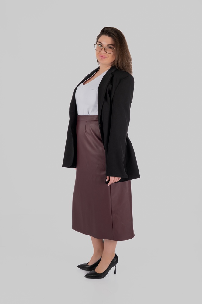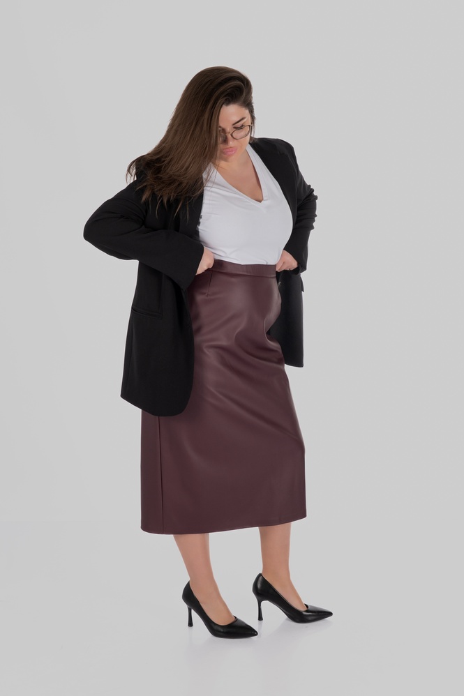 Окрема сила цієї моделі — матеріал. Еко-шкіра на замші дає саме той ефект, який складно отримати від звичайної еко-шкіри: зовні виріб виглядає структурно, гладко й виразно, а зсередини має м’яку замшеву основу, приємну до тіла. Завдяки цьому спідниця з еко-шкіри великих розмірів не сприймається жорсткою або «холодною». Вона комфортна в носінні, красиво тримає форму і водночас не виглядає грубо. Для plus-size сегмента це особливо важливо, тому що матеріал повинен не лише ефектно виглядати, а й правильно працювати на фігурі.