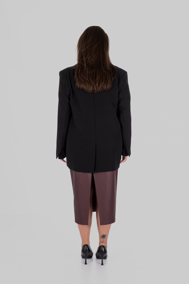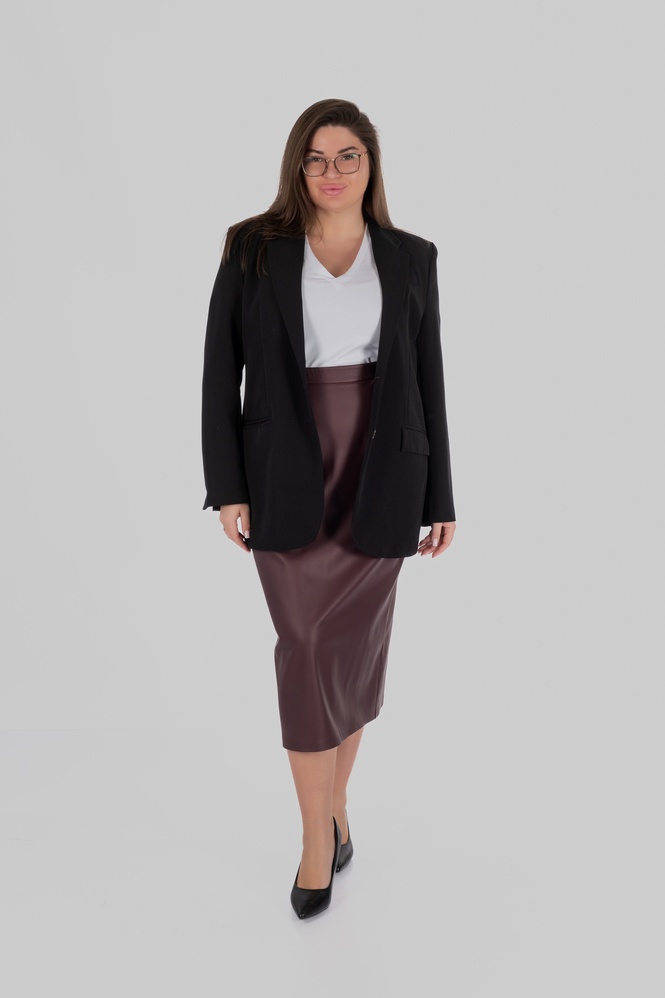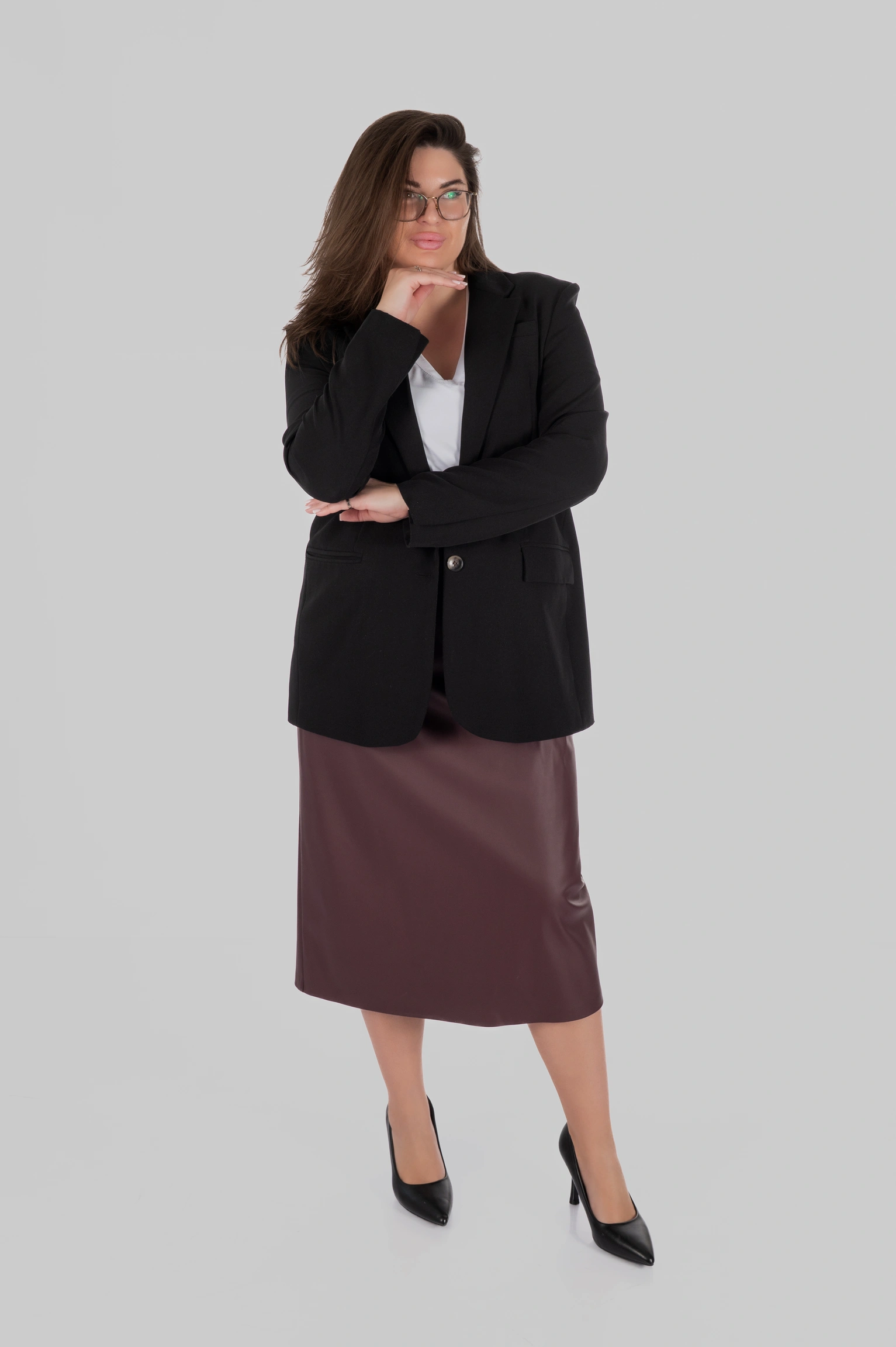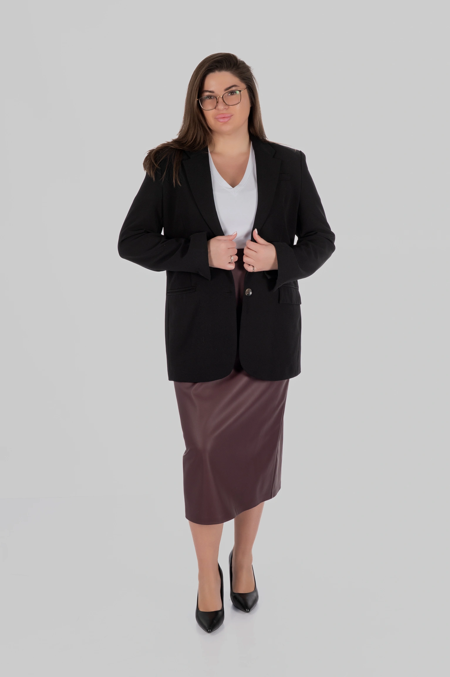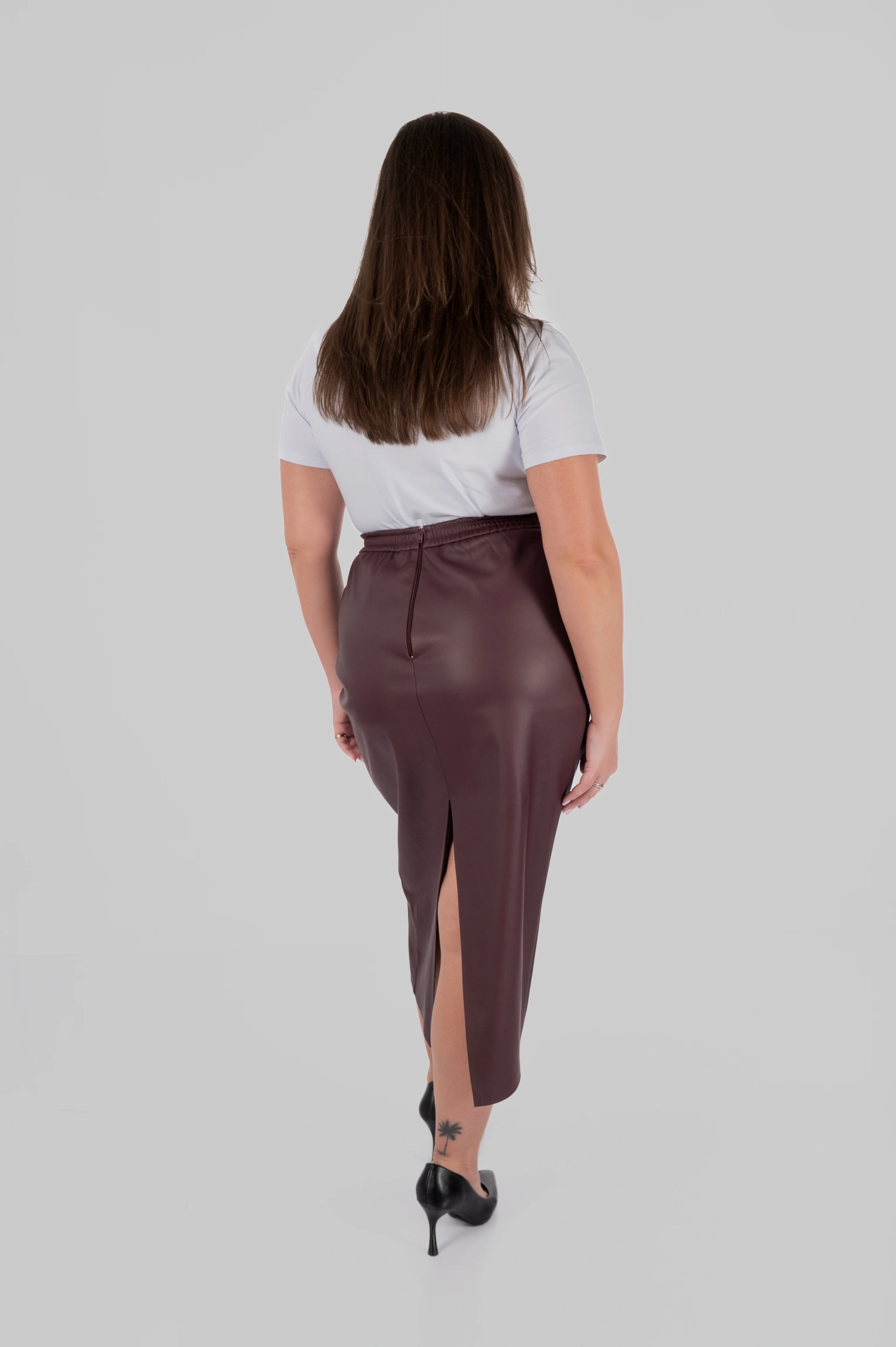 Окрема сила цієї моделі — матеріал. Еко-шкіра на замші дає саме той ефект, який складно отримати від звичайної еко-шкіри: зовні виріб виглядає структурно, гладко й виразно, а зсередини має м’яку замшеву основу, приємну до тіла. Завдяки цьому спідниця з еко-шкіри великих розмірів не сприймається жорсткою або «холодною». Вона комфортна в носінні, красиво тримає форму і водночас не виглядає грубо. Для plus-size сегмента це особливо важливо, тому що матеріал повинен не лише ефектно виглядати, а й правильно працювати на фігурі.