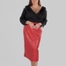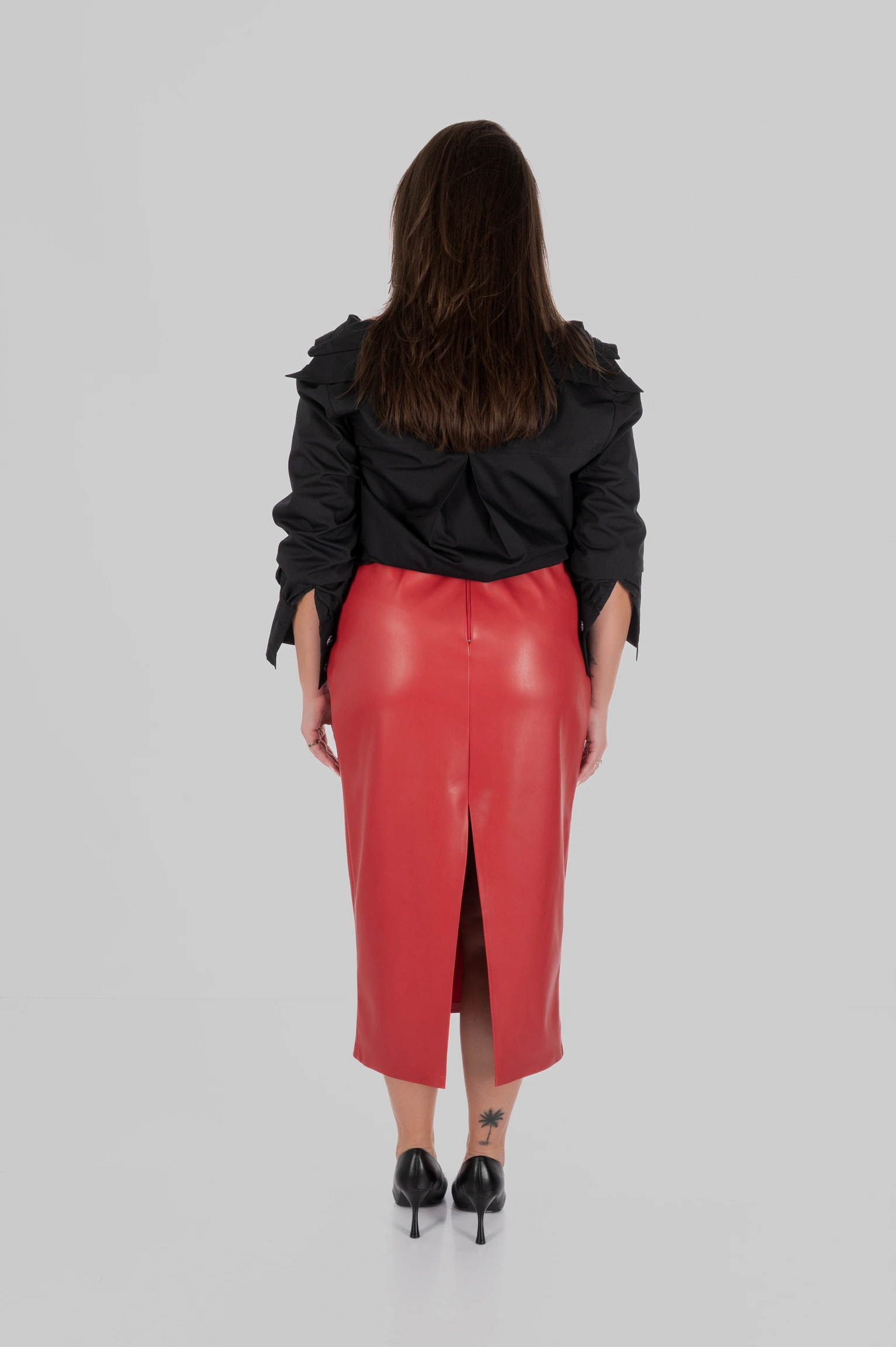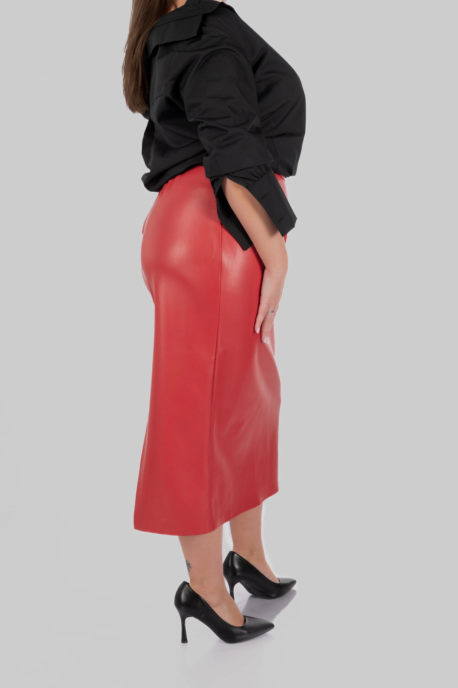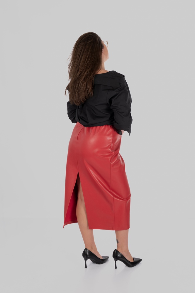 Ще одна сильна сторона цієї моделі — її стилістична гнучкість. Ця спідниця міді з еко-шкіри легко поєднується з сорочками, лонгслівами, базовими футболками, тонким трикотажем, джемперами та жакетами. У більш зібраних образах вона працює зі структурованим верхом і взуттям на підборах або лоферами. У повсякденних — з м’яким трикотажем, черевиками або мінімалістичними кросівками. У більш акцентних стилізаціях достатньо додати виразний верх, ремінь чи прикраси — і модель уже працює зовсім інакше.