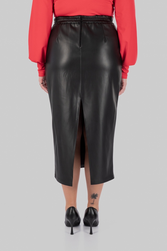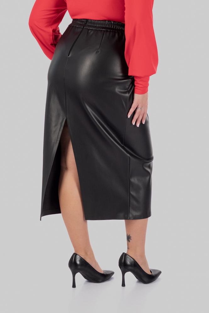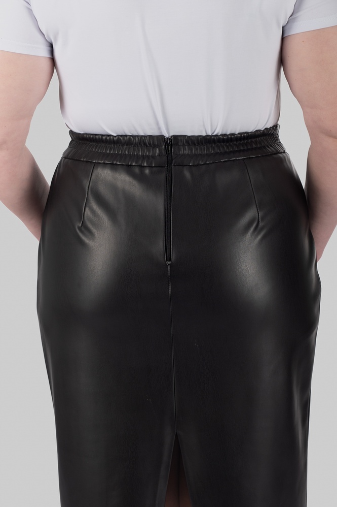 Окрема сила цієї моделі — матеріал. Еко-шкіра на замші дає саме той ефект, який складно отримати від звичайної еко-шкіри: зовні виріб виглядає структурно, гладко й виразно, а зсередини має м’яку замшеву основу, приємну до тіла. Завдяки цьому спідниця з еко-шкіри великих розмірів не сприймається жорсткою або «холодною». Вона комфортна в носінні, красиво тримає форму і водночас не виглядає грубо. Для plus-size сегмента це особливо важливо, тому що матеріал повинен не лише ефектно виглядати, а й правильно працювати на фігурі.