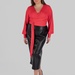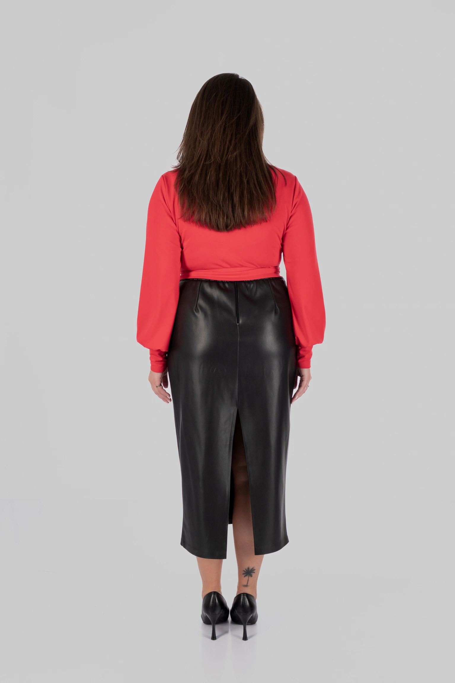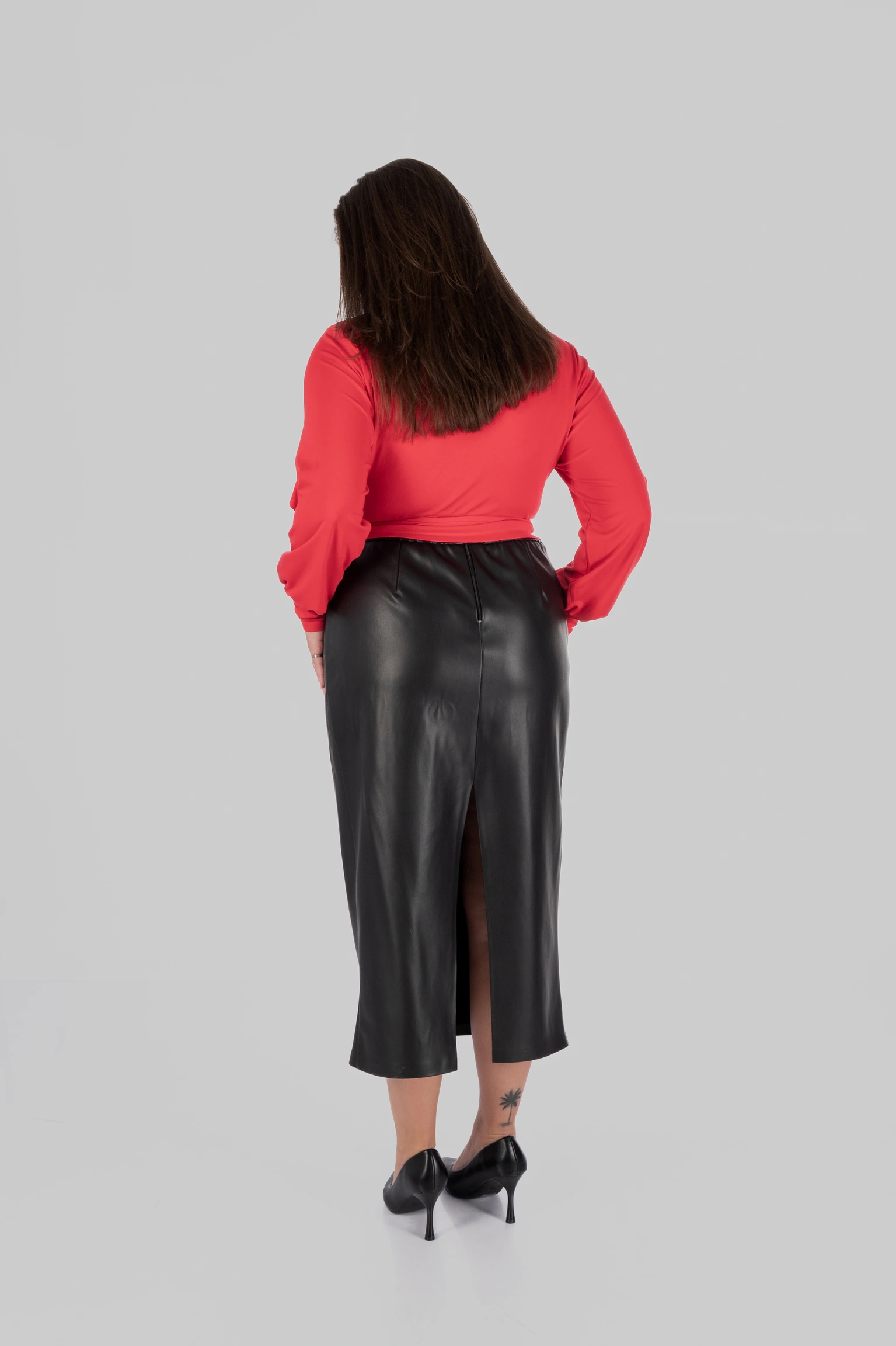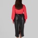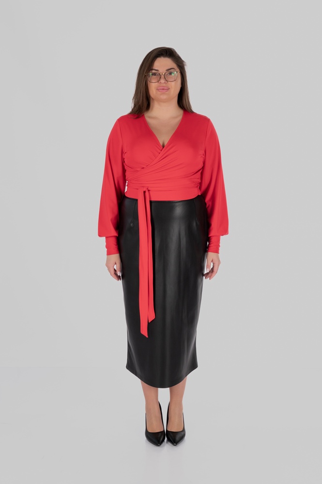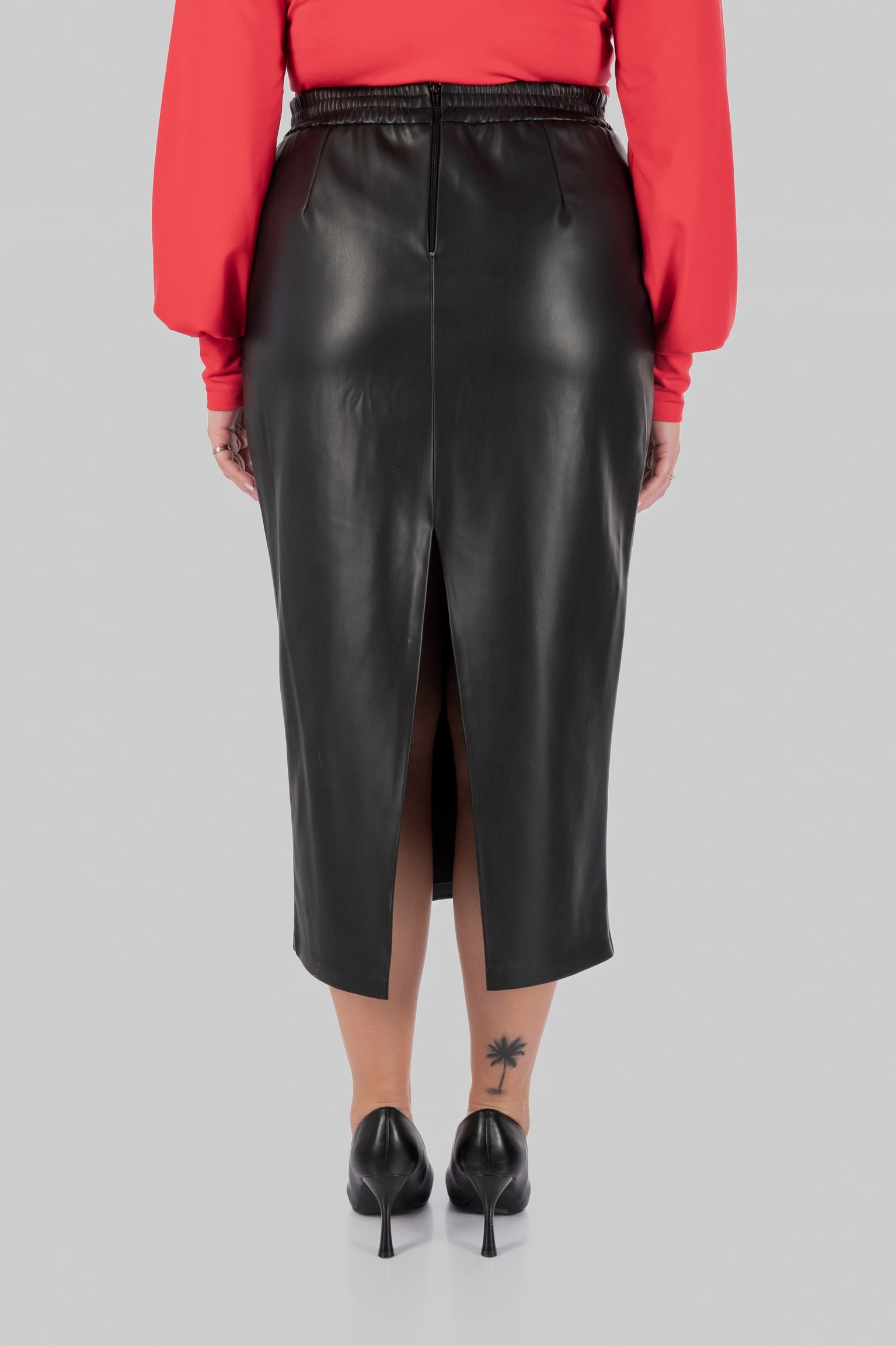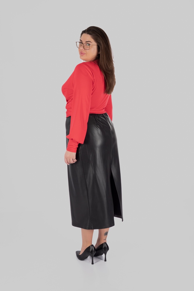 Ще одна сильна сторона цієї моделі — її стилістична гнучкість. Ця спідниця міді з еко-шкіри легко поєднується з сорочками, лонгслівами, базовими футболками, тонким трикотажем, джемперами та жакетами. У більш зібраних образах вона працює зі структурованим верхом і взуттям на підборах або лоферами. У повсякденних — з м’яким трикотажем, черевиками або мінімалістичними кросівками. У більш акцентних стилізаціях достатньо додати виразний верх, ремінь чи прикраси — і модель уже працює зовсім інакше.