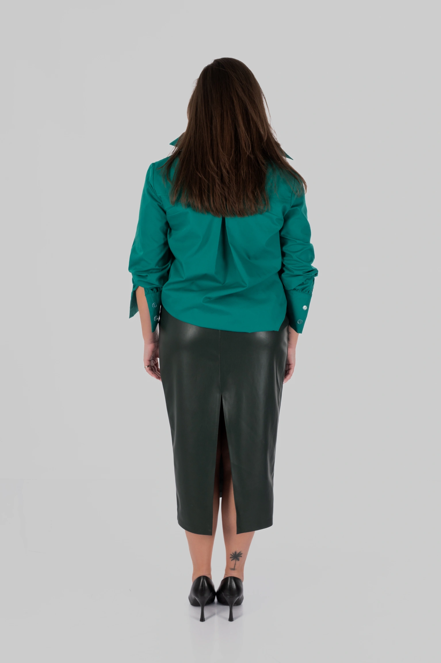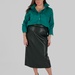Ще одна сильна сторона цієї моделі — її стилістична гнучкість. Ця спідниця міді з еко-шкіри легко поєднується з сорочками, лонгслівами, базовими футболками, тонким трикотажем, джемперами та жакетами. У більш зібраних образах вона працює зі структурованим верхом і взуттям на підборах або лоферами. У повсякденних — з м’яким трикотажем, черевиками або мінімалістичними кросівками. У більш акцентних стилізаціях достатньо додати виразний верх, ремінь чи прикраси — і модель уже працює зовсім інакше.