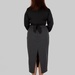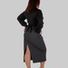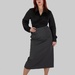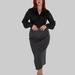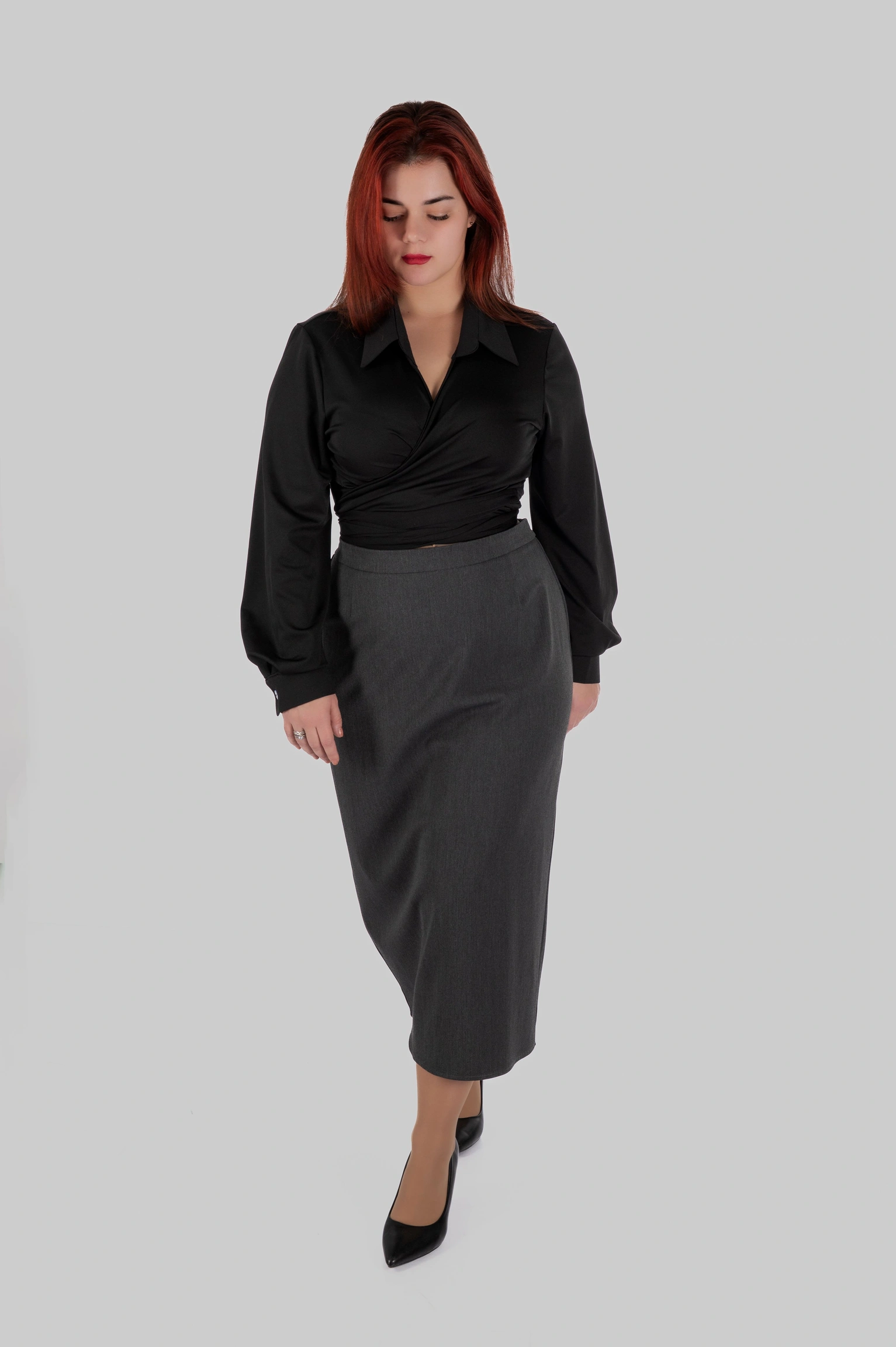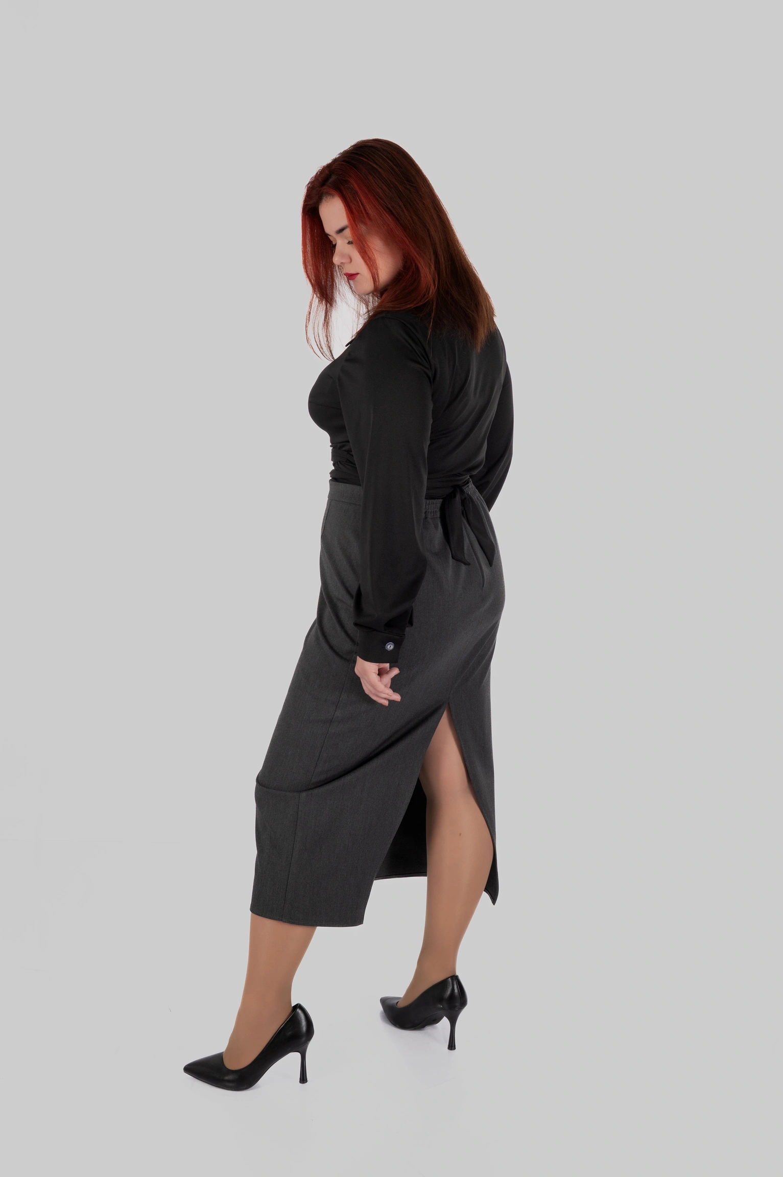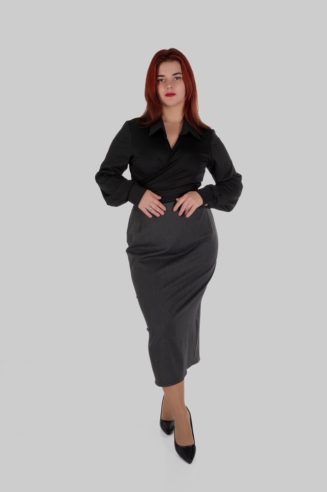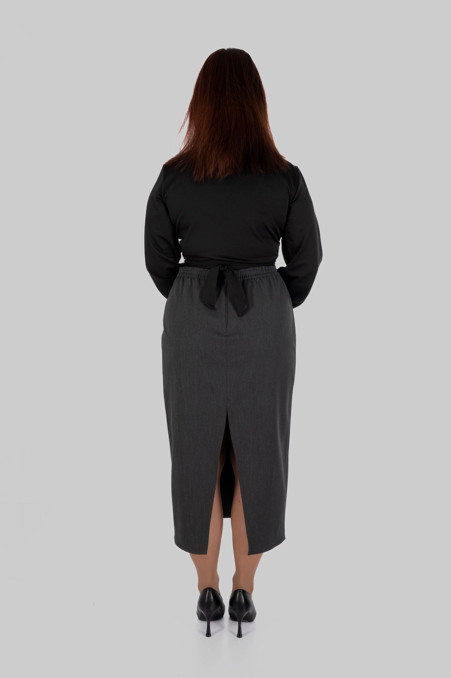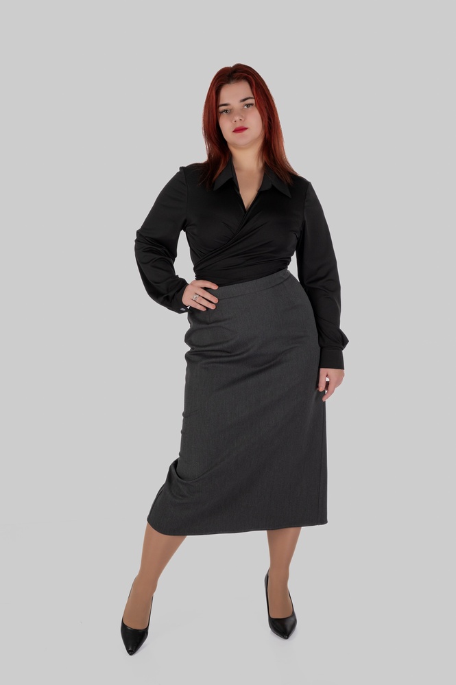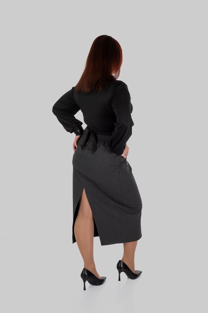 Силует моделі побудований так, щоб формувати акуратну геометрію і підкреслювати пропорції. Висока посадка допомагає візуально структурувати фігуру і зробити лінію талії більш виразною. Прямий крій м’яко проходить по стегнах, не створюючи зайвого об’єму, завдяки чому жіноча спідниця великих розмірів виглядає акуратно, сучасно і впевнено.