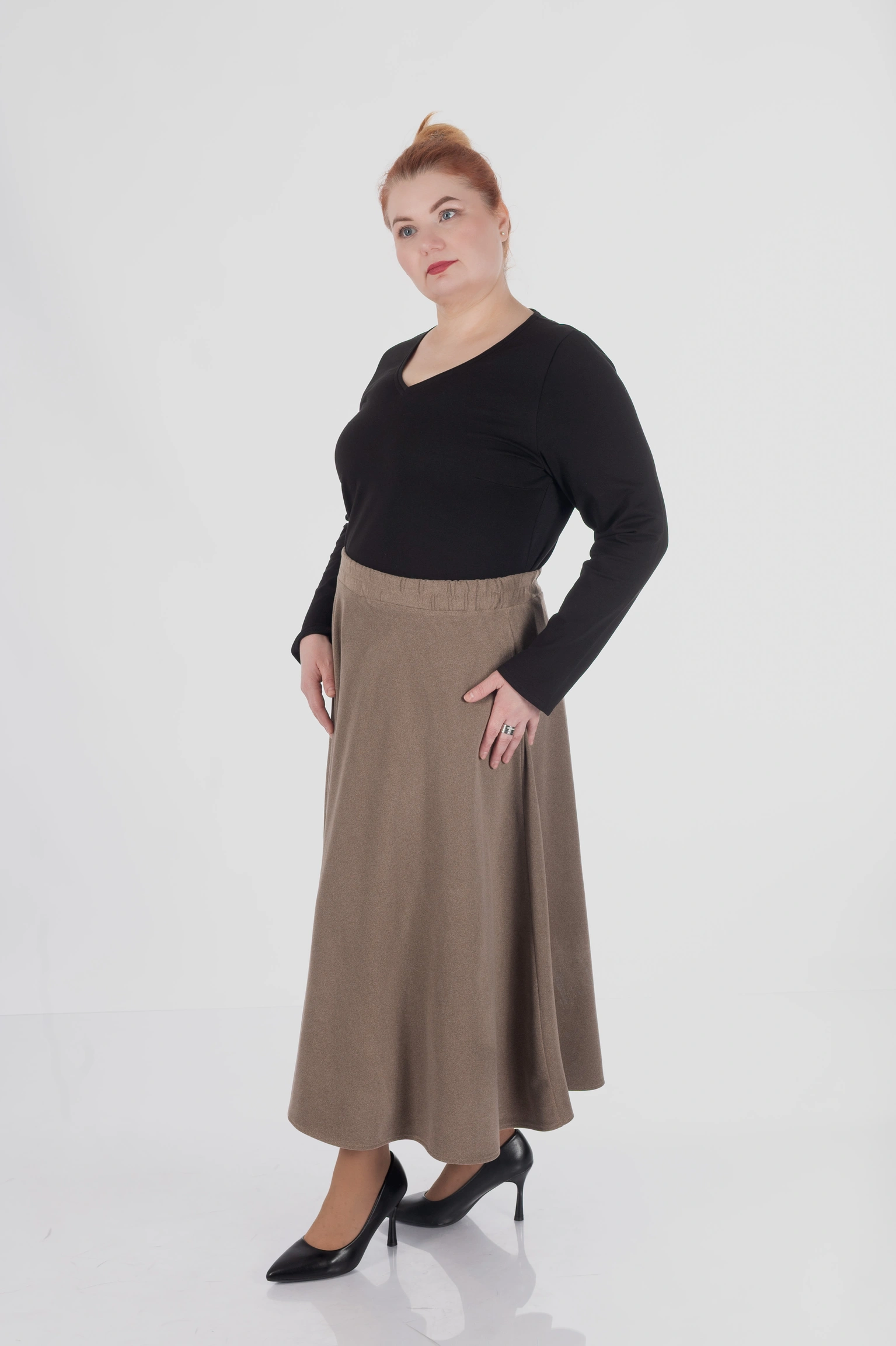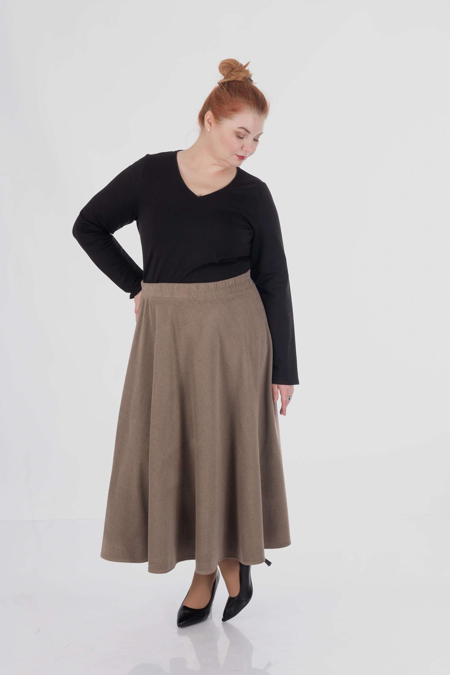 Спідниця MILA легко стилізується з теплими джемперами, светрами, лонгслівами, сорочками або жакетами. У повсякденних образах вона створює відчуття затишку, а у більш зібраних стилізаціях виглядає елегантно та стримано.