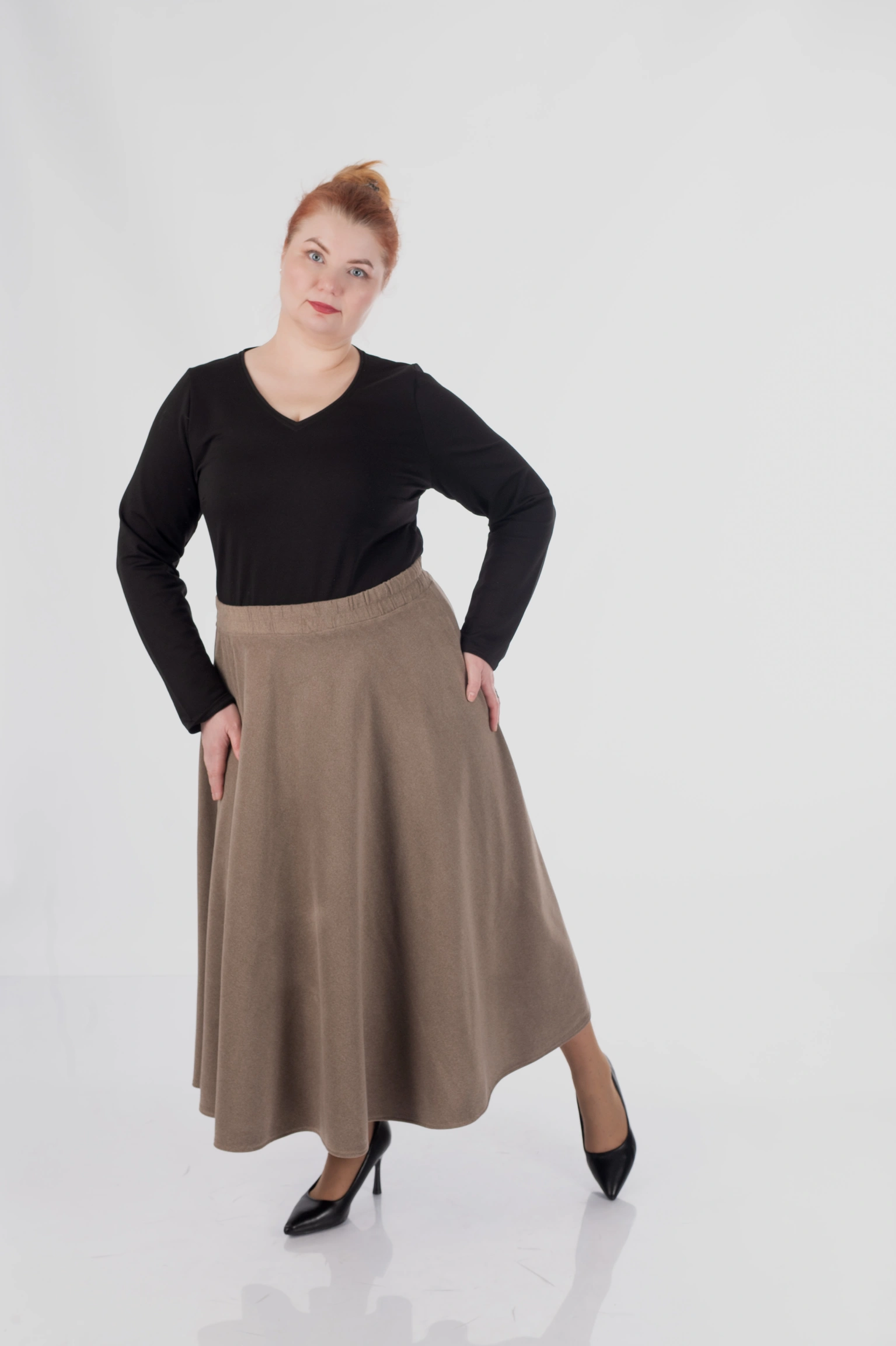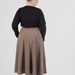 Силует — напівсонце. Тканина м’яко розкривається від талії і формує красиві природні фалди, які додають образу руху та легкості. Такий крій виглядає елегантно і особливо добре працює у гардеробі plus size, тому що створює більш збалансовані пропорції.