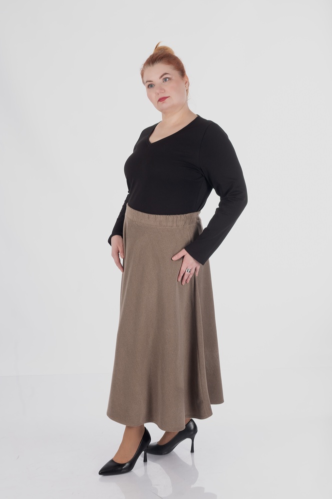 Спідниця виконана з щільного трикотажу «Пума» — еластичного двостороннього матеріалу з м’яким ворсовим ефектом. Завдяки своїй структурі тканина має благородну матову поверхню, яка візуально нагадує замшу. Матеріал приємний на дотик, добре утримує тепло і водночас залишається дихаючим завдяки високому вмісту бавовни.