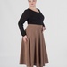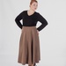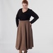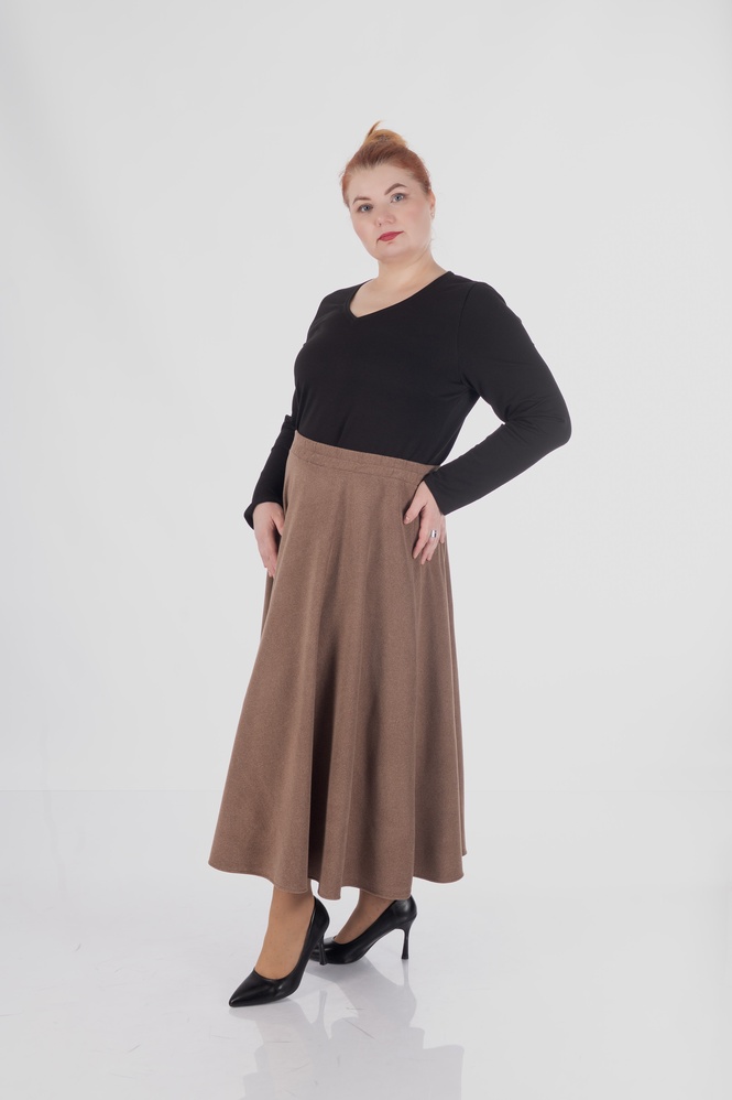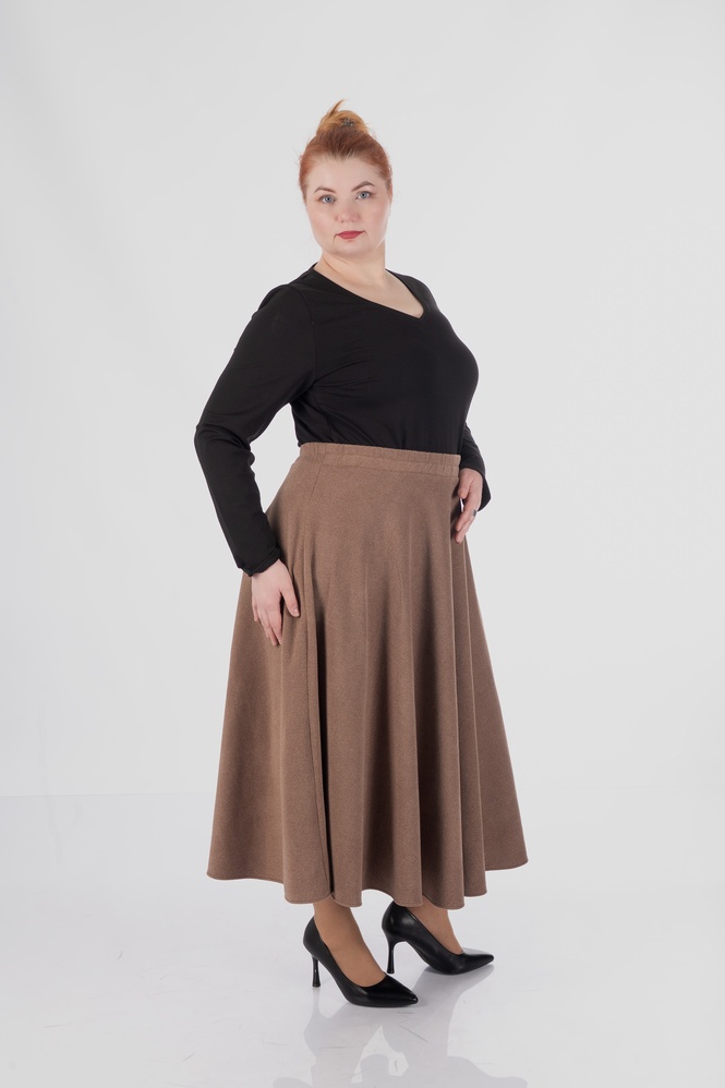 Силует — напівсонце. Тканина м’яко розкривається від талії і формує красиві природні фалди, які додають образу руху та легкості. Такий крій виглядає елегантно і особливо добре працює у гардеробі plus size, тому що створює більш збалансовані пропорції.