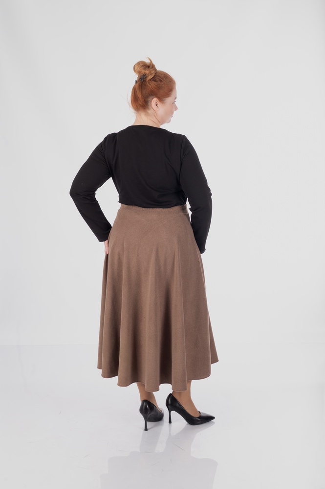 Спідниця виконана з щільного трикотажу «Пума» — еластичного двостороннього матеріалу з м’яким ворсовим ефектом. Завдяки своїй структурі тканина має благородну матову поверхню, яка візуально нагадує замшу. Матеріал приємний на дотик, добре утримує тепло і водночас залишається дихаючим завдяки високому вмісту бавовни.
