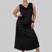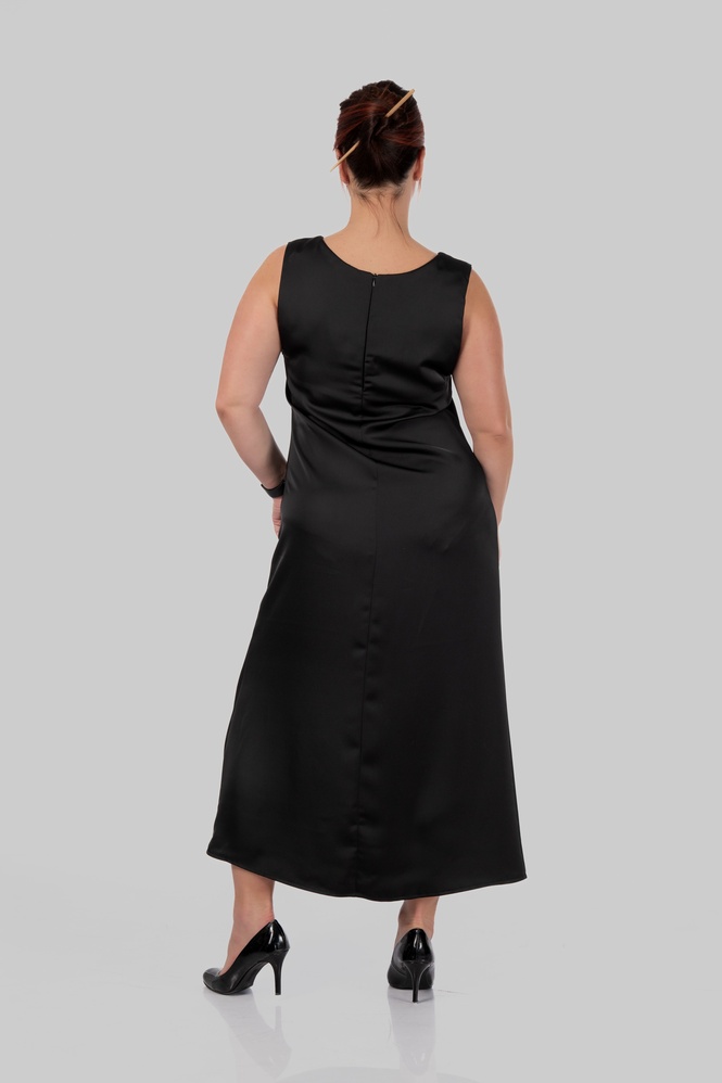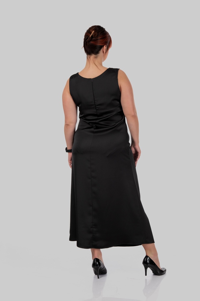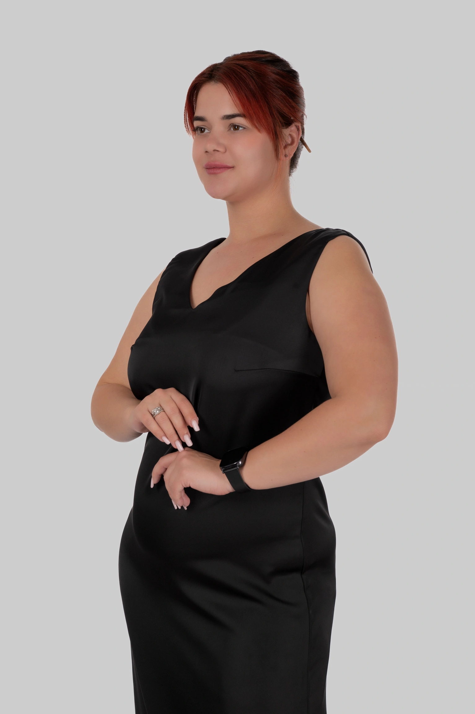 Силует працює дуже грамотно: за рахунок прямого, злегка розширеного крою сукня не “прилипає” до тіла, а створює плавну вертикаль. Це візуально витягує зріст і робить фігуру більш пропорційною.