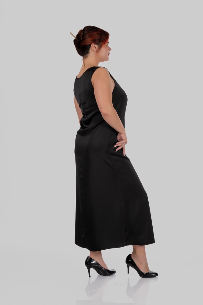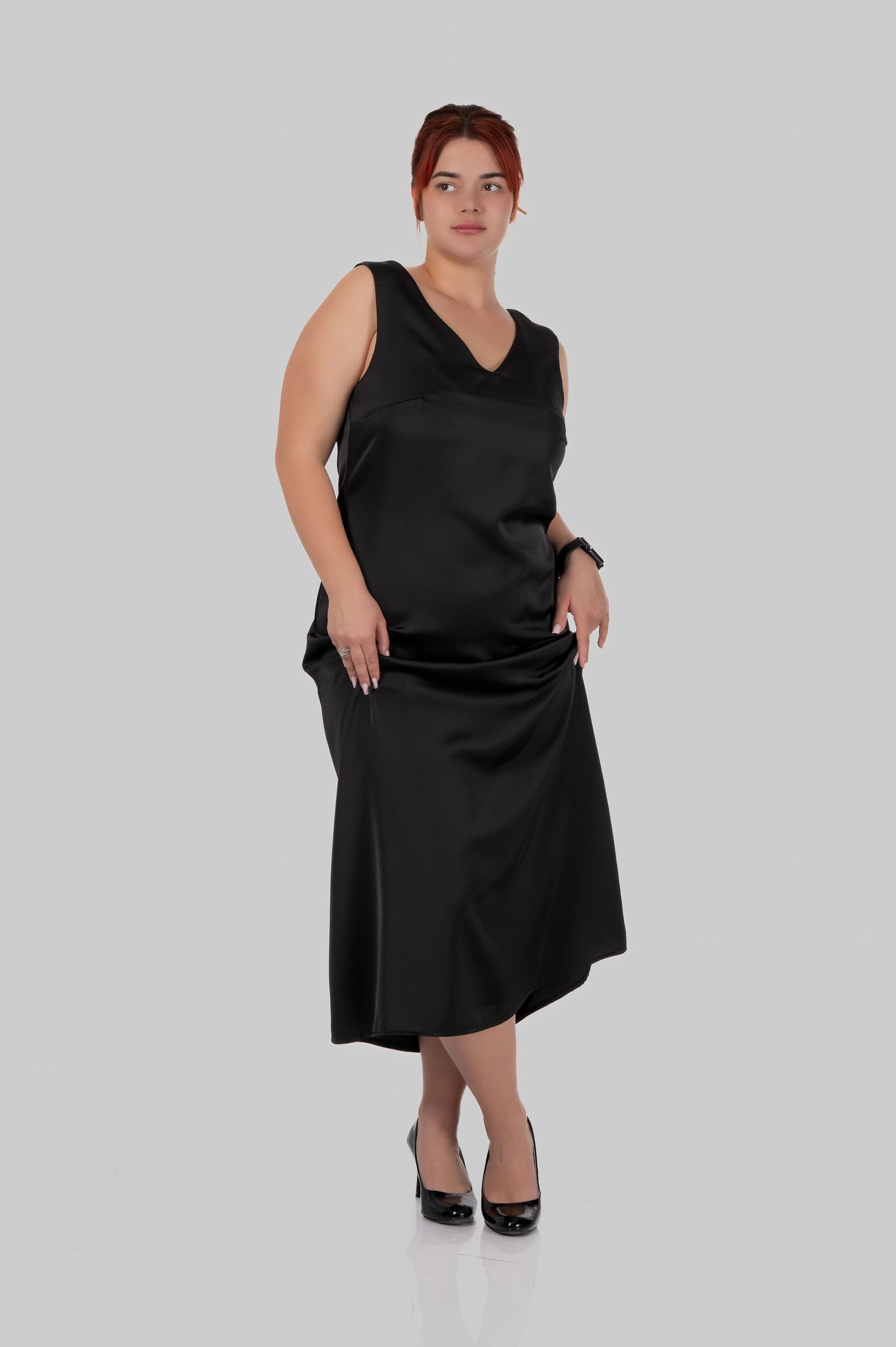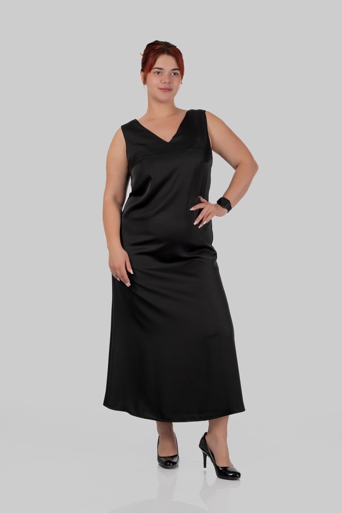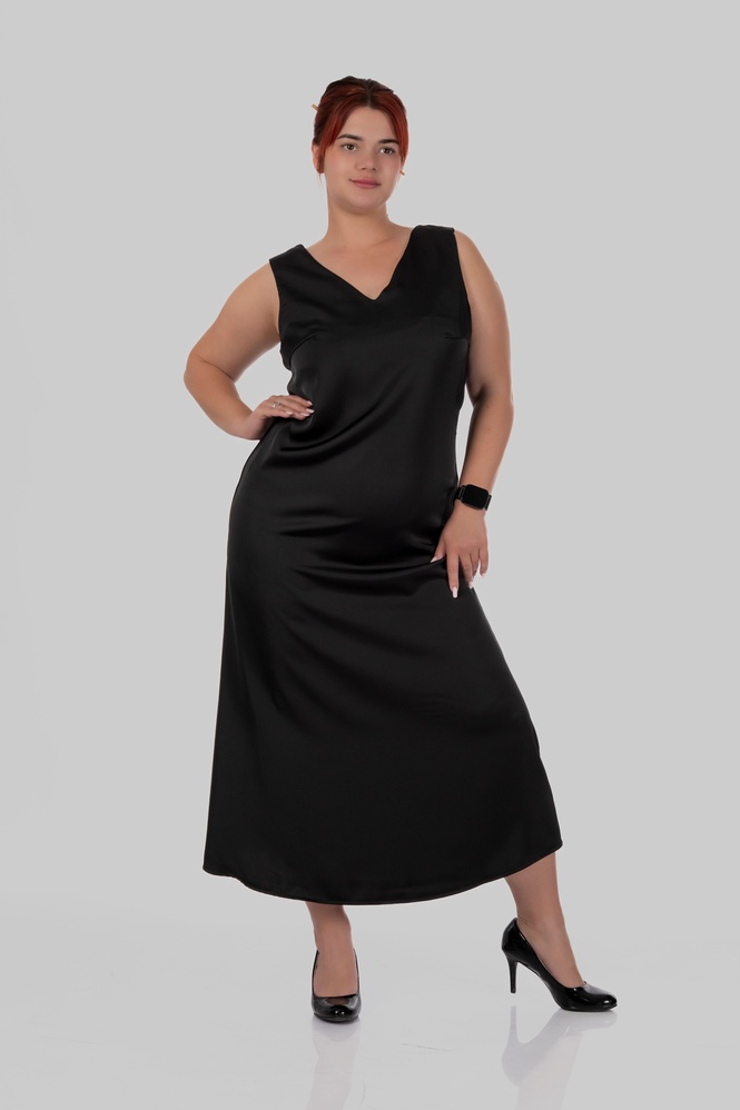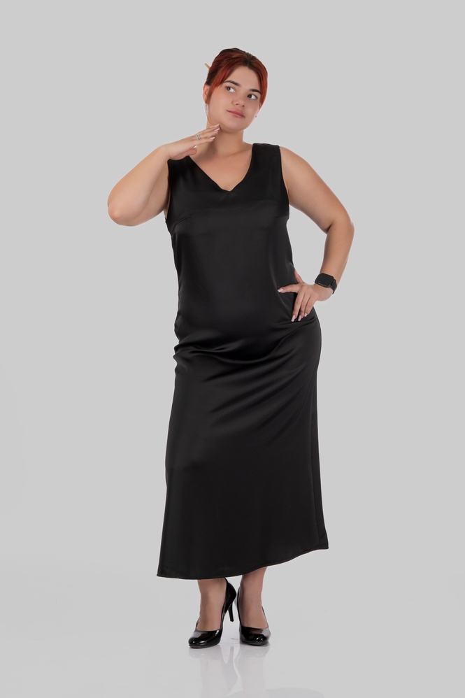 Це класична сукня-комбінація, або сукня в білизняному стилі, яка м’яко лягає по фігурі, не обтягує, а делікатно повторює лінії тіла. Вона не підкреслює те, що хочеться сховати — вона вирівнює силует і робить його більш витягнутим і зібраним.