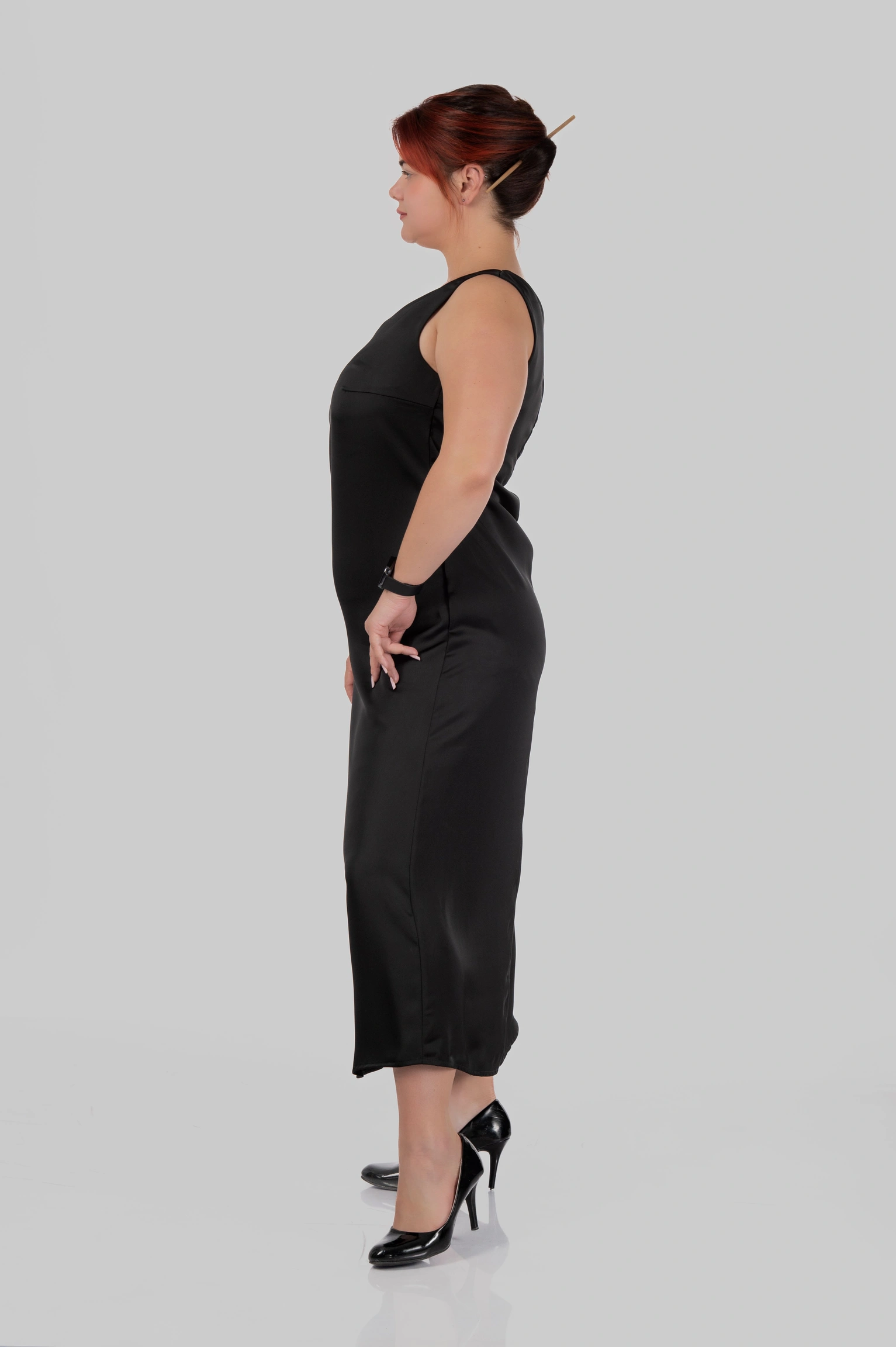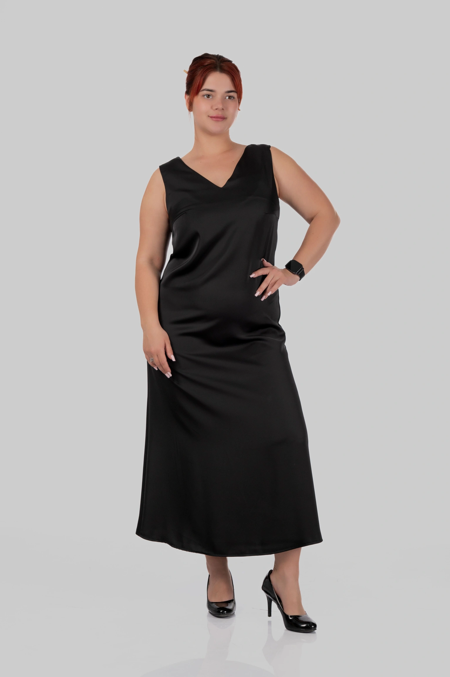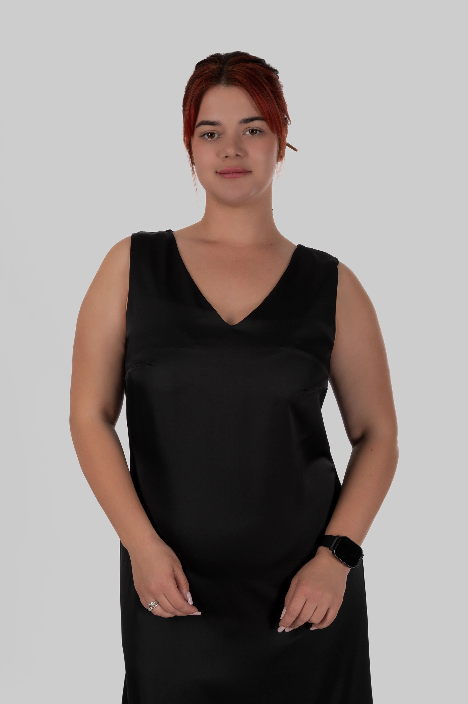 Це класична сукня-комбінація, або сукня в білизняному стилі, яка м’яко лягає по фігурі, не обтягує, а делікатно повторює лінії тіла. Вона не підкреслює те, що хочеться сховати — вона вирівнює силует і робить його більш витягнутим і зібраним.