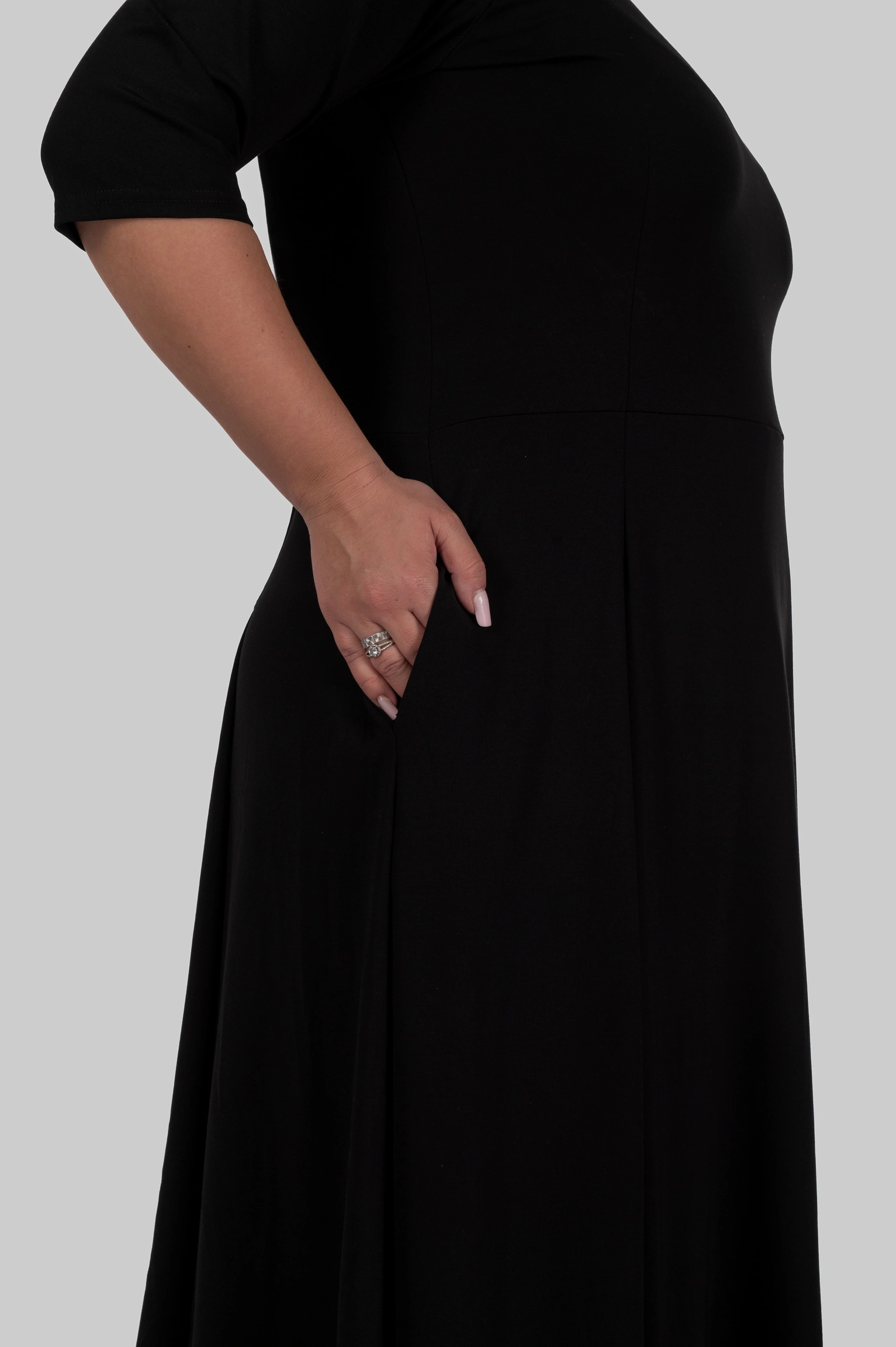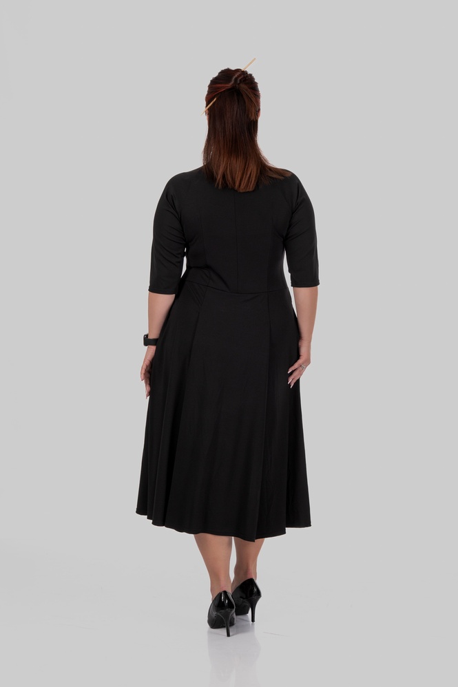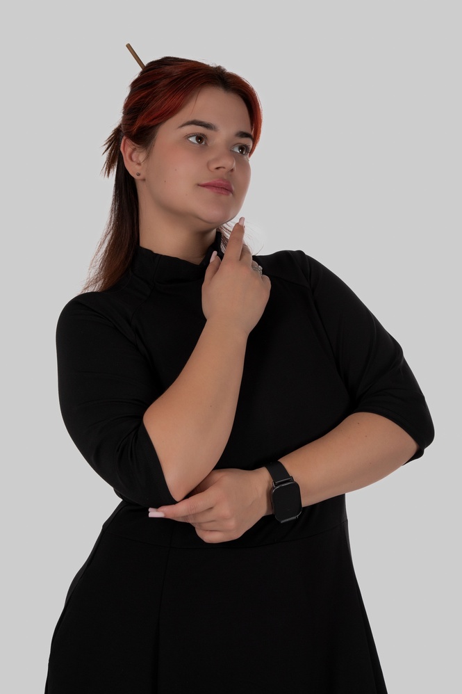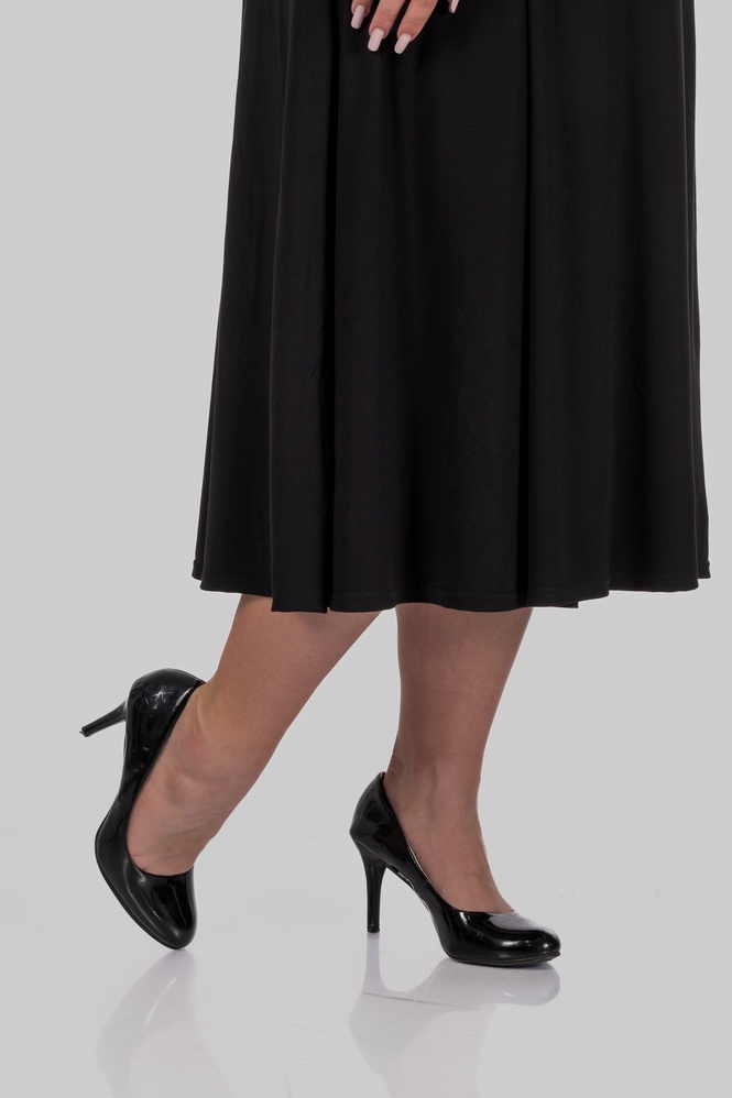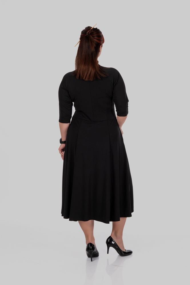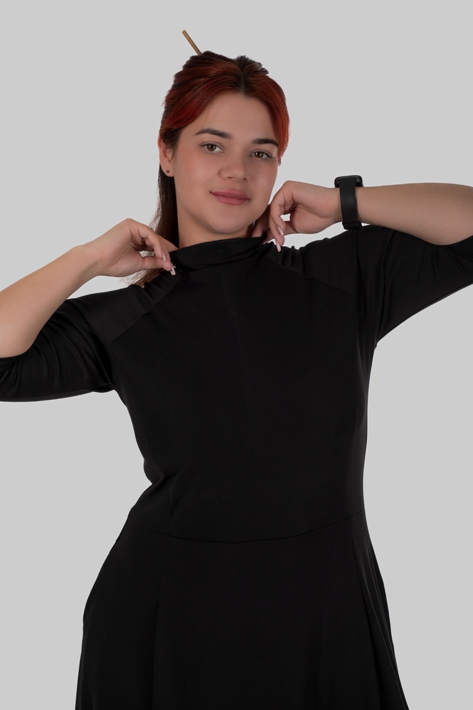 Відрізна талія створює правильні пропорції, а розкльошена спідниця м’яко розходиться вниз, не додаючи об’єму, а навпаки — балансуючи фігуру. Сукня красиво рухається при ходьбі і виглядає легко, навіть у темному кольорі.