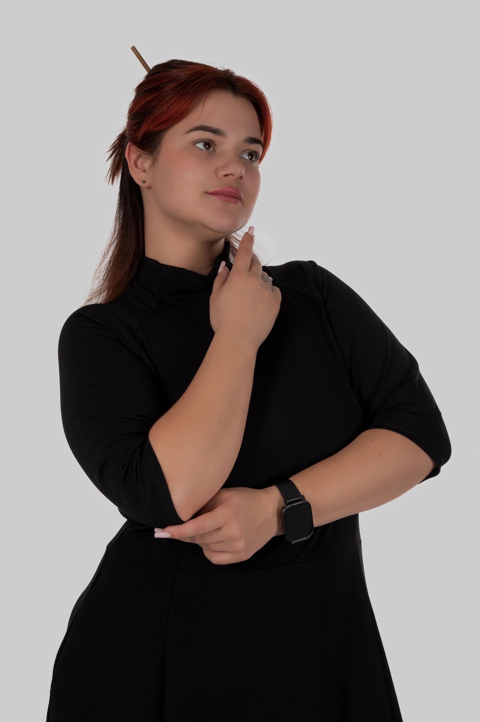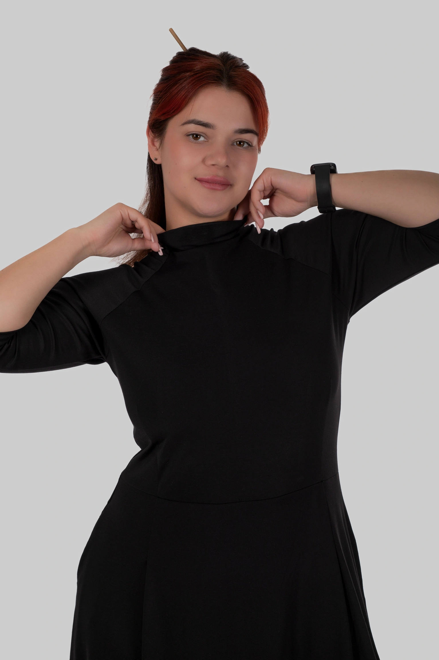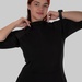 Вона працює одразу в кількох напрямках: витягує фігуру, підкреслює талію і при цьому не обтягує те, що не хочеться підкреслювати. Комір-стійка формує акуратну вертикаль, додає стриманої елегантності і візуально “збирає” верх, роблячи образ більш дорогим.