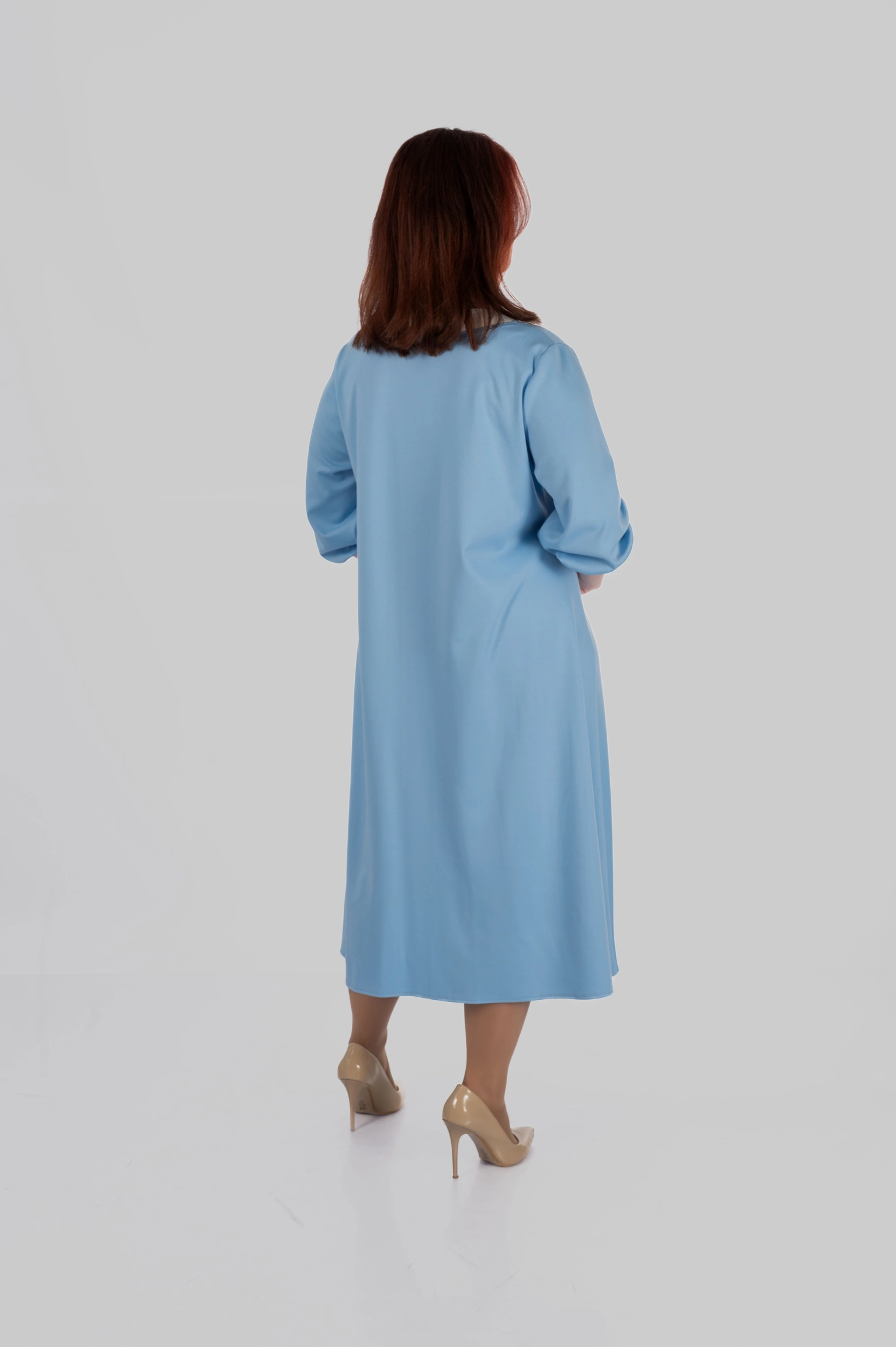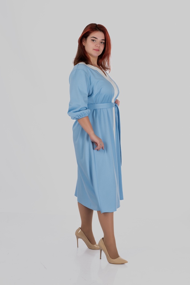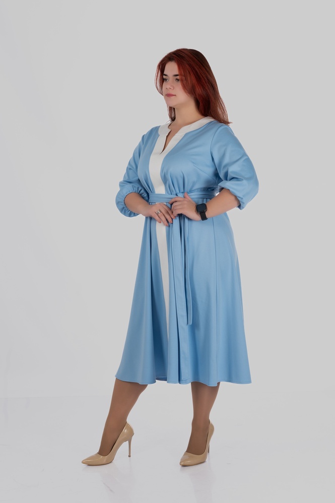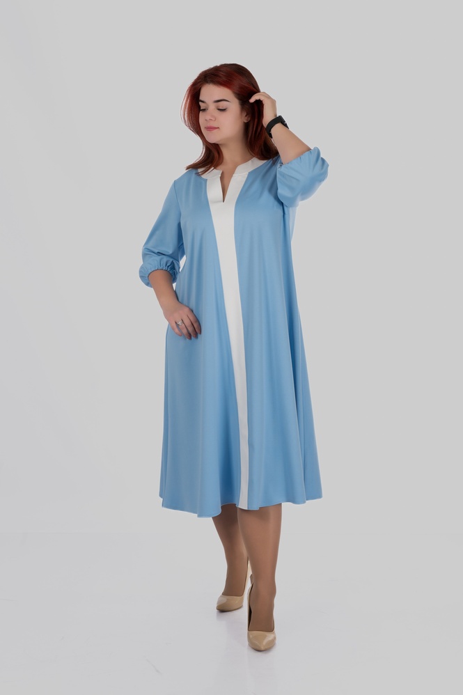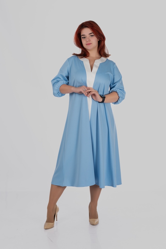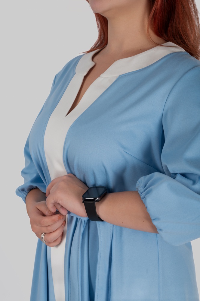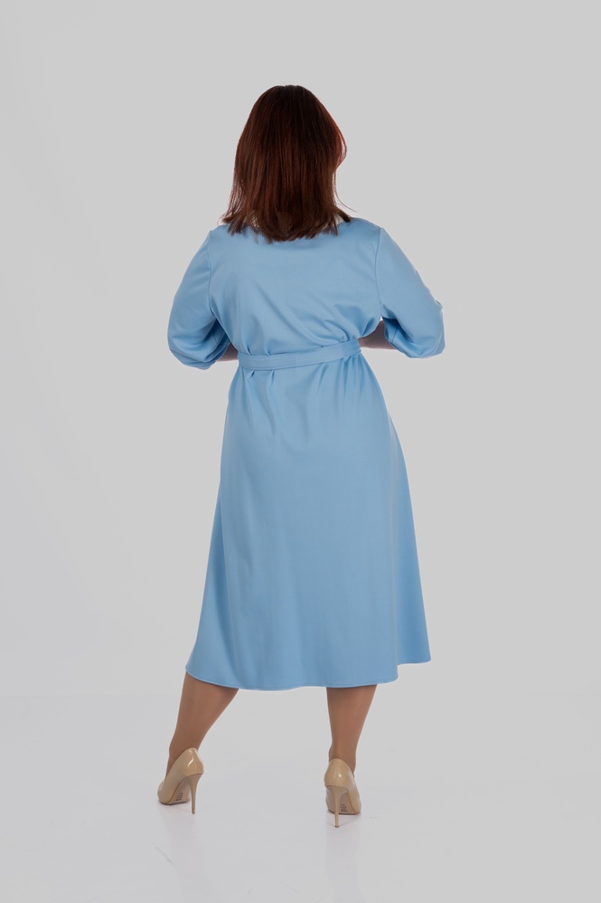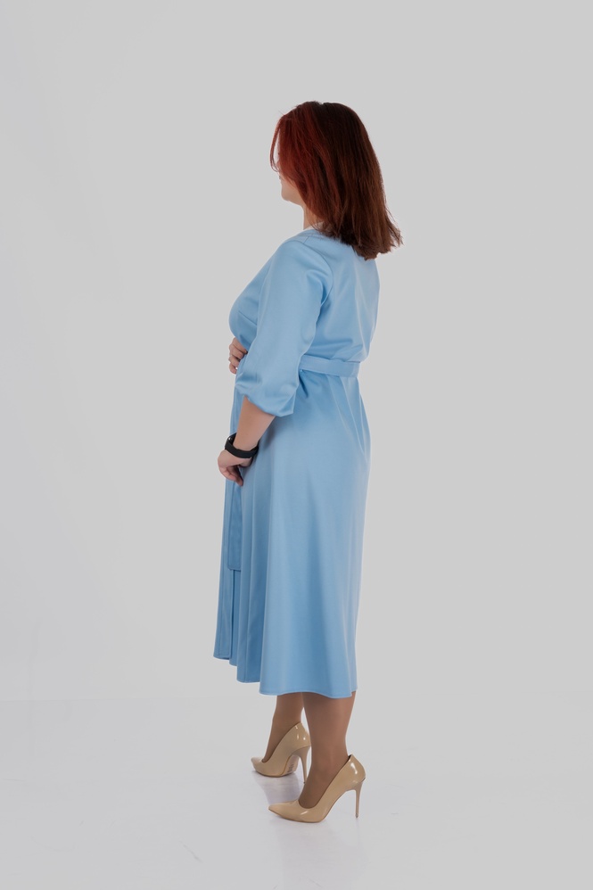 Продуманий крій моделі створений з урахуванням посадки для розмірів 50–64. Сукня формує витягнутий силует, виглядає легкою і елегантною та залишається комфортною протягом усього дня.