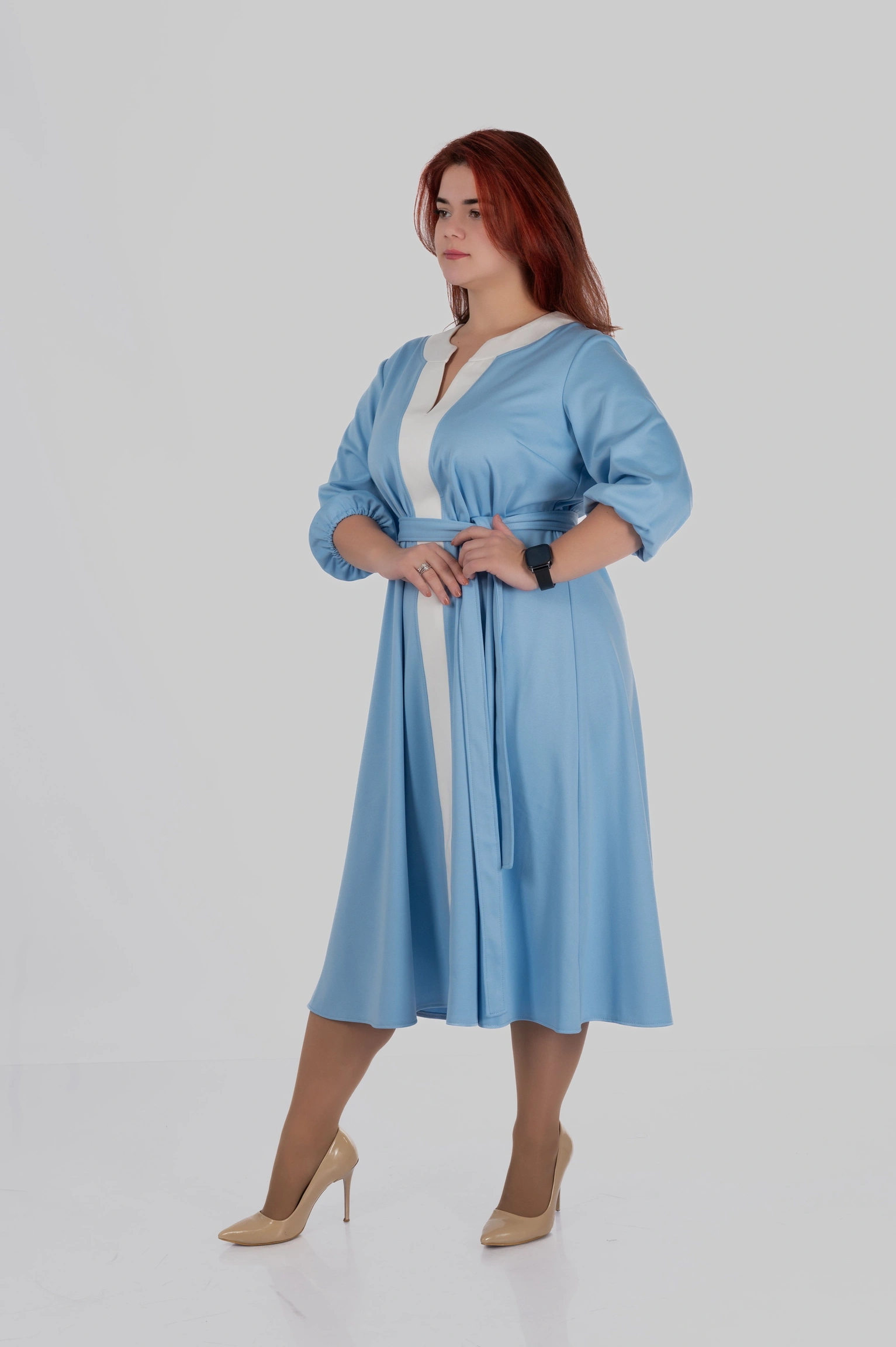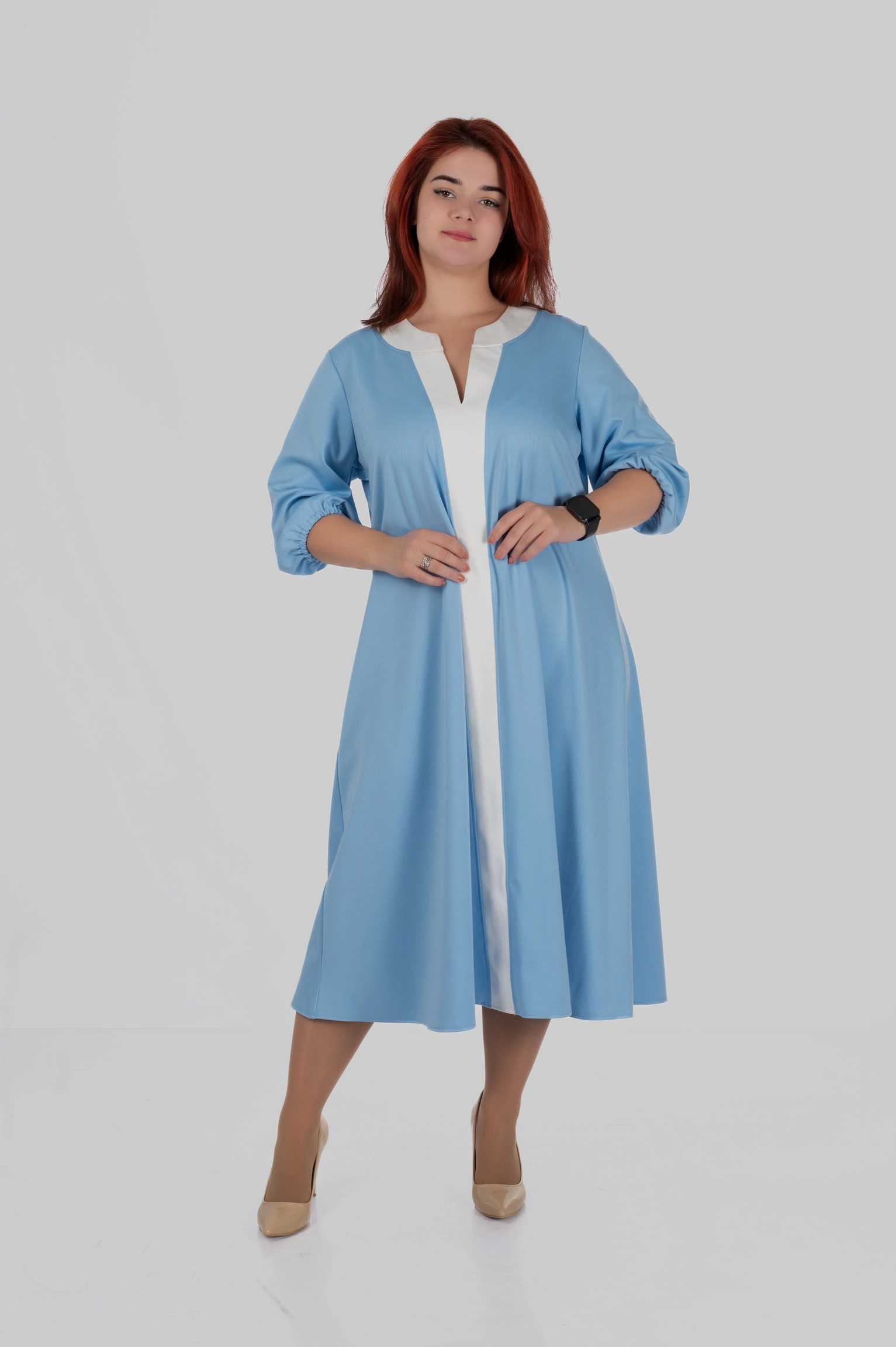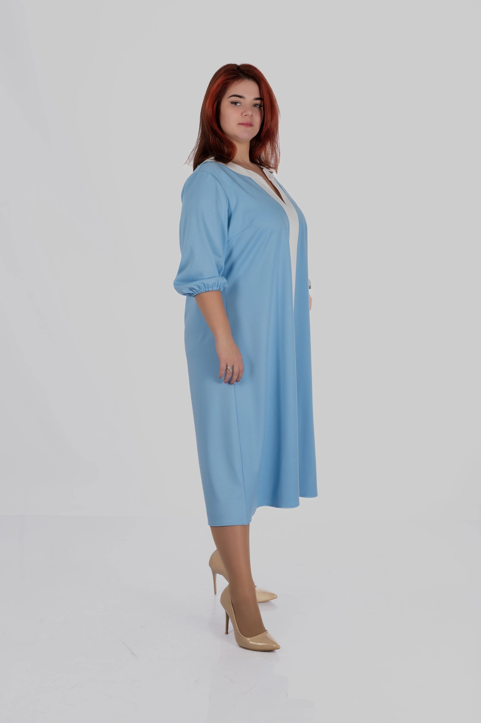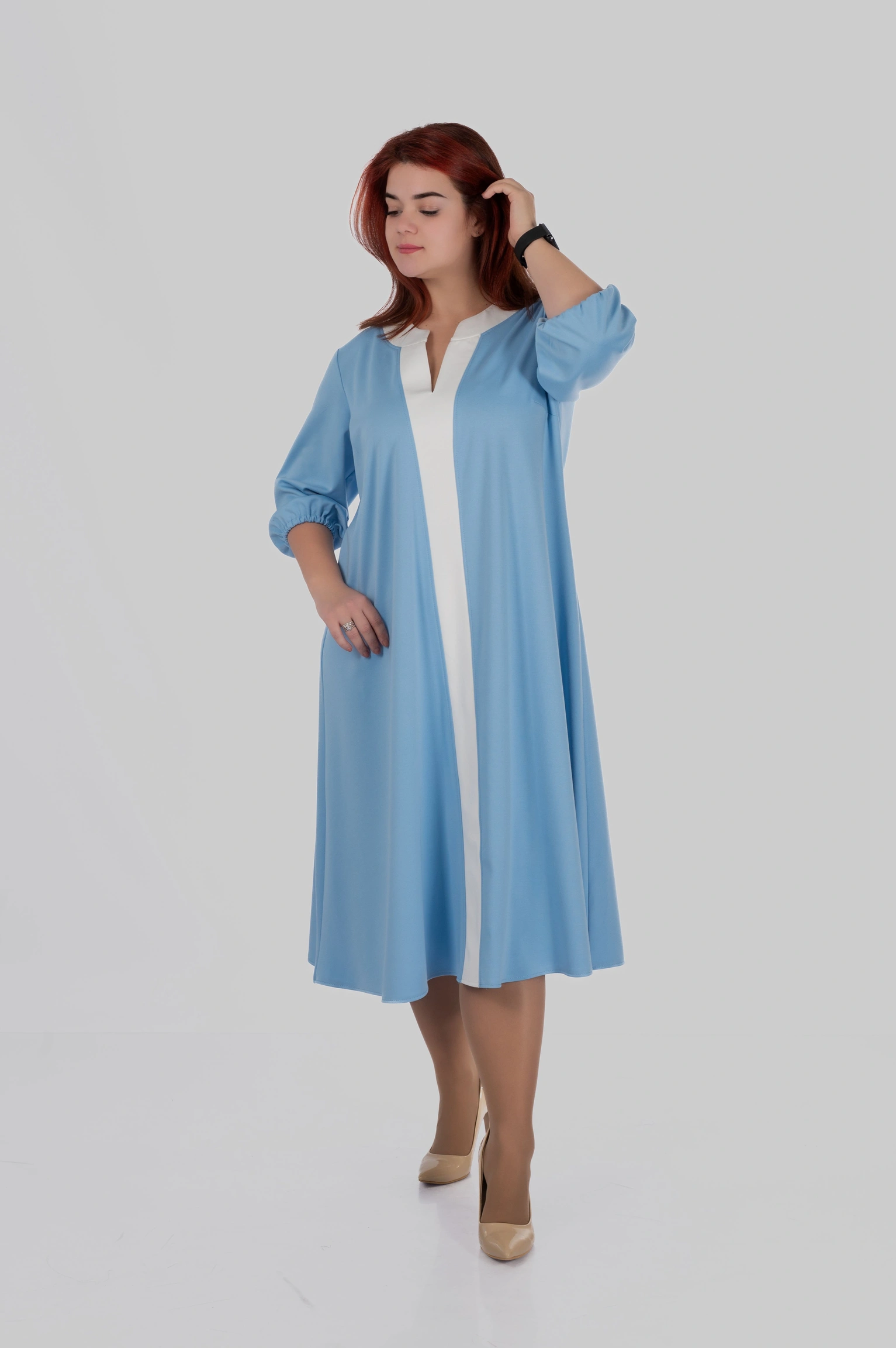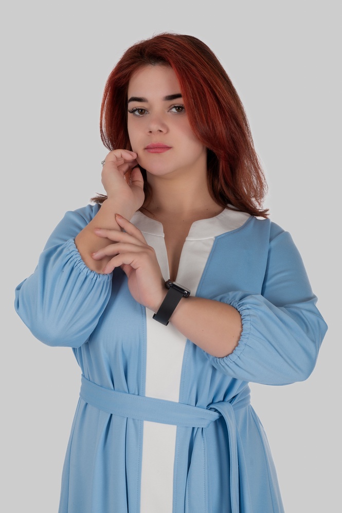 Продуманий крій моделі створений з урахуванням посадки для розмірів 50–64. Сукня формує витягнутий силует, виглядає легкою і елегантною та залишається комфортною протягом усього дня.