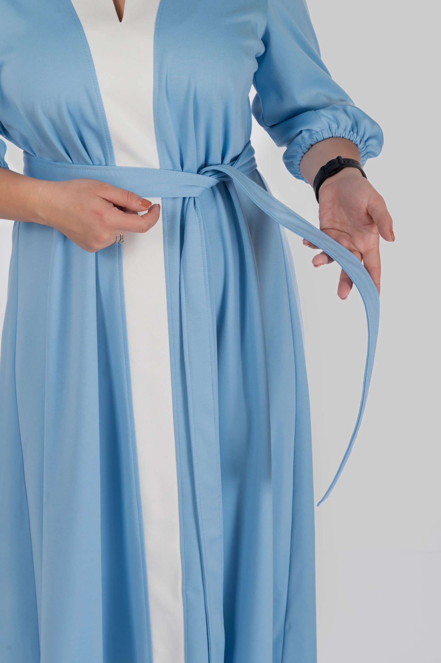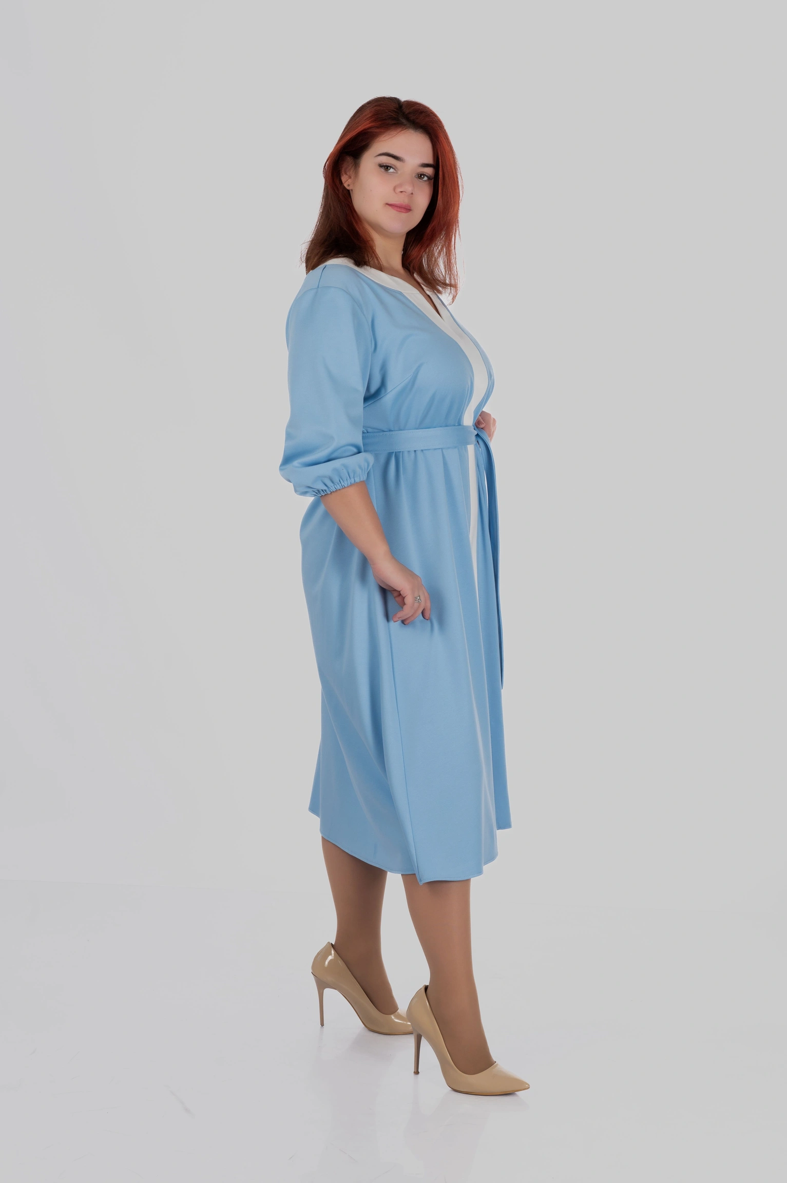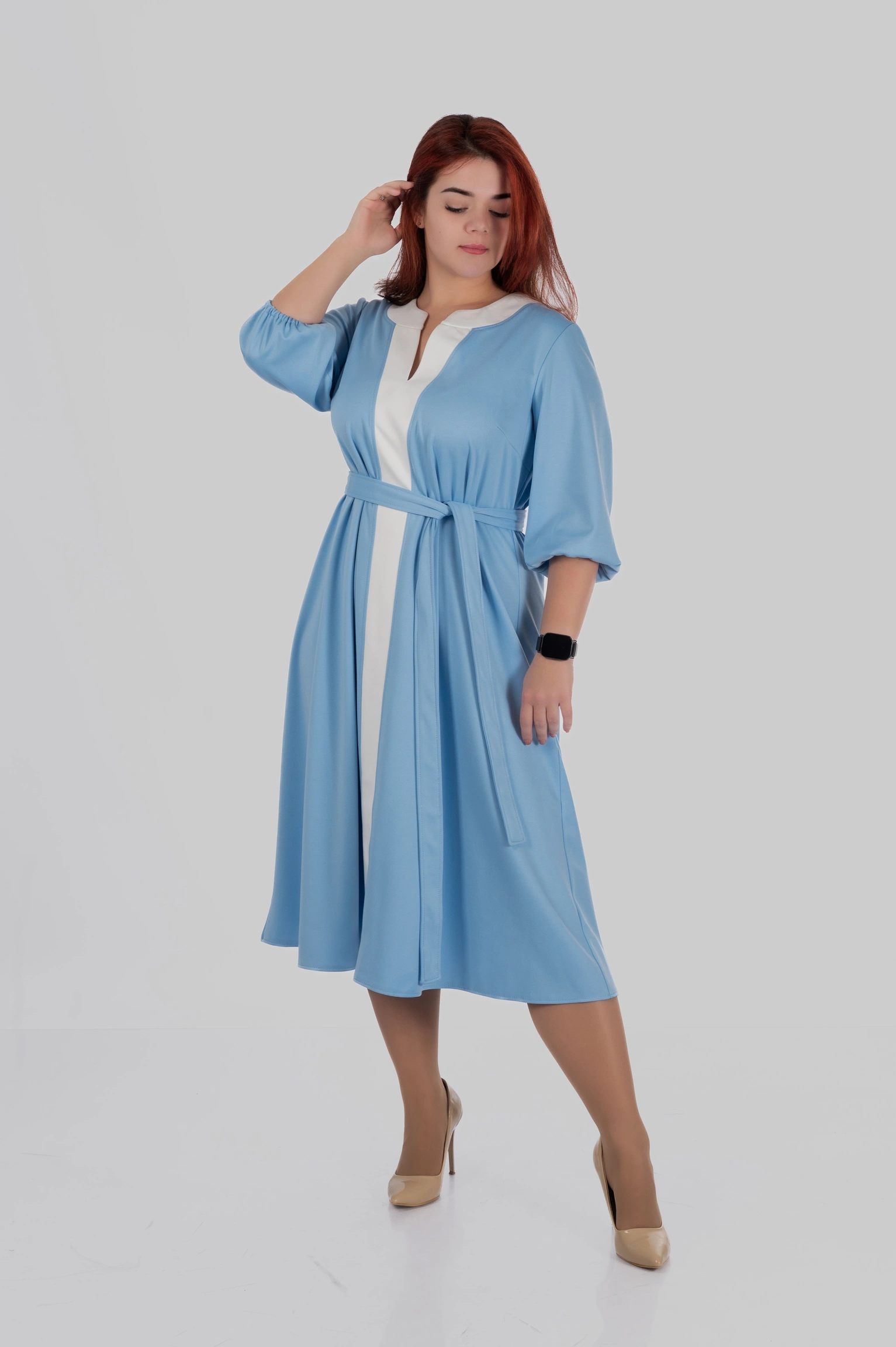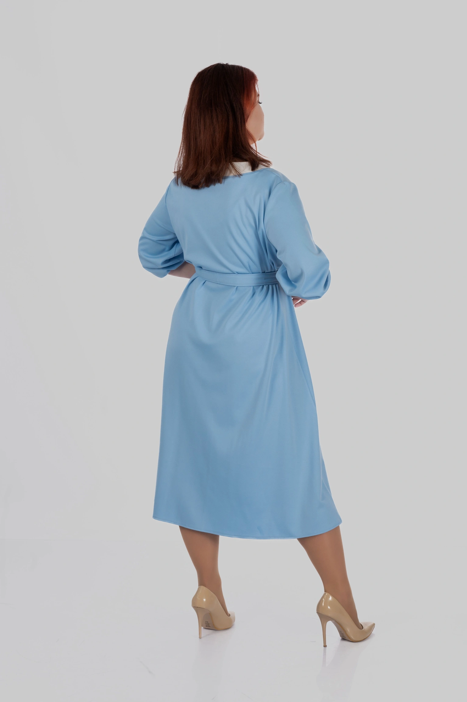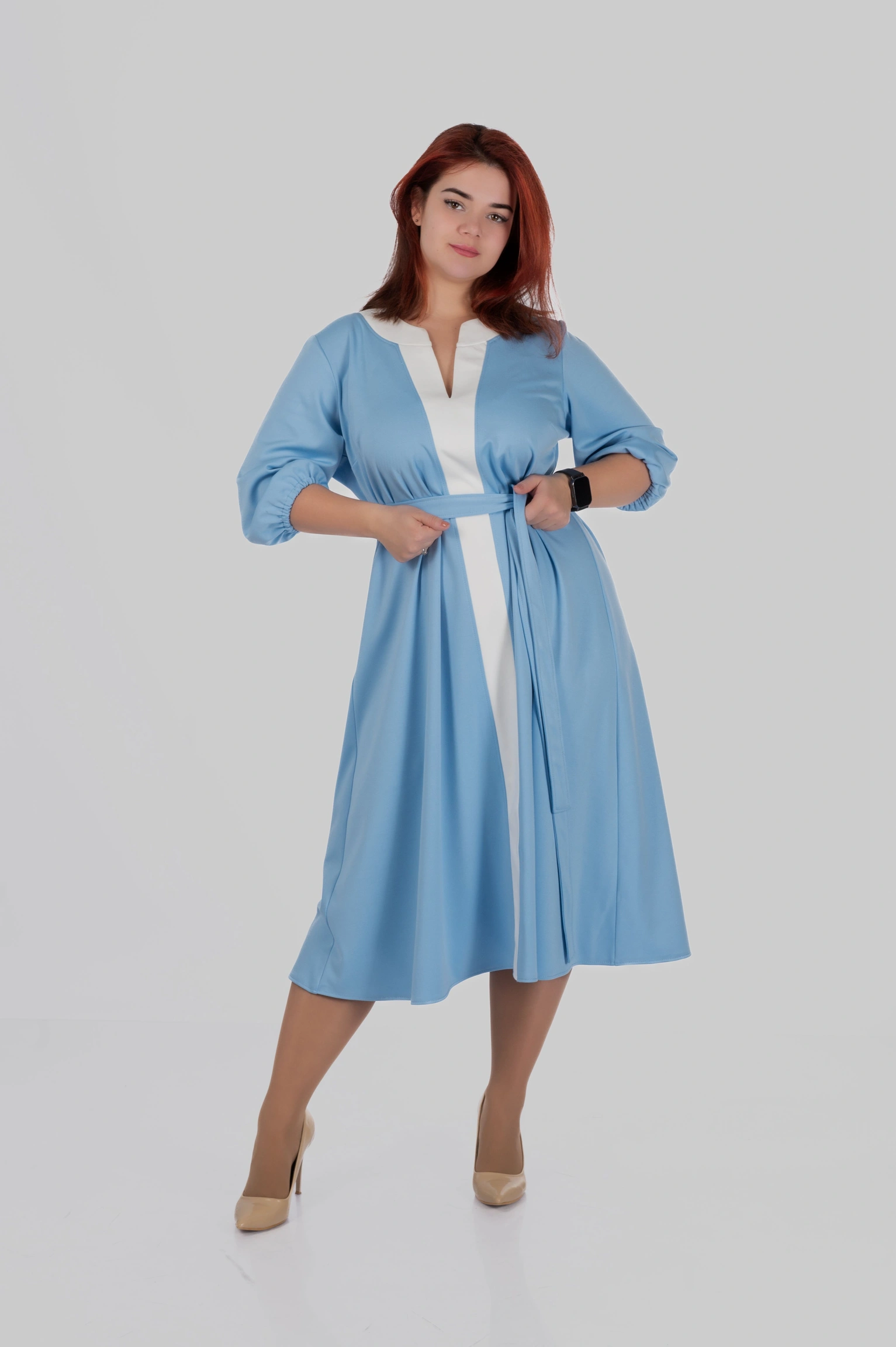 Продуманий крій моделі створений з урахуванням посадки для розмірів 50–64. Сукня формує витягнутий силует, виглядає легкою і елегантною та залишається комфортною протягом усього дня.