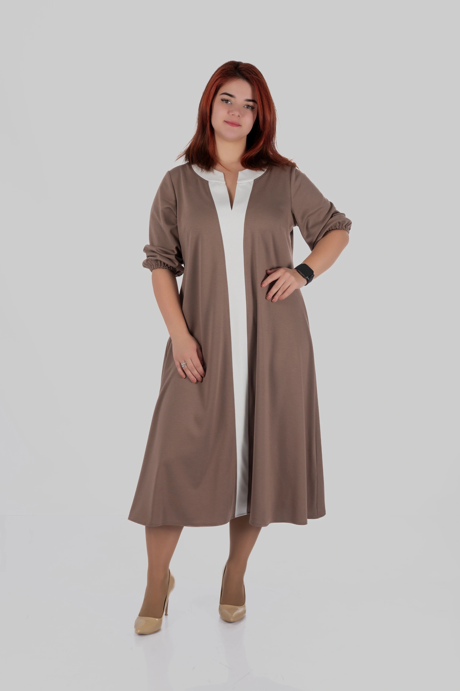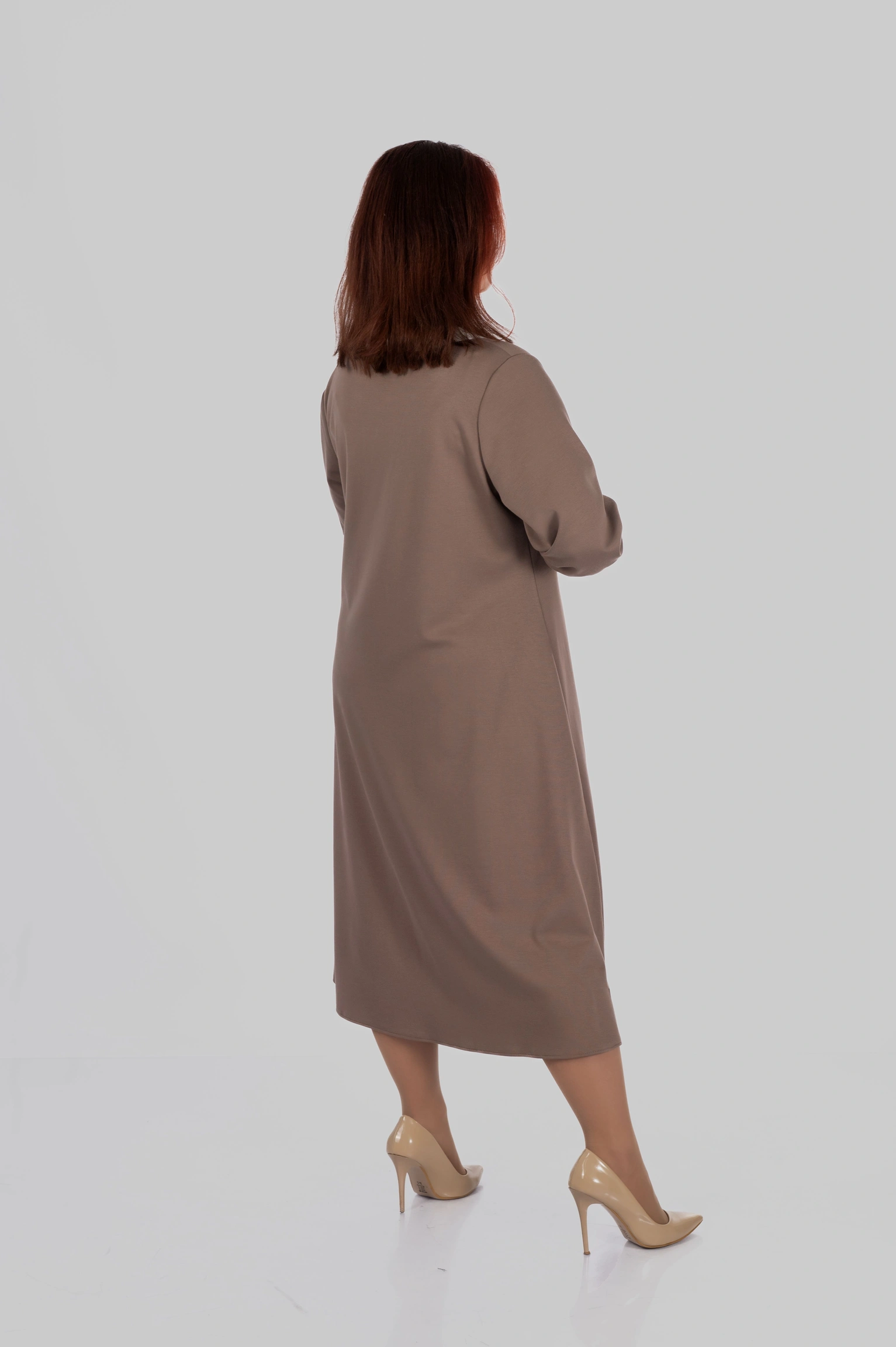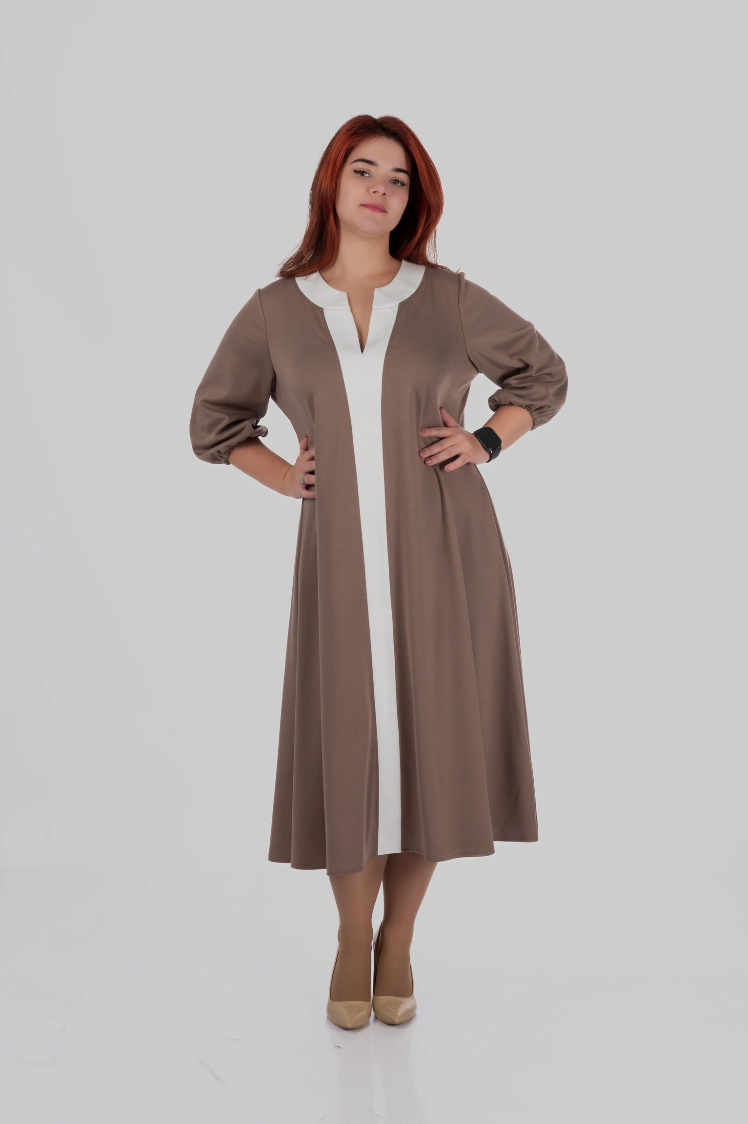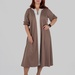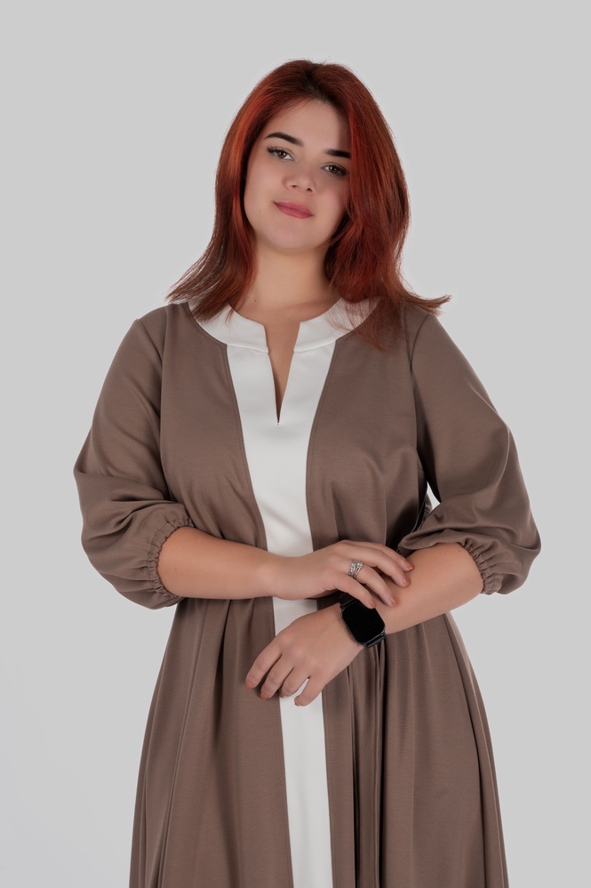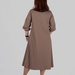 Округла горловина з декоративним вирізом створює витягнуту вертикаль у верхній частині силуету, а довжина міді робить модель універсальною для різних ситуацій — від повсякденних образів до більш елегантних стилізацій.
