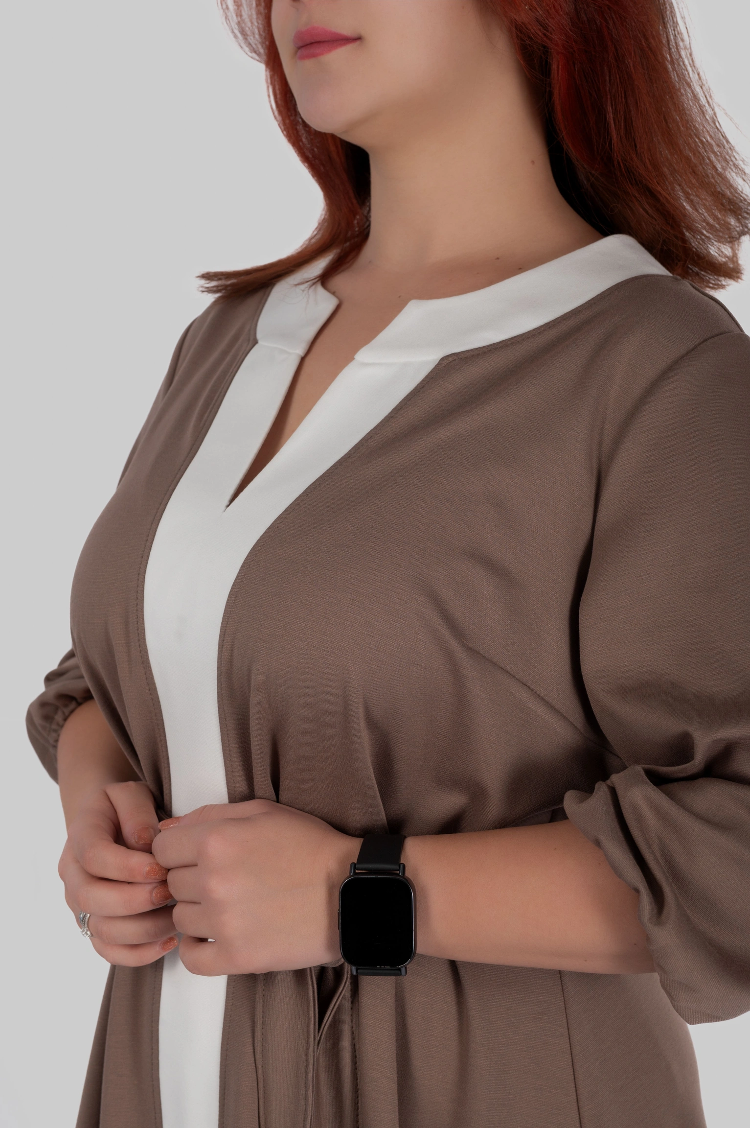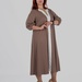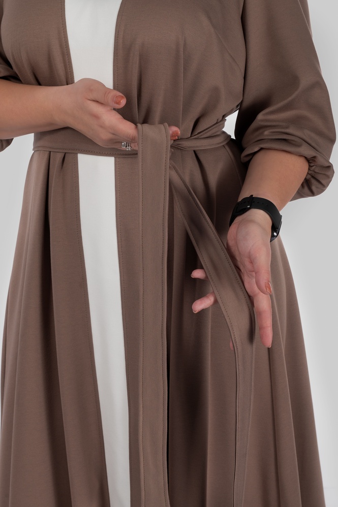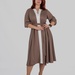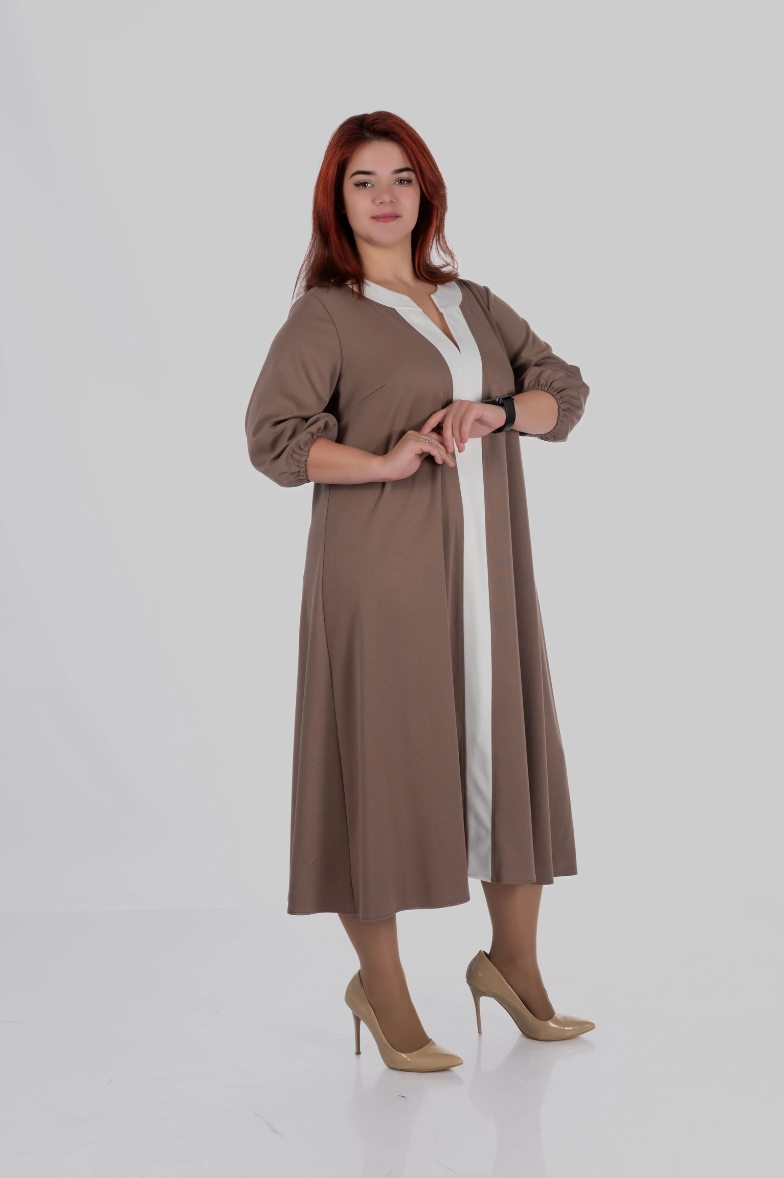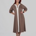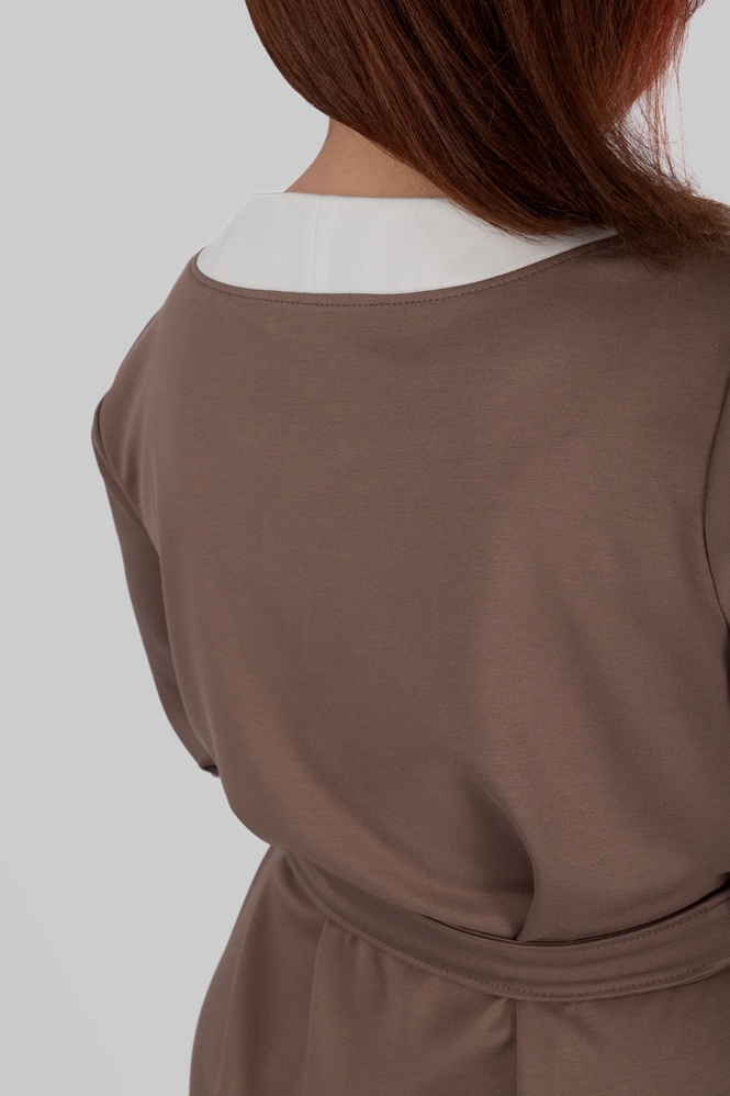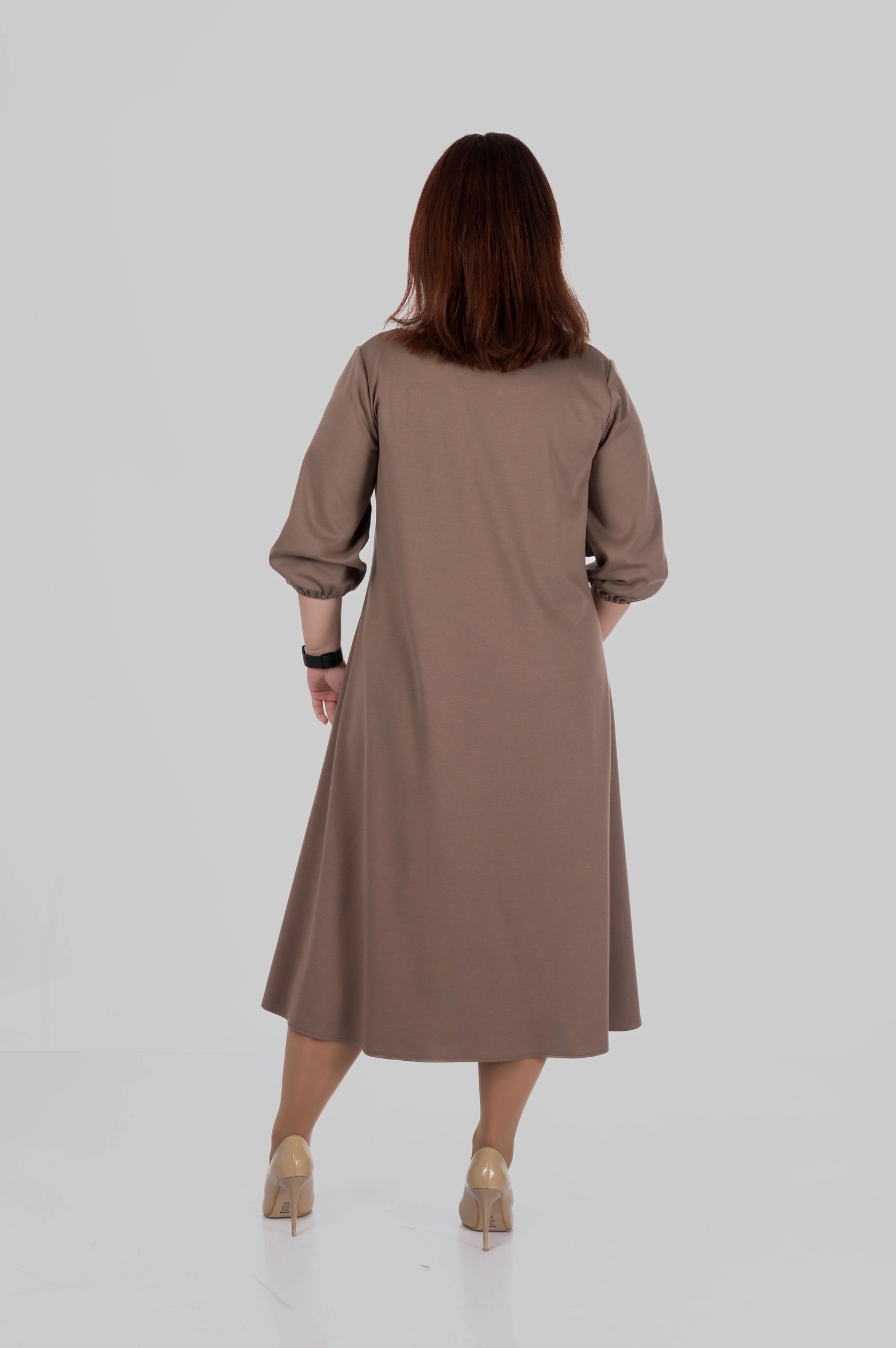Округла горловина з декоративним вирізом створює витягнуту вертикаль у верхній частині силуету, а довжина міді робить модель універсальною для різних ситуацій — від повсякденних образів до більш елегантних стилізацій.