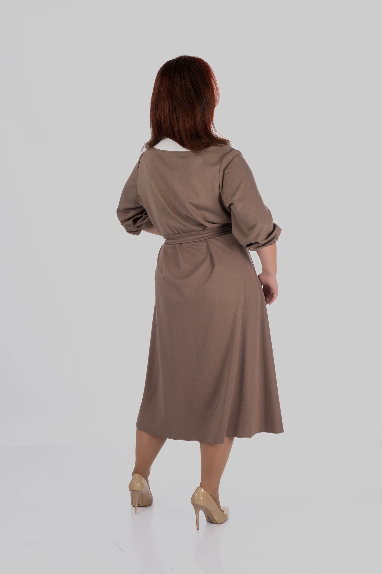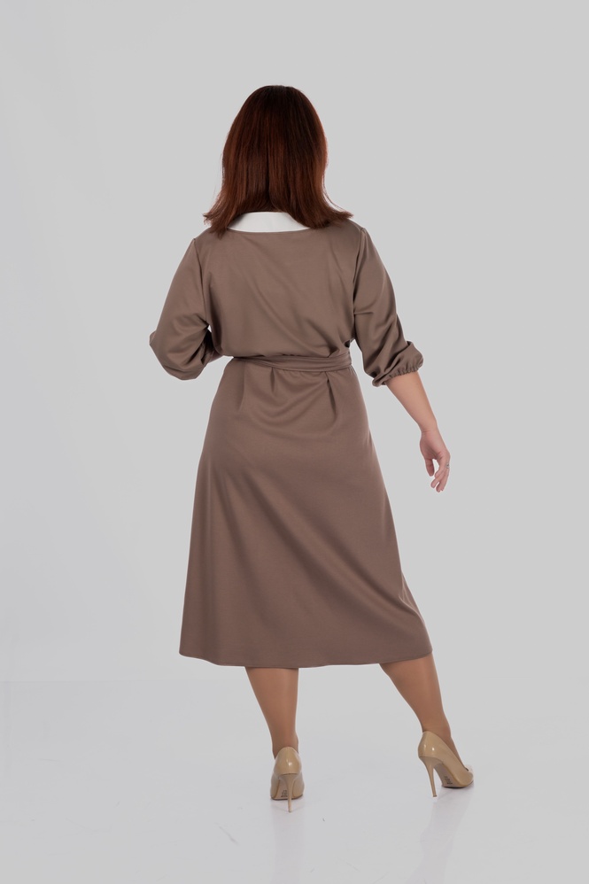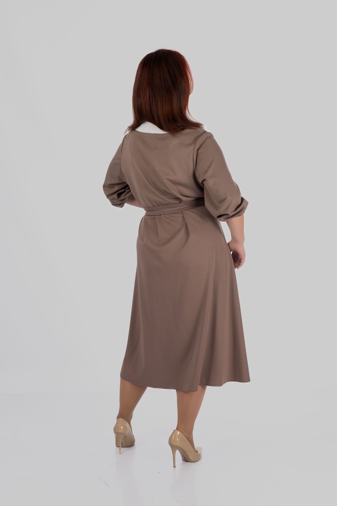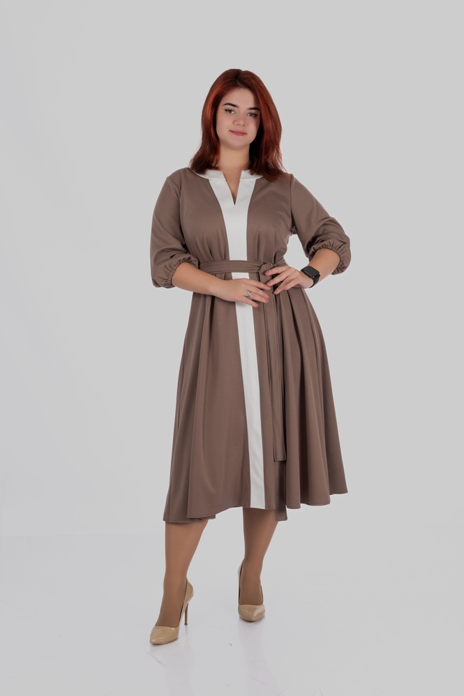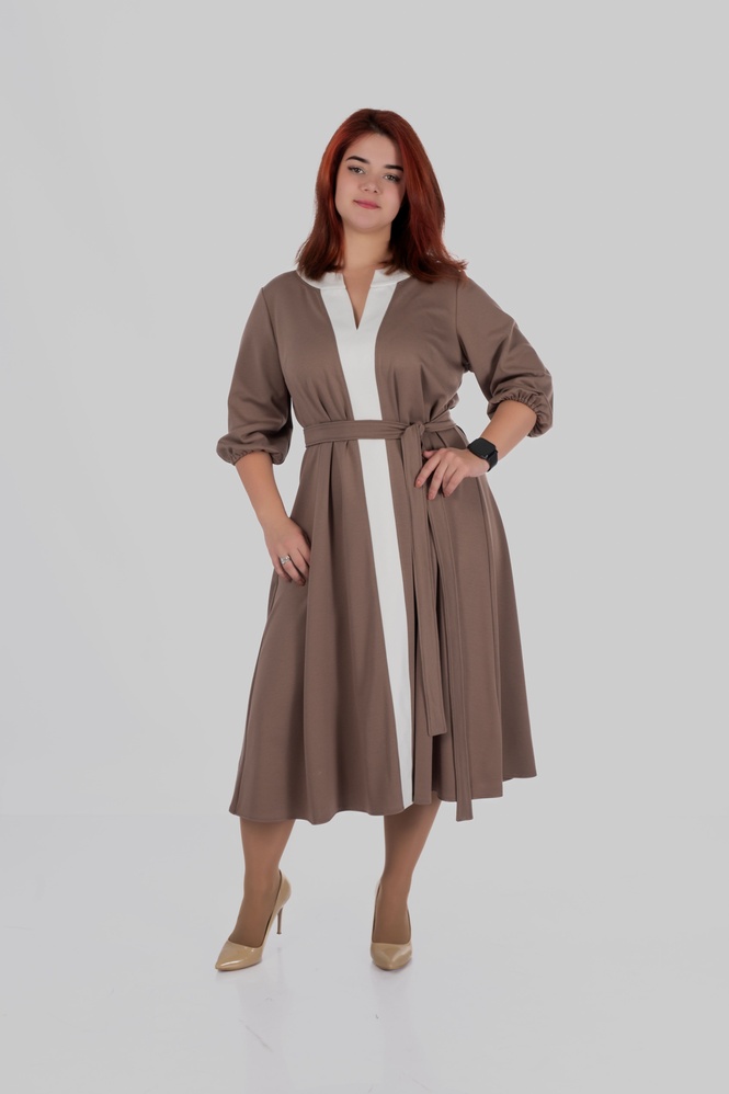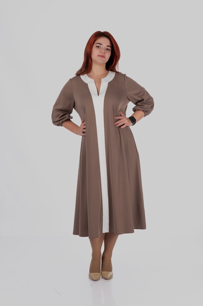 Продуманий крій моделі створений з урахуванням посадки для розмірів 50–64. Сукня формує витягнутий силует, виглядає легкою і елегантною та залишається комфортною протягом усього дня.